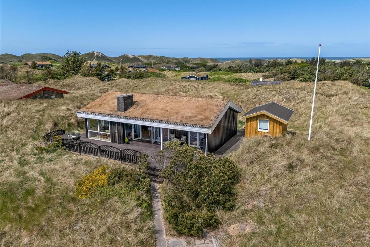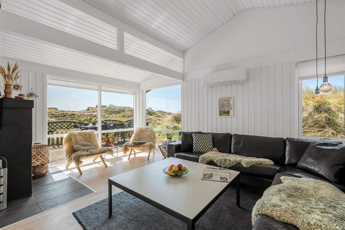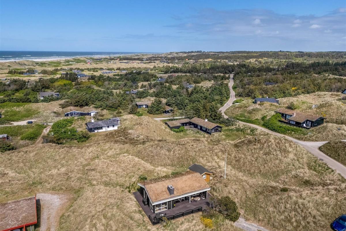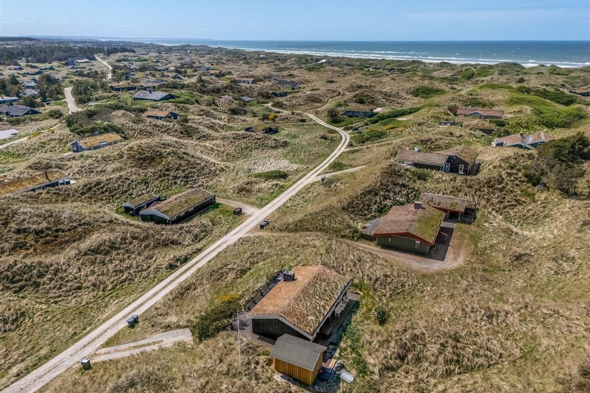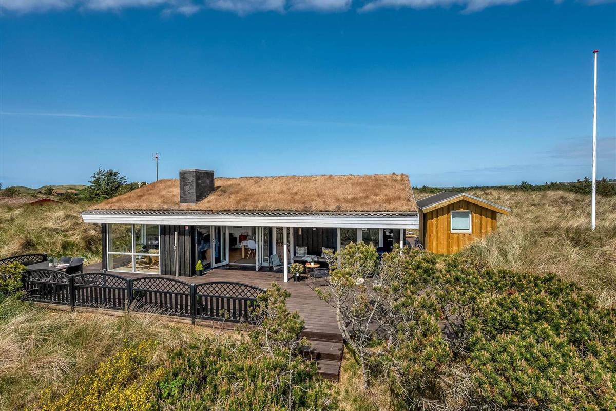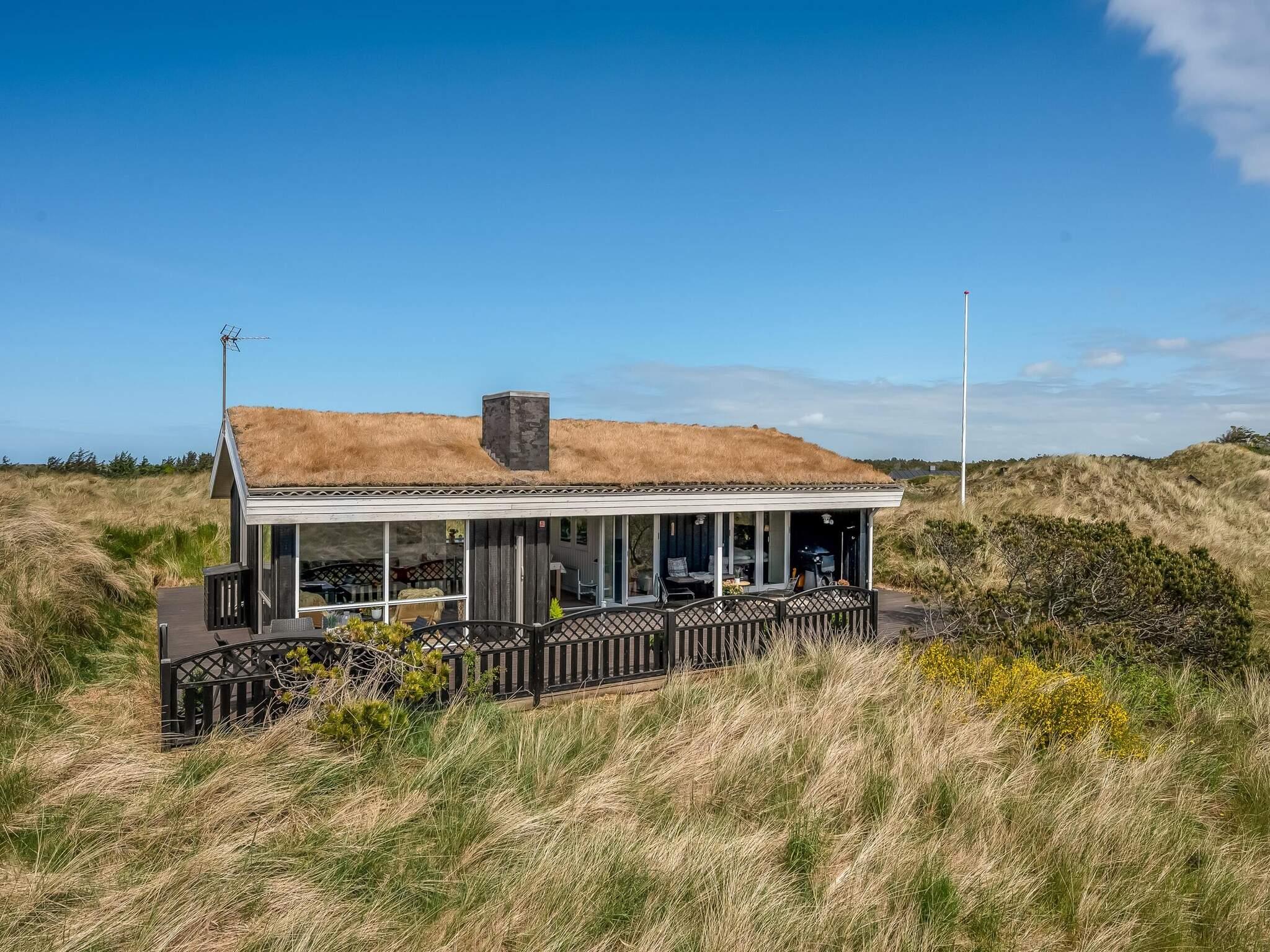 Udendørs venter flere gode terrasser – en stor, delvist overdækket terrasse mod syd og en mindre, åben terrasse mod øst, godt beskyttet af klitterne. Her kan du nyde sol, ro og feriestemning hele dagen. Om aftenen kan du tænde op i udepejsen og nyde det sidste lys, mens du lytter til Vesterhavets brusen i baggrunden."