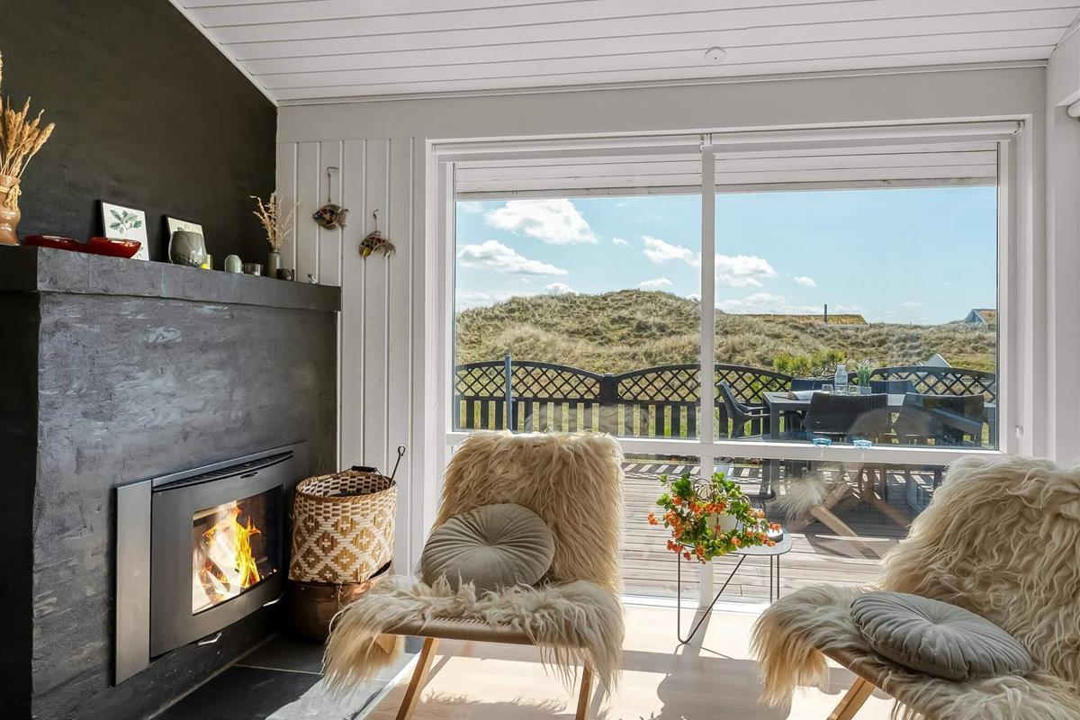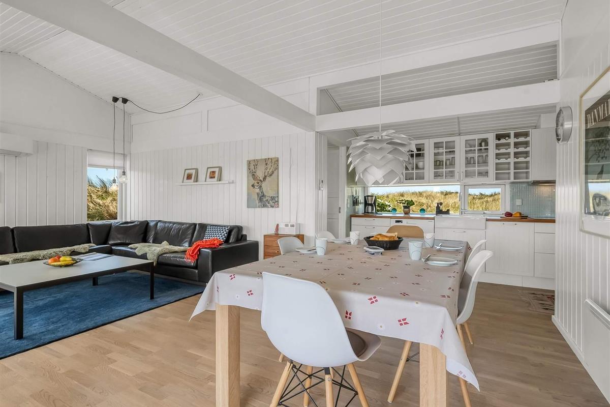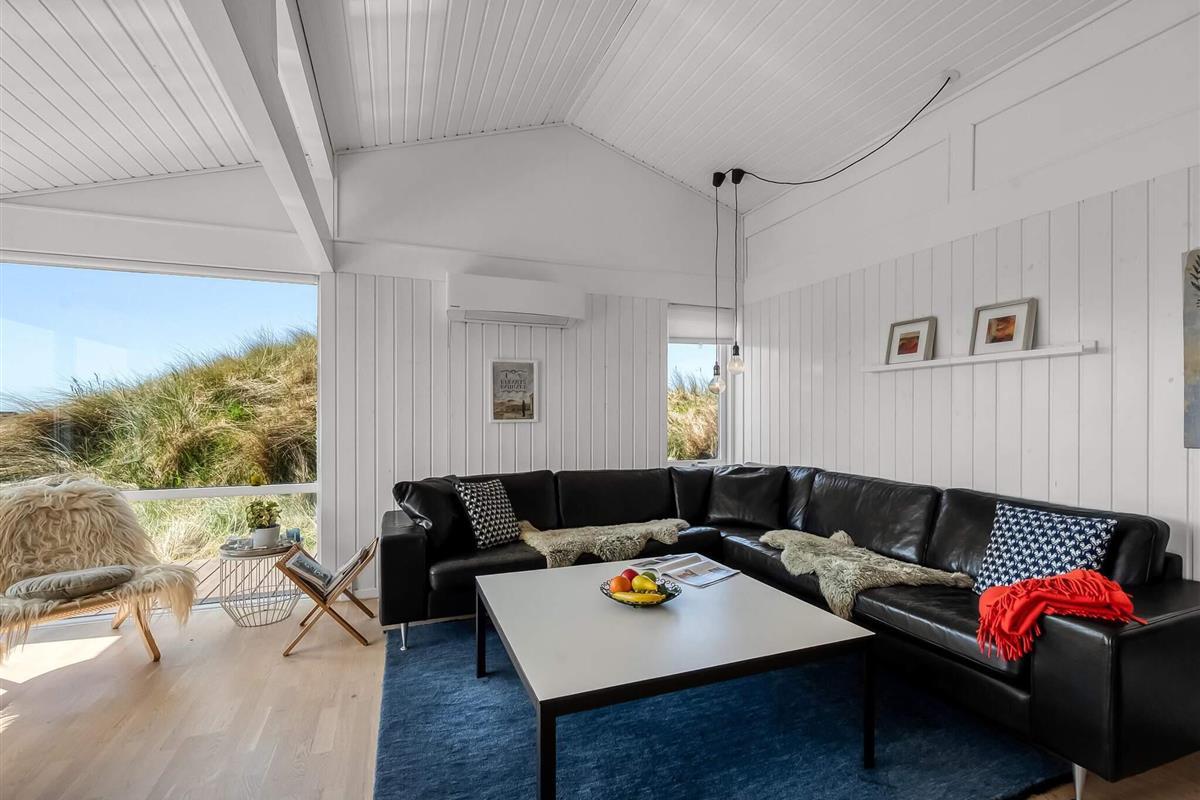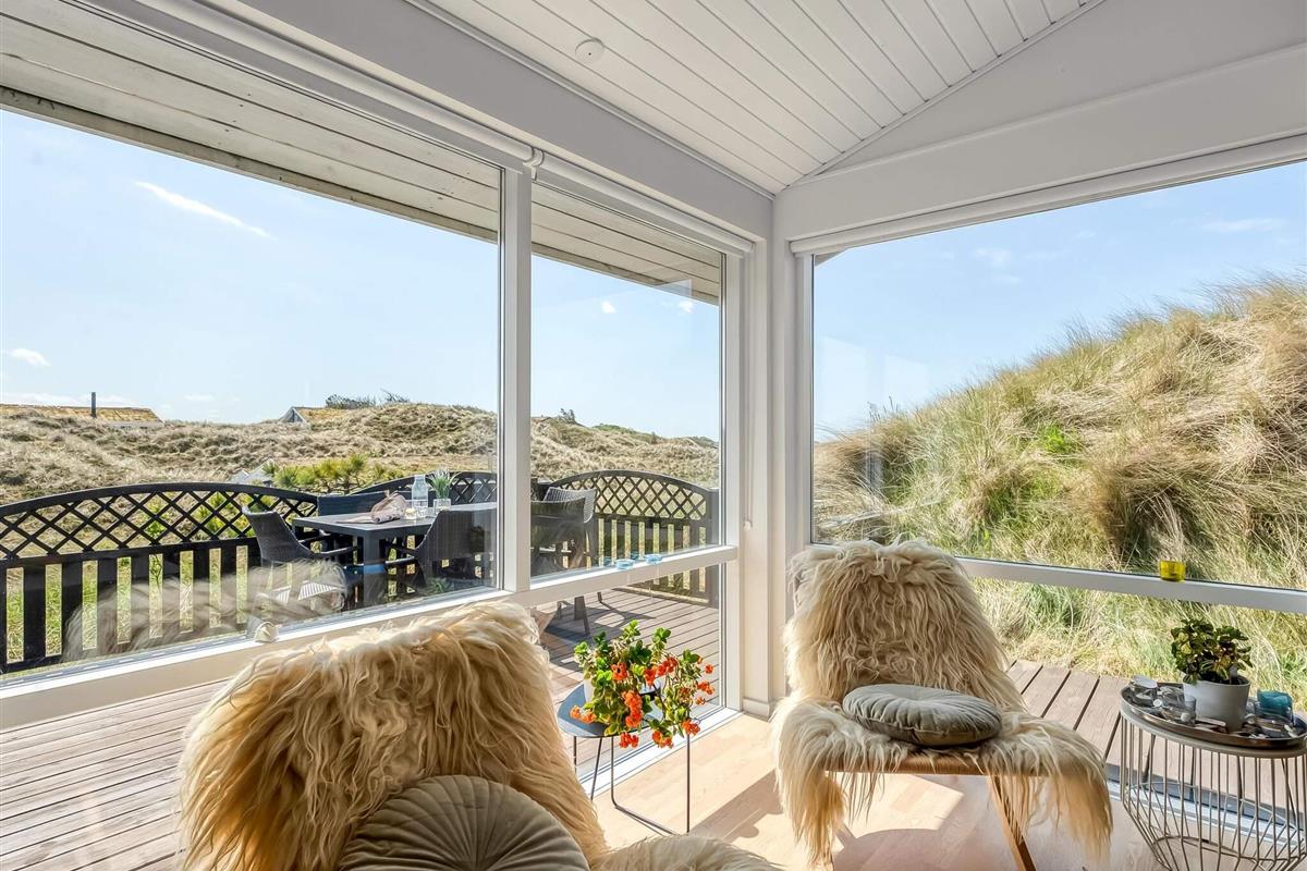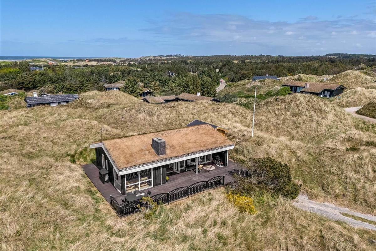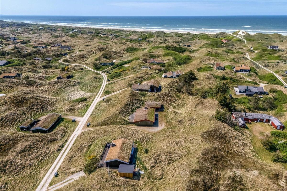 Udendørs venter flere gode terrasser – en stor, delvist overdækket terrasse mod syd og en mindre, åben terrasse mod øst, godt beskyttet af klitterne. Her kan du nyde sol, ro og feriestemning hele dagen. Om aftenen kan du tænde op i udepejsen og nyde det sidste lys, mens du lytter til Vesterhavets brusen i baggrunden."