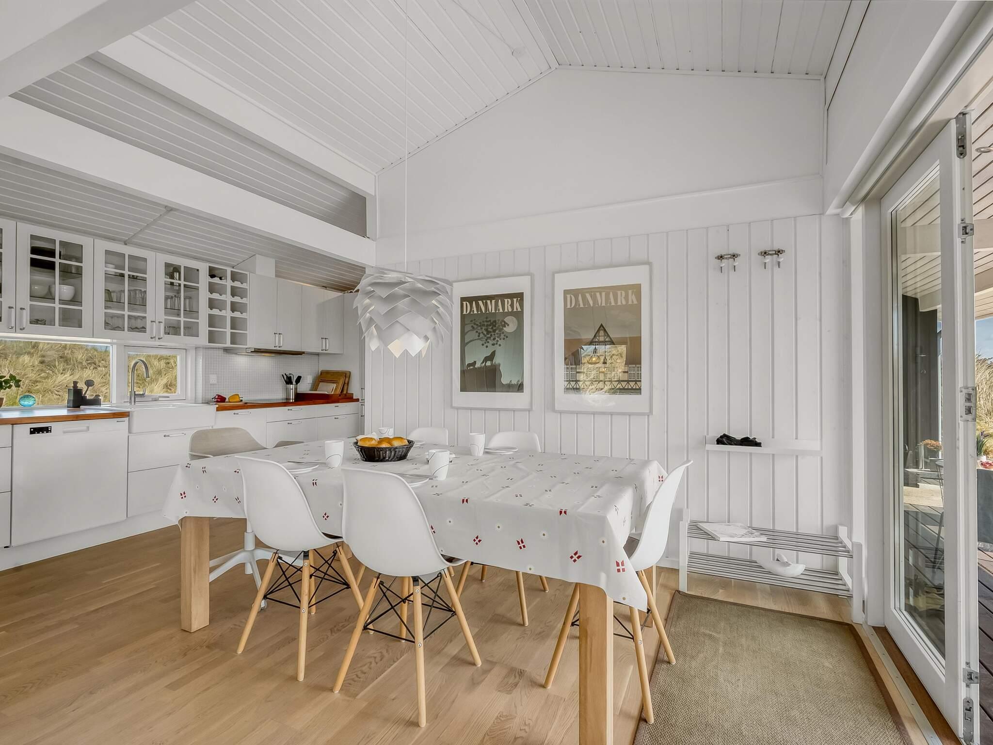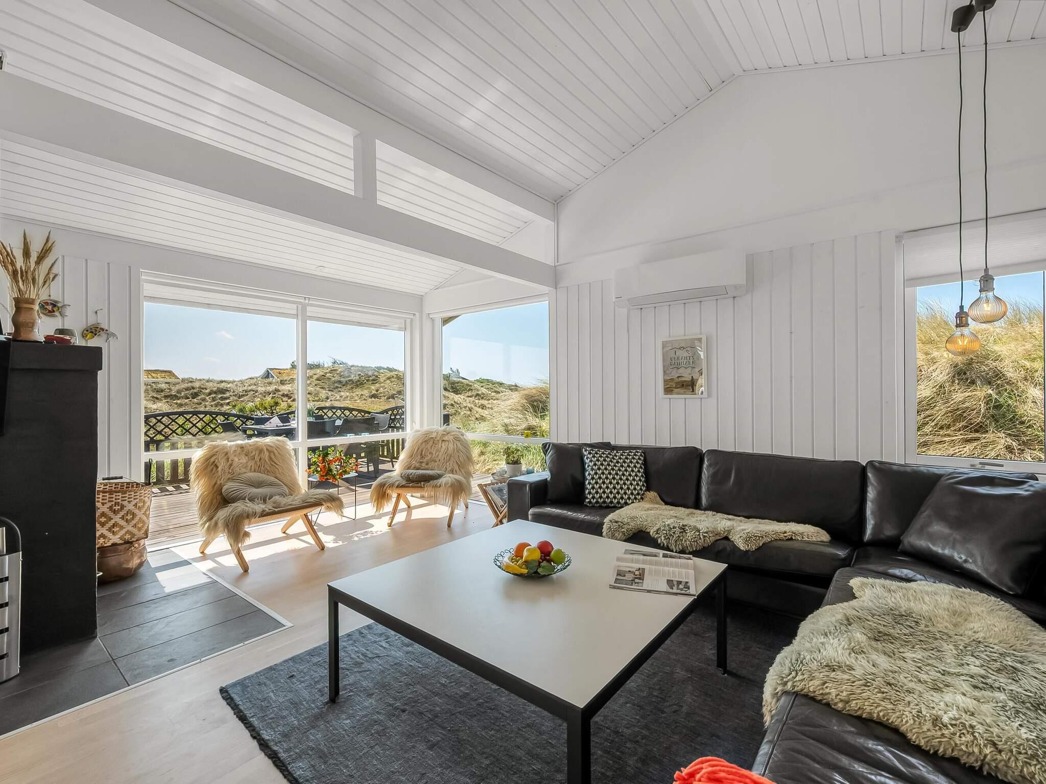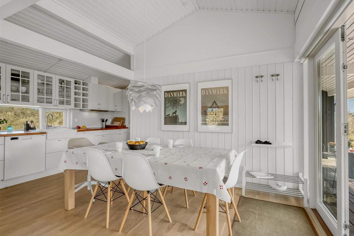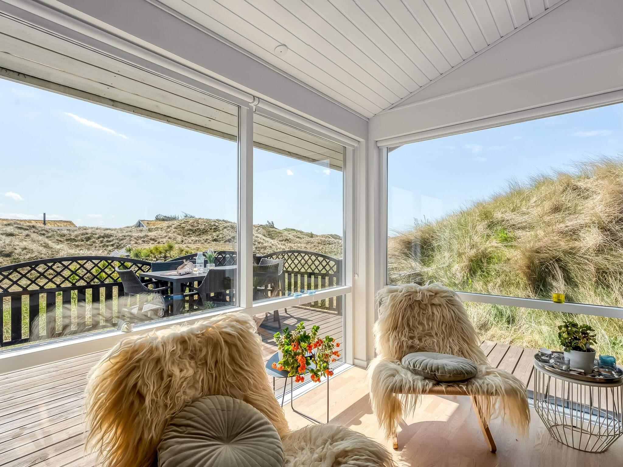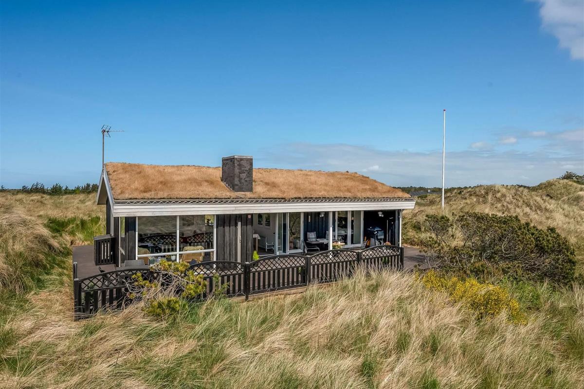Udendørs venter flere gode terrasser – en stor, delvist overdækket terrasse mod syd og en mindre, åben terrasse mod øst, godt beskyttet af klitterne. Her kan du nyde sol, ro og feriestemning hele dagen. Om aftenen kan du tænde op i udepejsen og nyde det sidste lys, mens du lytter til Vesterhavets brusen i baggrunden."