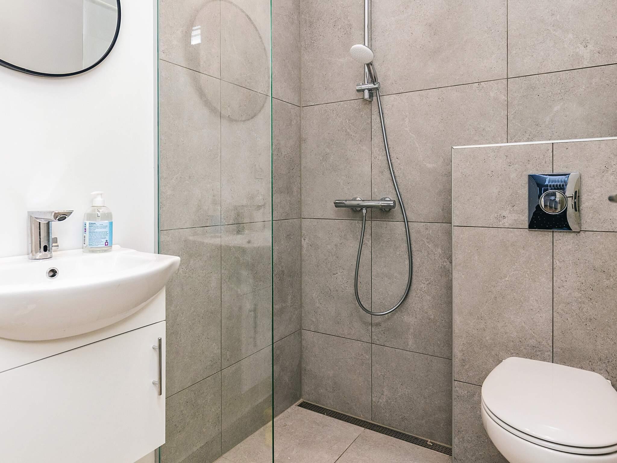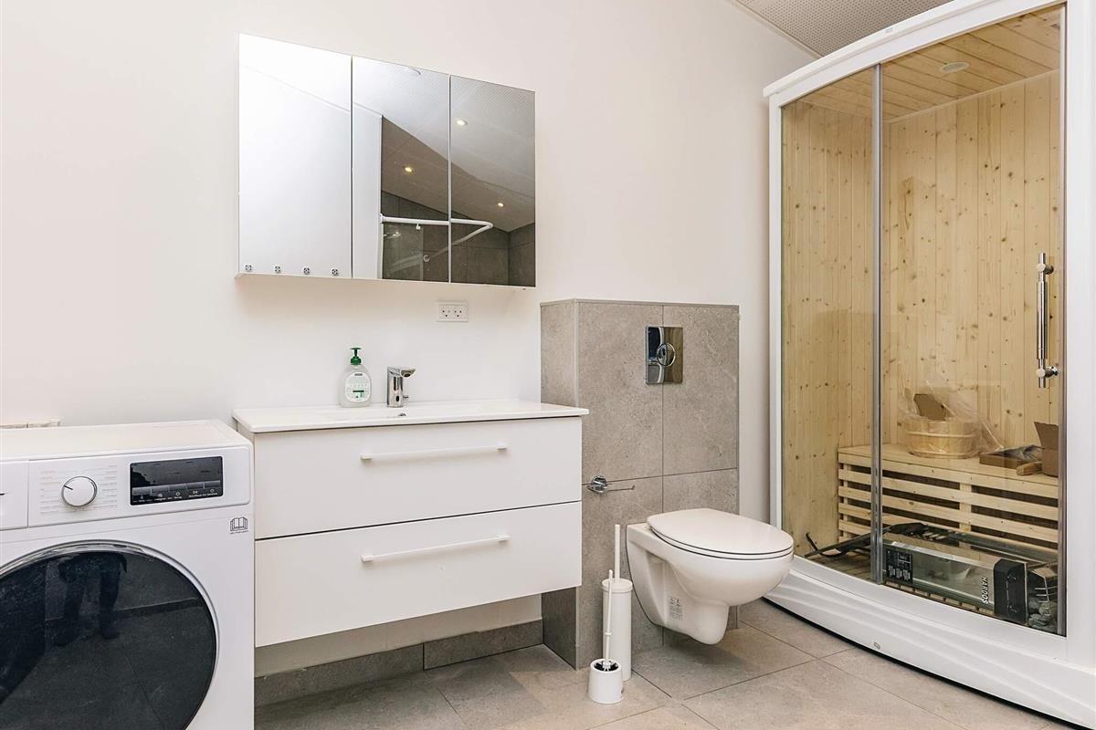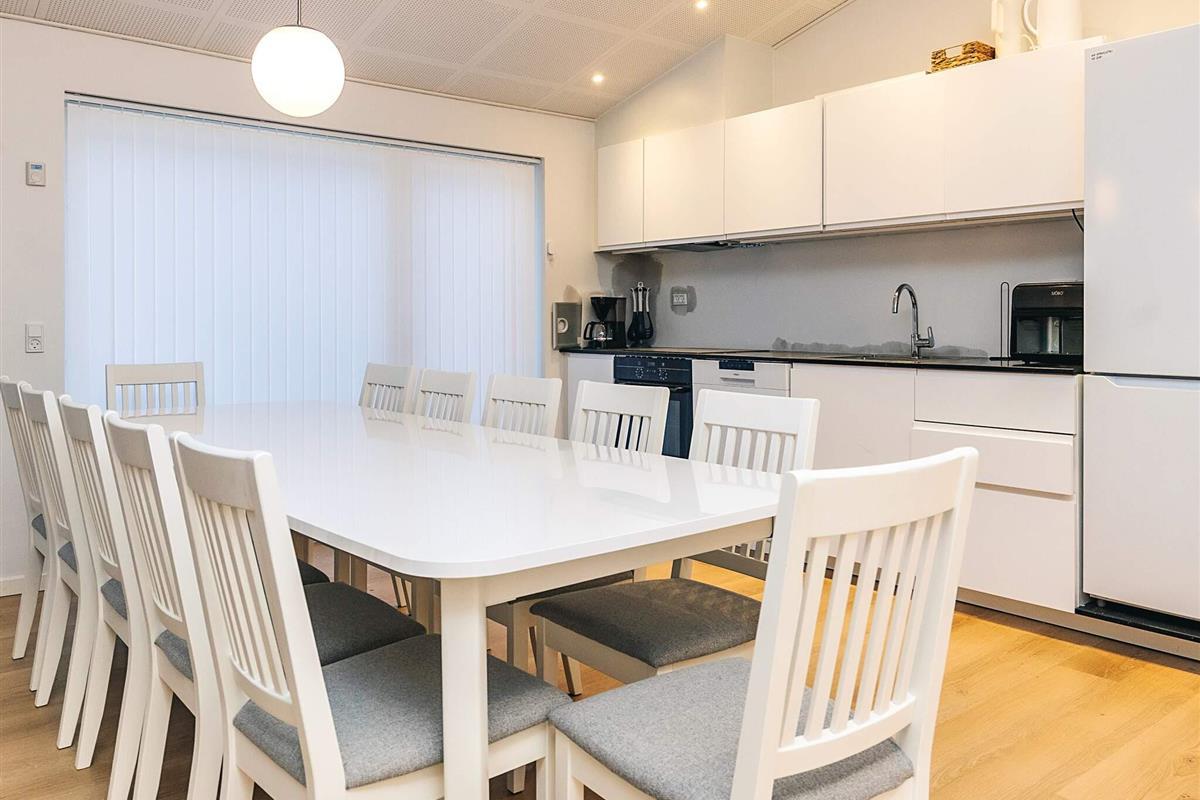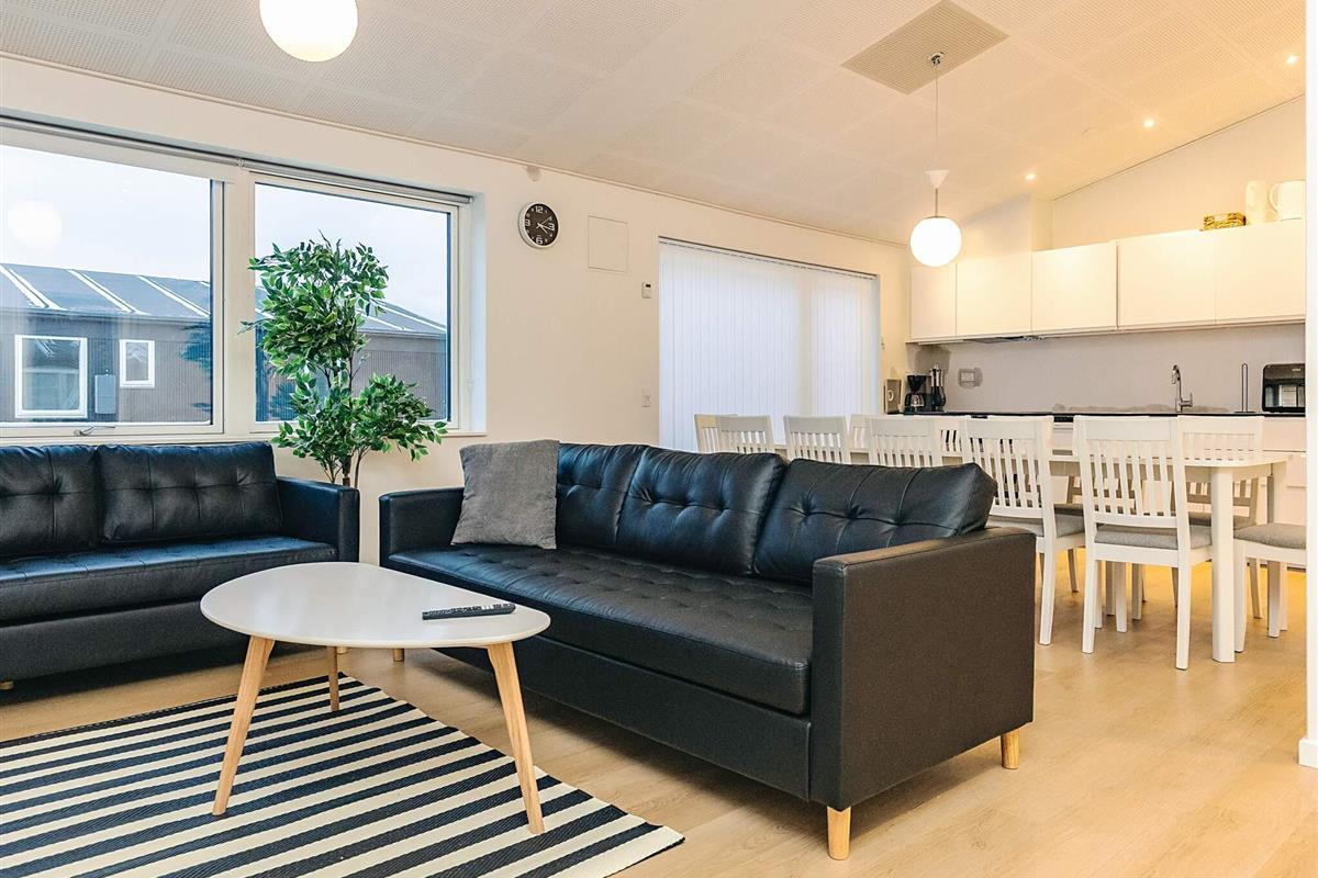 Im Inneren empfängt Sie ein stilvolles, skandinavisches Interieur, das Licht, Luft und Komfort vereint. Machen Sie es sich am großen Esstisch gemütlich, wo man gemeinsam isst und sich unterhält, oder entspannen Sie sich mit einem Buch oder Strickzeug auf dem Sofa. Auch der Fernseher sorgt für Unterhaltung. Durch die großen Fenster strömt Tageslicht herein und schafft eine ganz besondere Atmosphäre im Wohnzimmer. Das Ferienhaus verfügt zudem über eine große Wohnküche, drei Schlafzimmer, zwei Badezimmer und einen Mehrzweckraum.