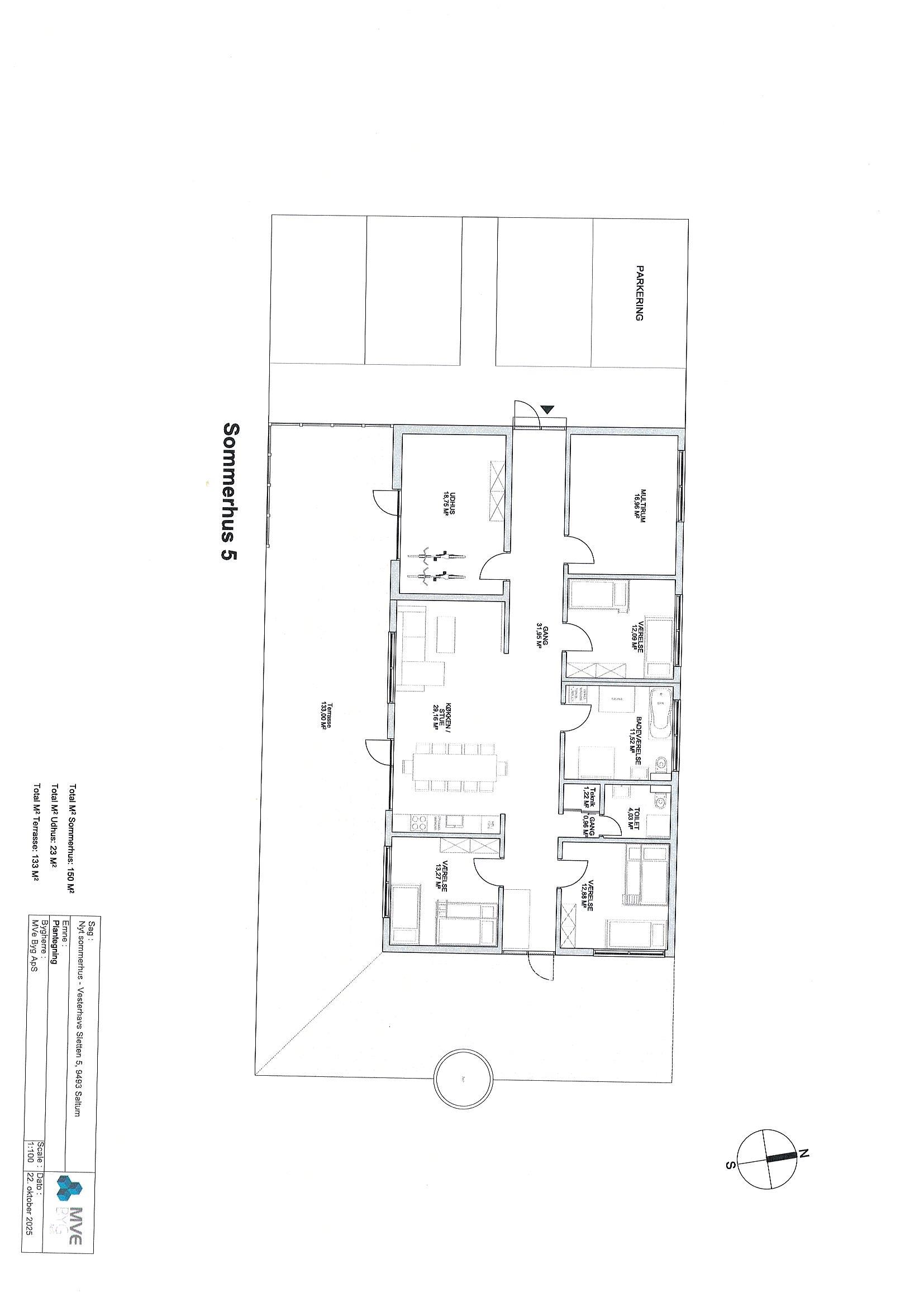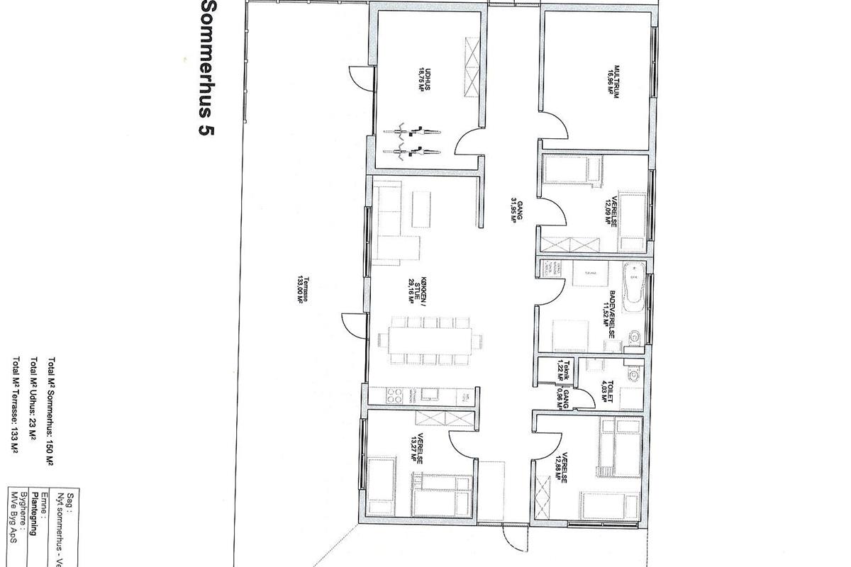 Husets indretning er stort køkken/alrum, 3 værelser, 2 badeværelser og et multirumsrum.