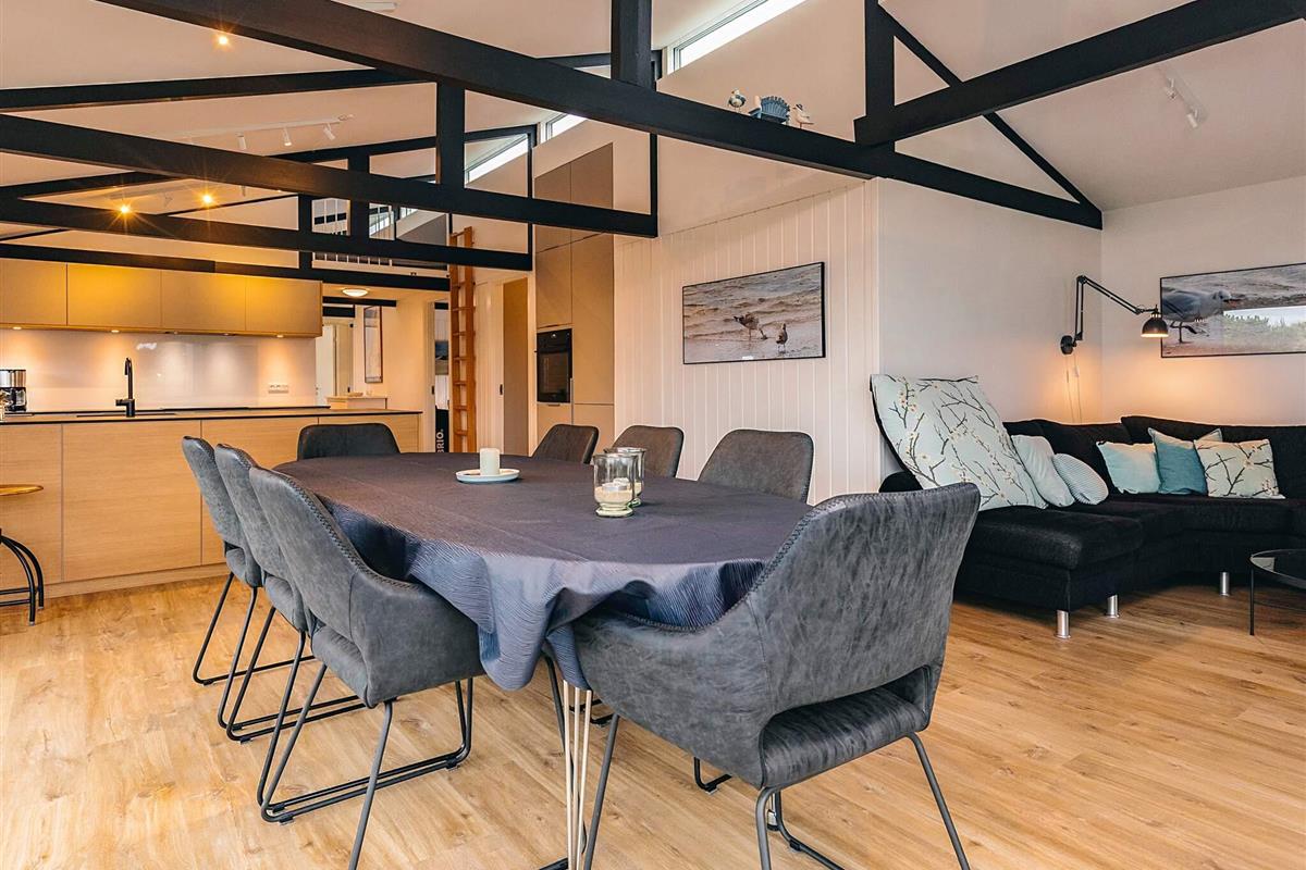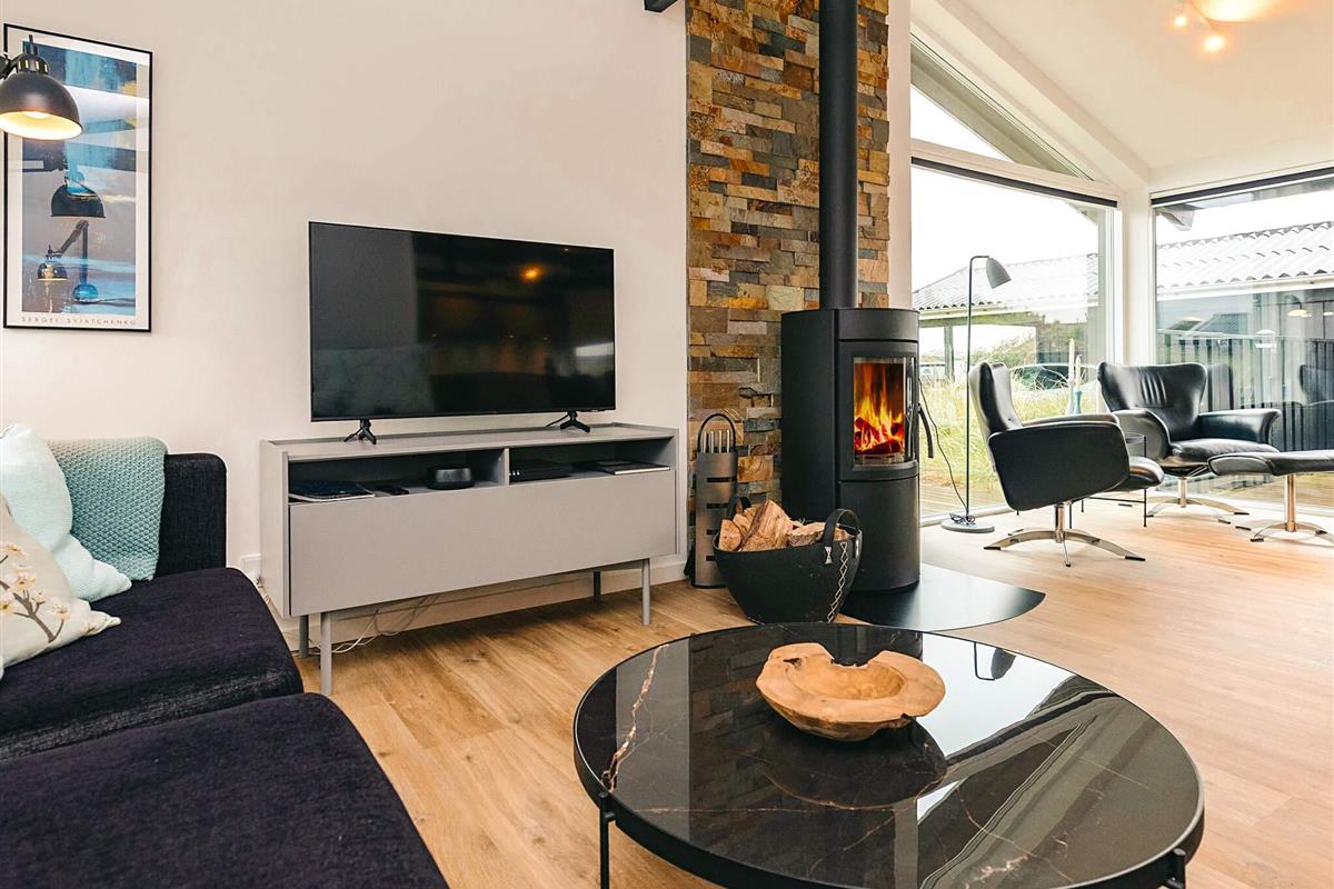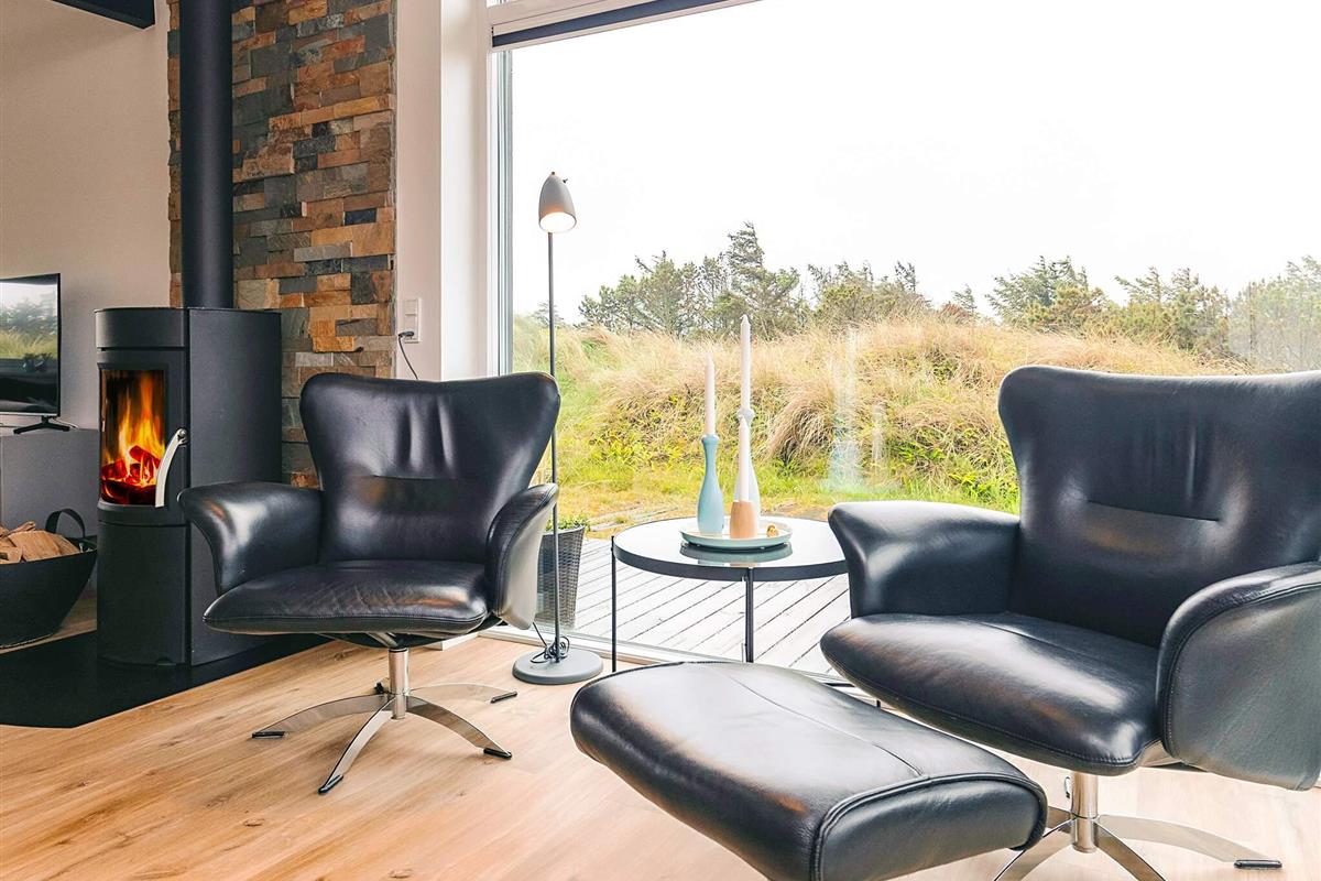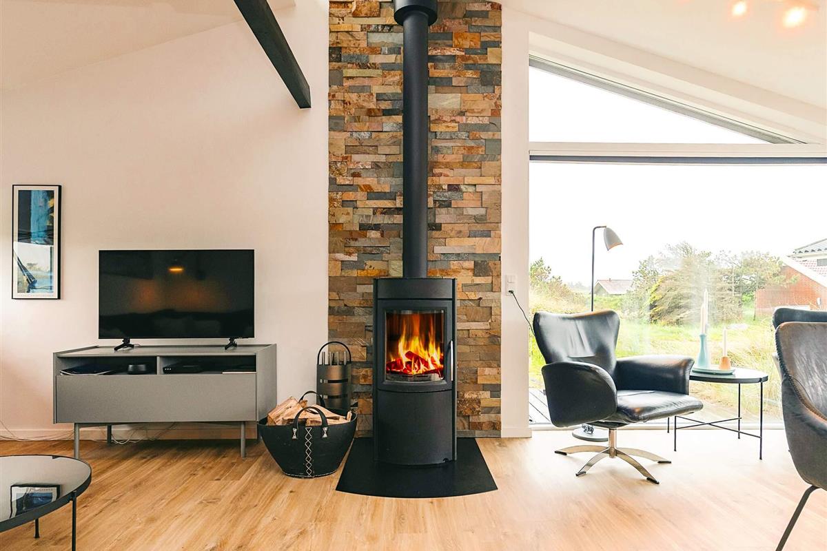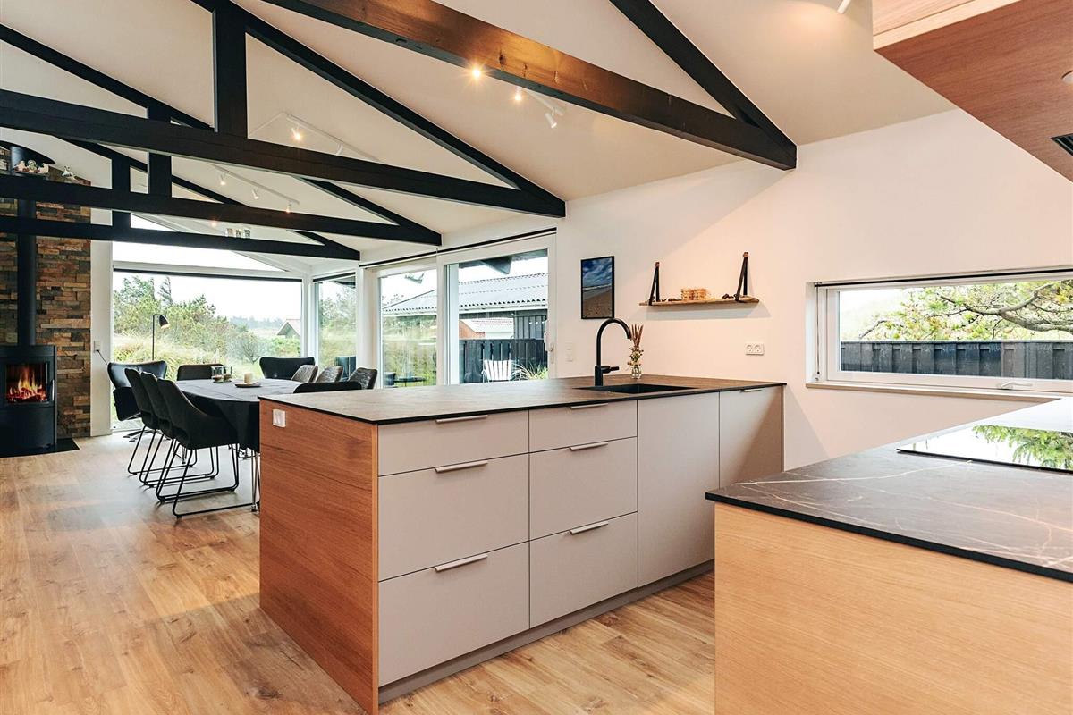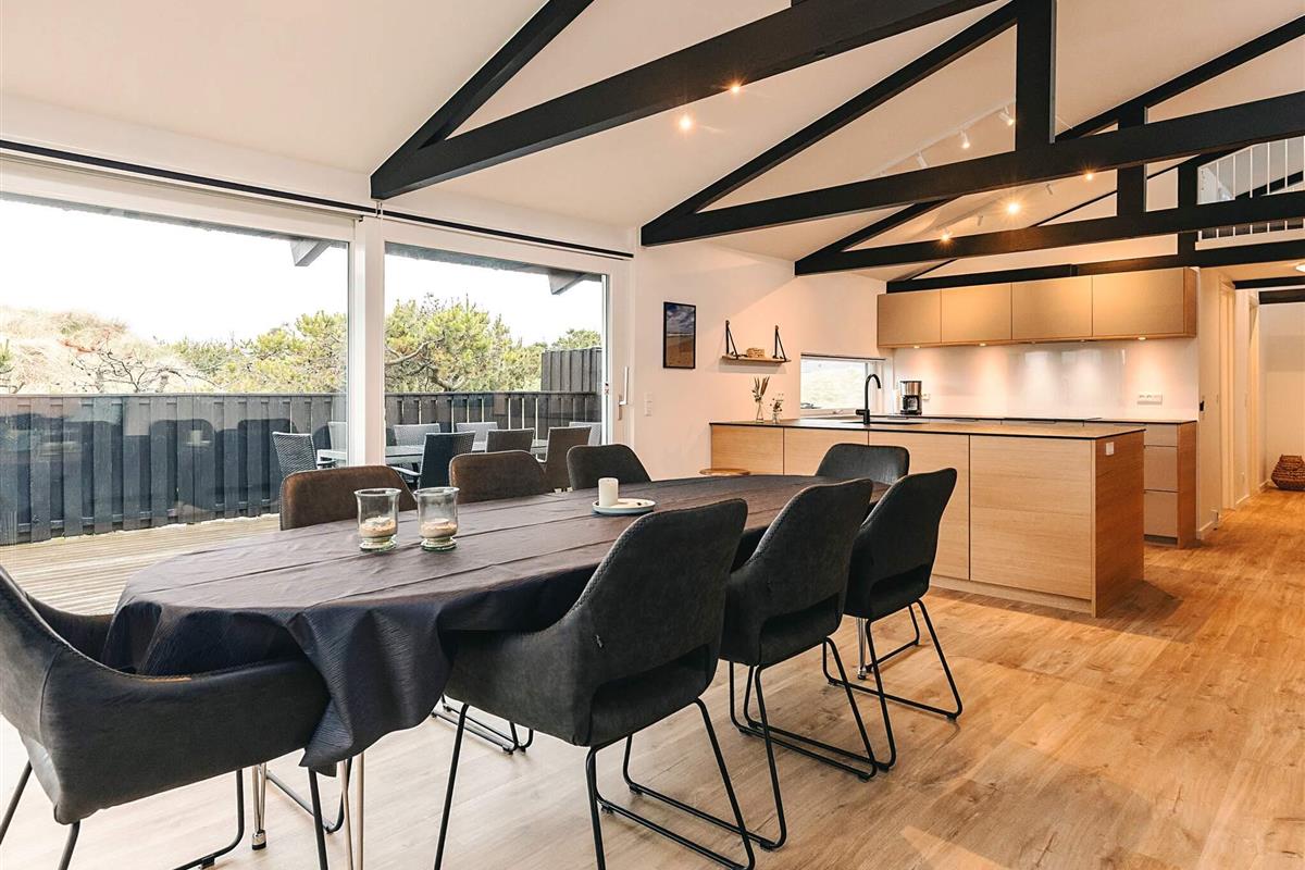 Die Lage ist erstklassig. Obwohl sich weitere Ferienhäuser in der Umgebung befinden, bietet das Haus dank seiner idyllischen Lage, inmitten von Dünen und Natur, absolute Privatsphäre und Ruhe. Der helle und moderne Innenbereich besticht durch eine offene Küche mit Essbereich, die direkt in das Wohnzimmer übergeht. Der zentral platzierte Kaminofen sorgt für Gemütlichkeit und Wärme im ganzen Haus.