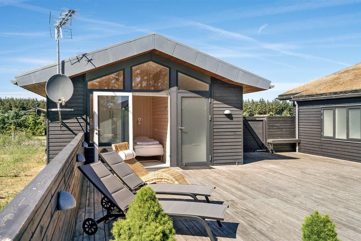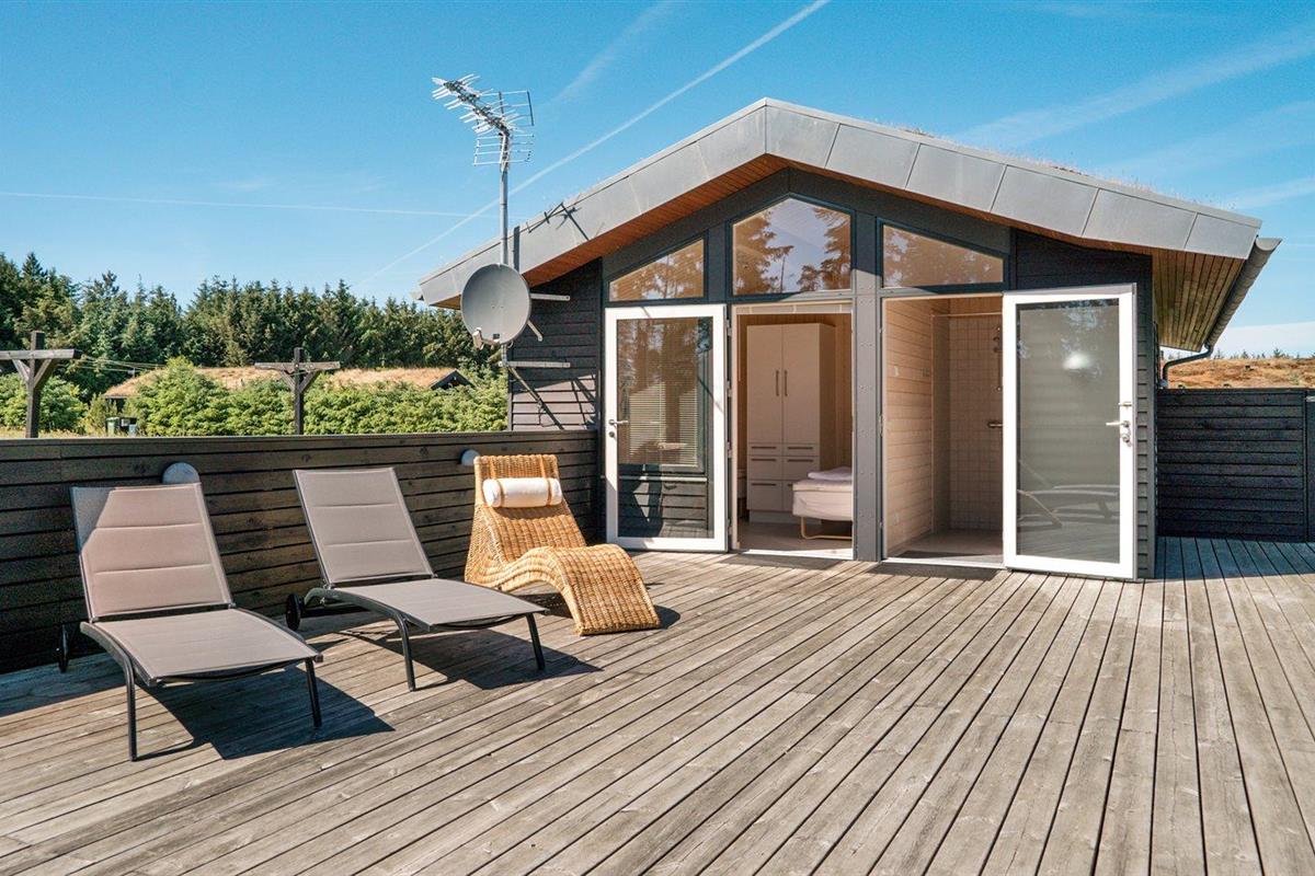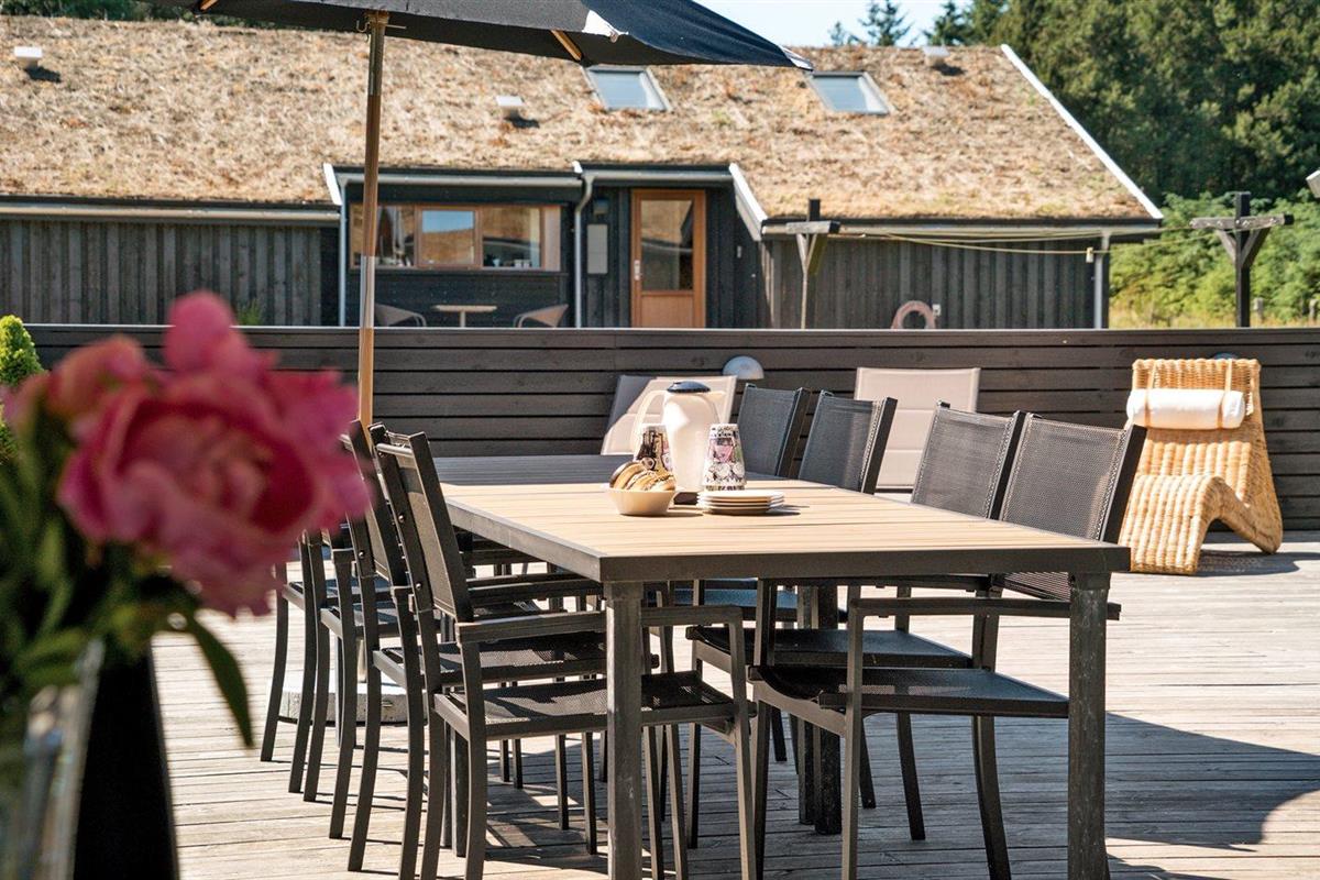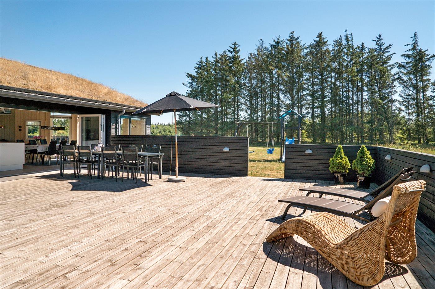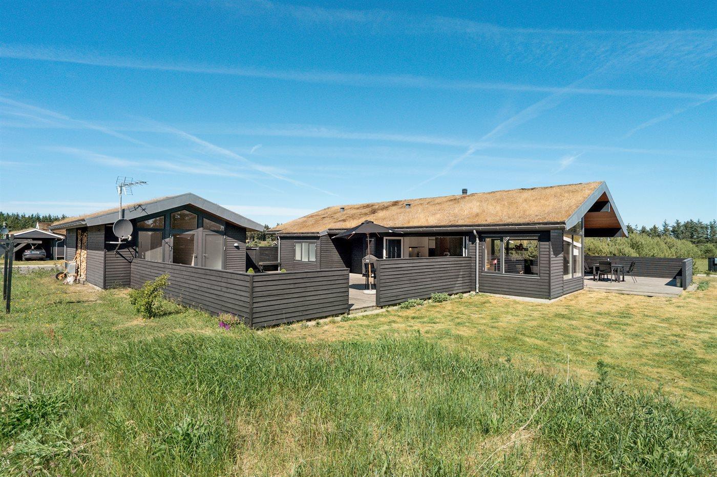 De vakantiewoning is gelegen op een 2600 m² groot aangelegde tuin. Afstand tot de zee 1400 m. Dichtstbijzijnde winkel 3800 m. Bij de vakantiewoning hoort 150 m² terras. Daarnaast is er een 18 m² groot overdekt terras. Gereedschapsruimte. Schommel. Zandbak. Glijbaan. Voetbaldoel.Vuurplaats. Parkeerplaats bij het huis.