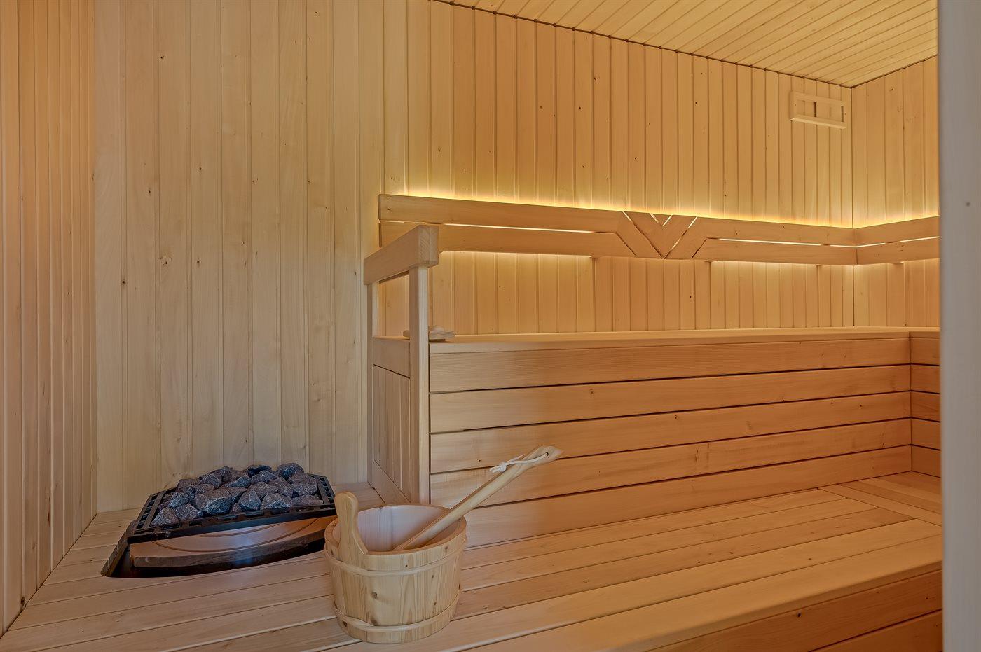 Er is 3 badkamers met douchehok en 3 toiletten. Er is vloerverwarming in 2 van de badkamers. De sauna biedt de gelegenheid tot ontspanning.