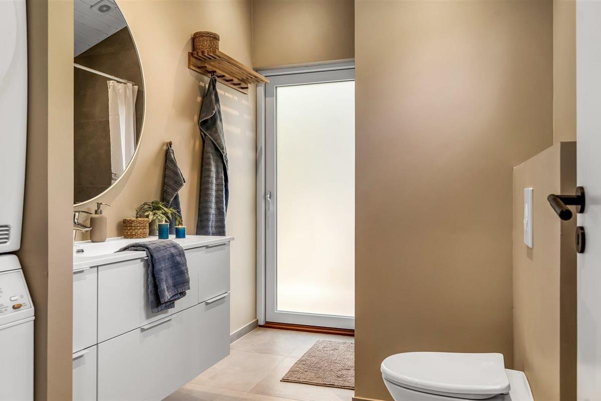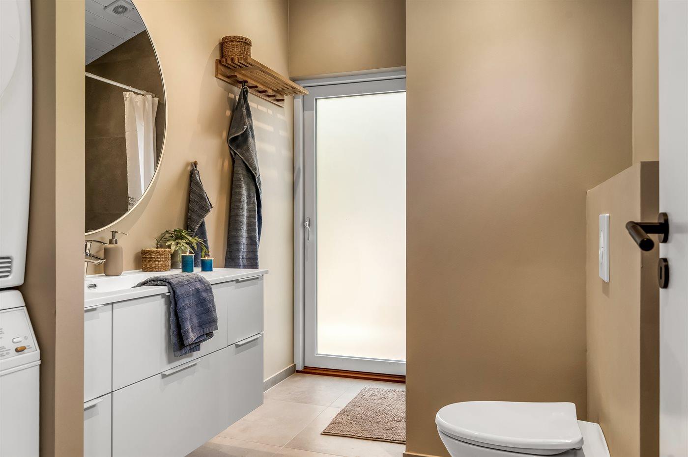 Er is 1 badkamer met douchehok en 2 toiletten, waarvan 1 gastentoilet. Er is vloerverwarming in 1 badkamer. Er is vloerverwarming in het gastentoilet.