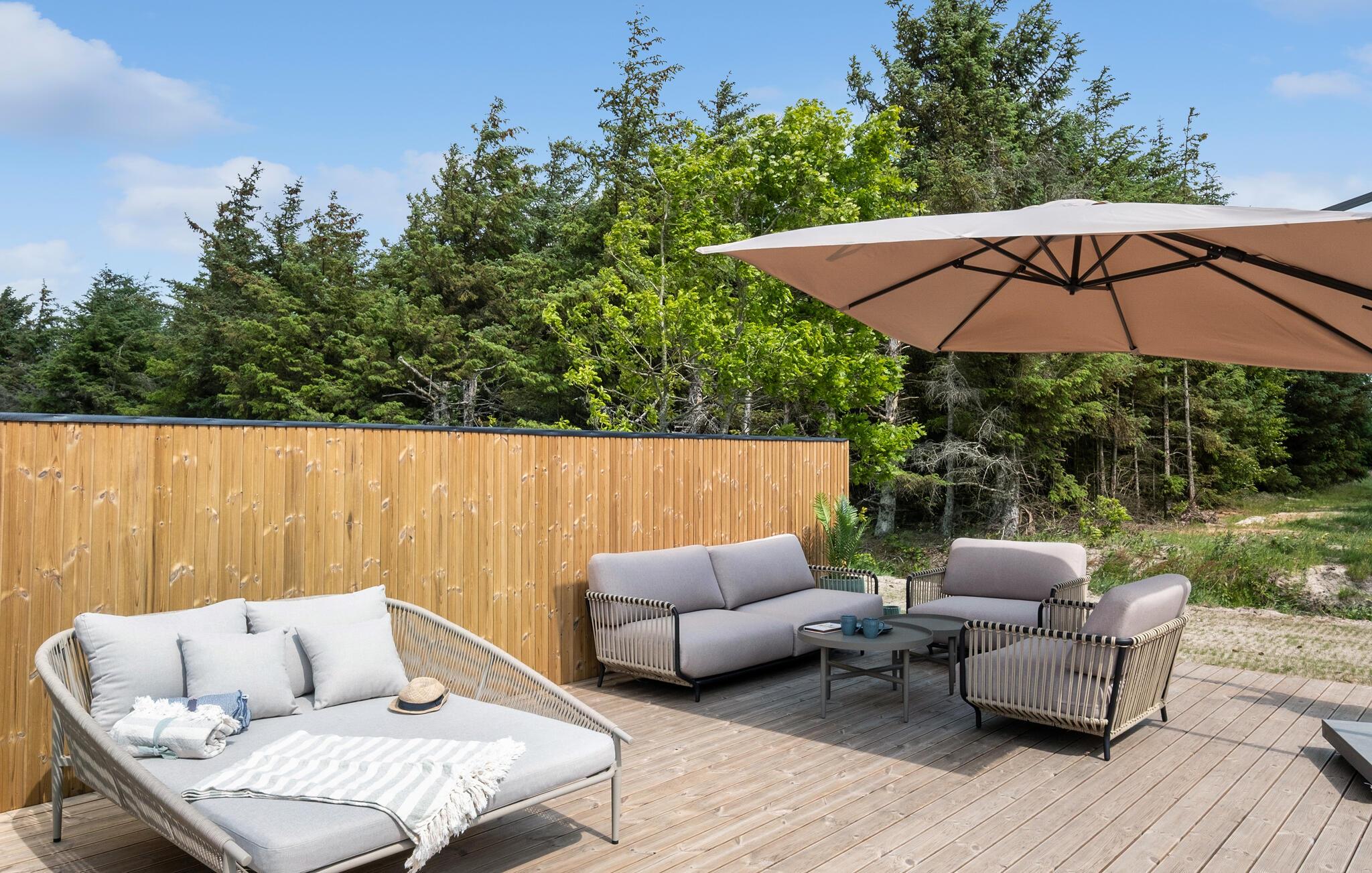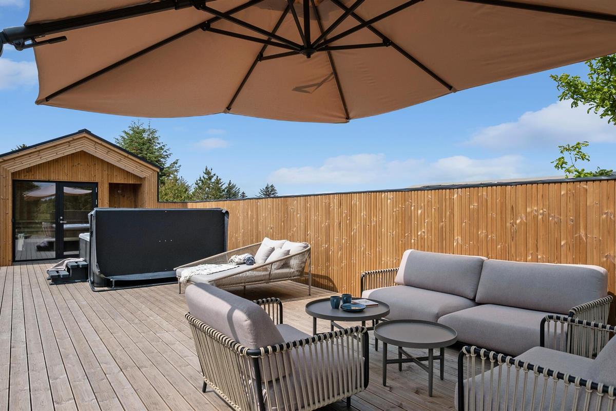 Het open terras nodigt uit tot wandelen op blote voeten en biedt pure ontspanning in de buitenlucht. Geniet van de zon op het ligbed, trakteer jezelf op gezellige momenten in de whirlpool en ontspan in de sauna na een lange tocht. Laat je kinderen lekker spelen op het ruime gazon en vier jullie tijd samen met een barbecue.