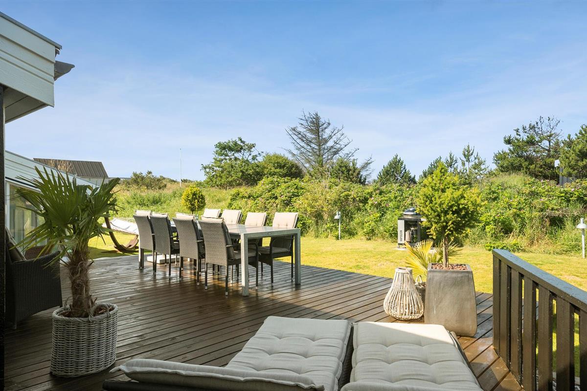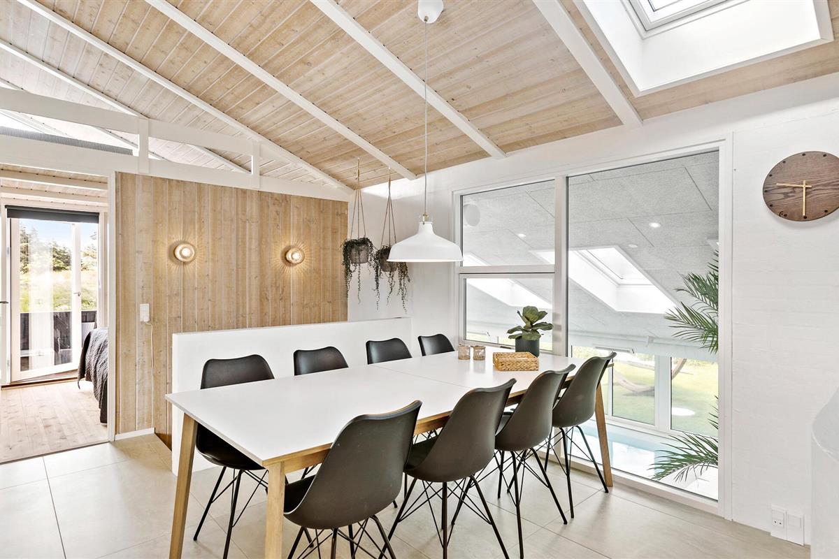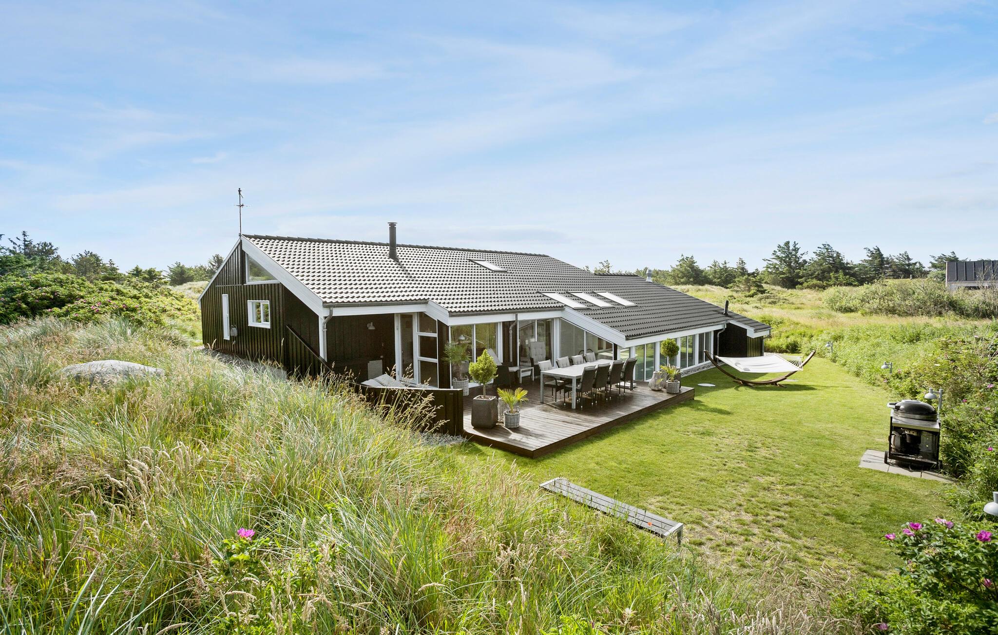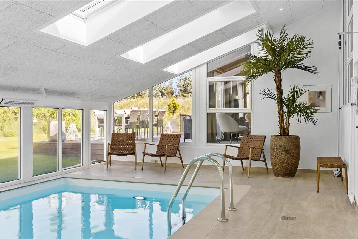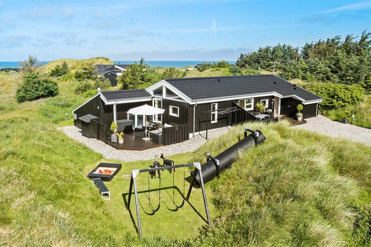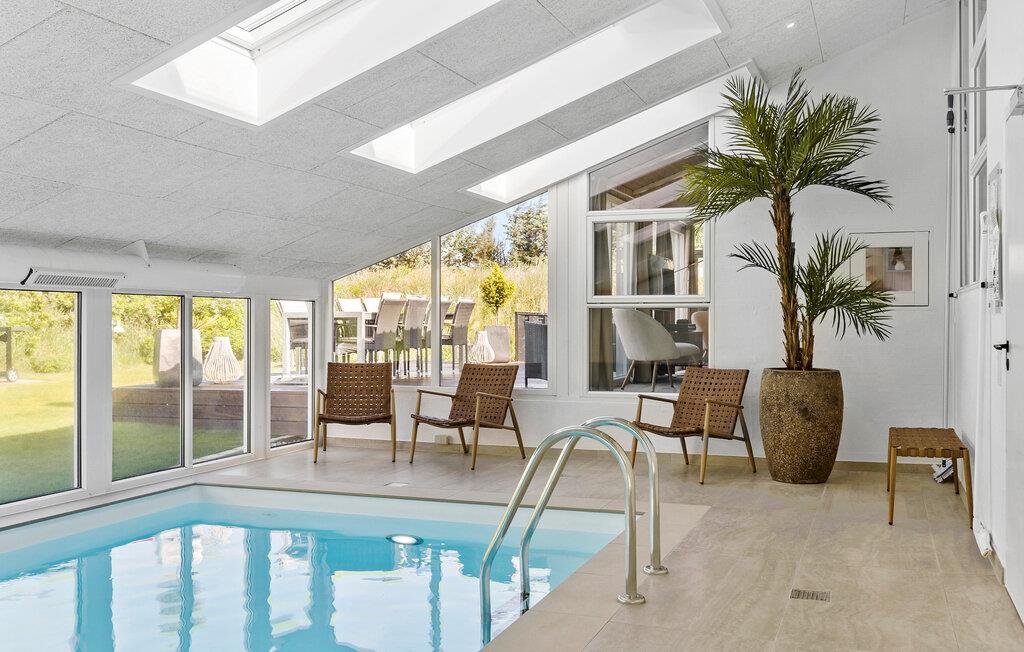 Hier verblijft u ook op loopafstand van een van de beste stranden van Denemarken. Het vakantiehuis is uiteraard van alle gemakken voorzien. Een van de attracties is het zwembad, dat u kunt zien vanuit de woonkamer/keuken en vanaf twee van de drie terrassen. In het zwembad bevinden zich een bad, een sauna en ligstoelen. De sfeer in de woonkeuken is gezellig en de vloer is gedeeltelijk verlaagd, wat een interessant perspectief oplevert. De terrassen en de lampen in de tuin bieden ontspanning met veel sfeer.