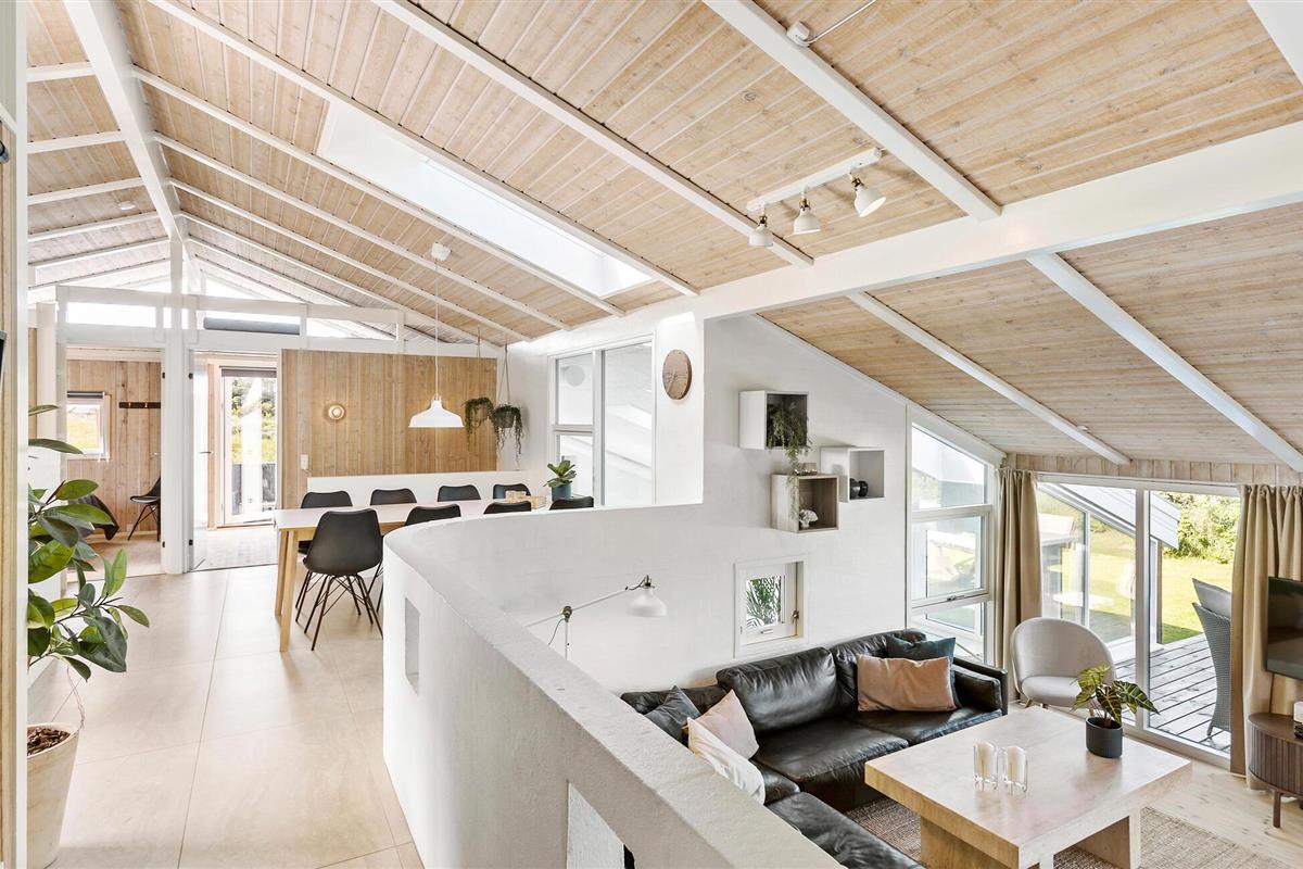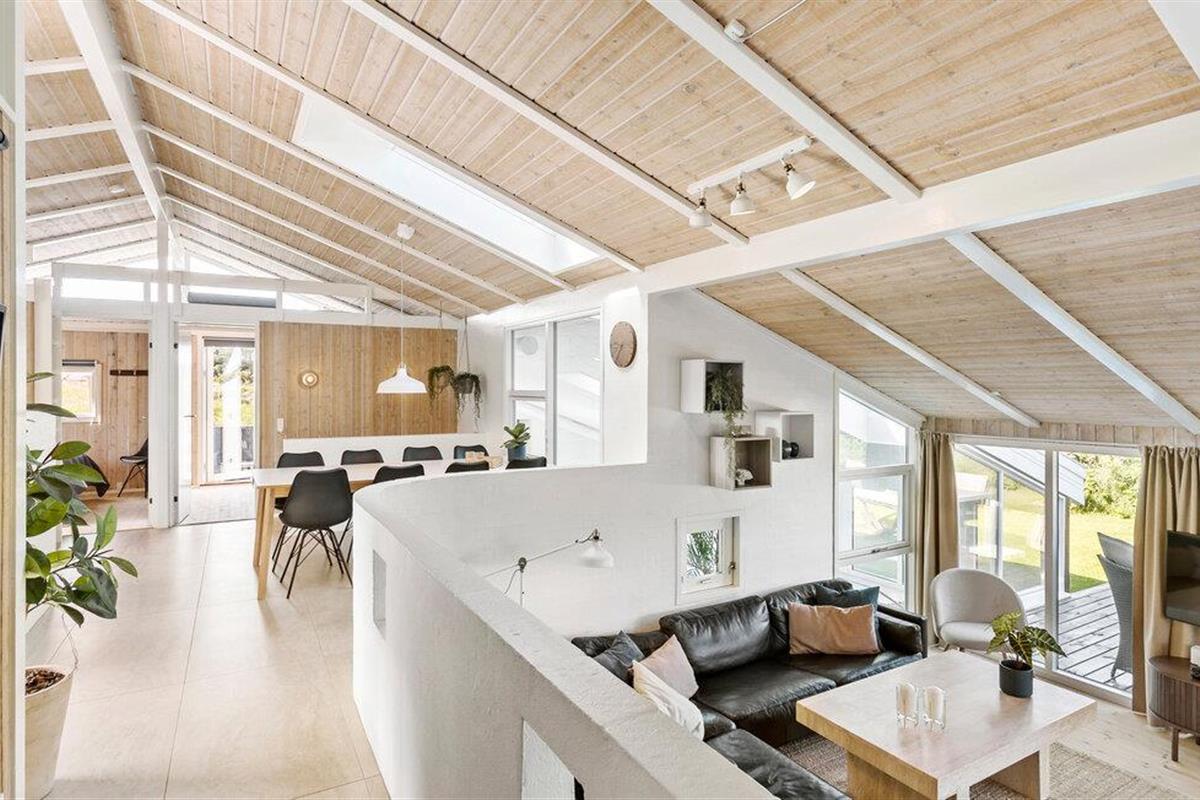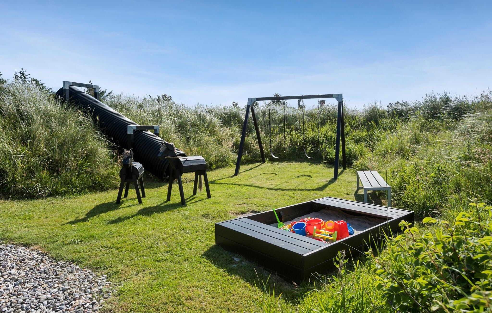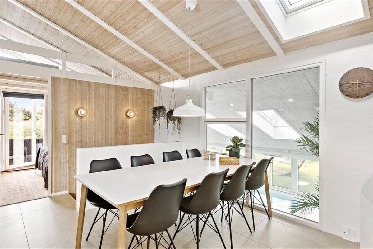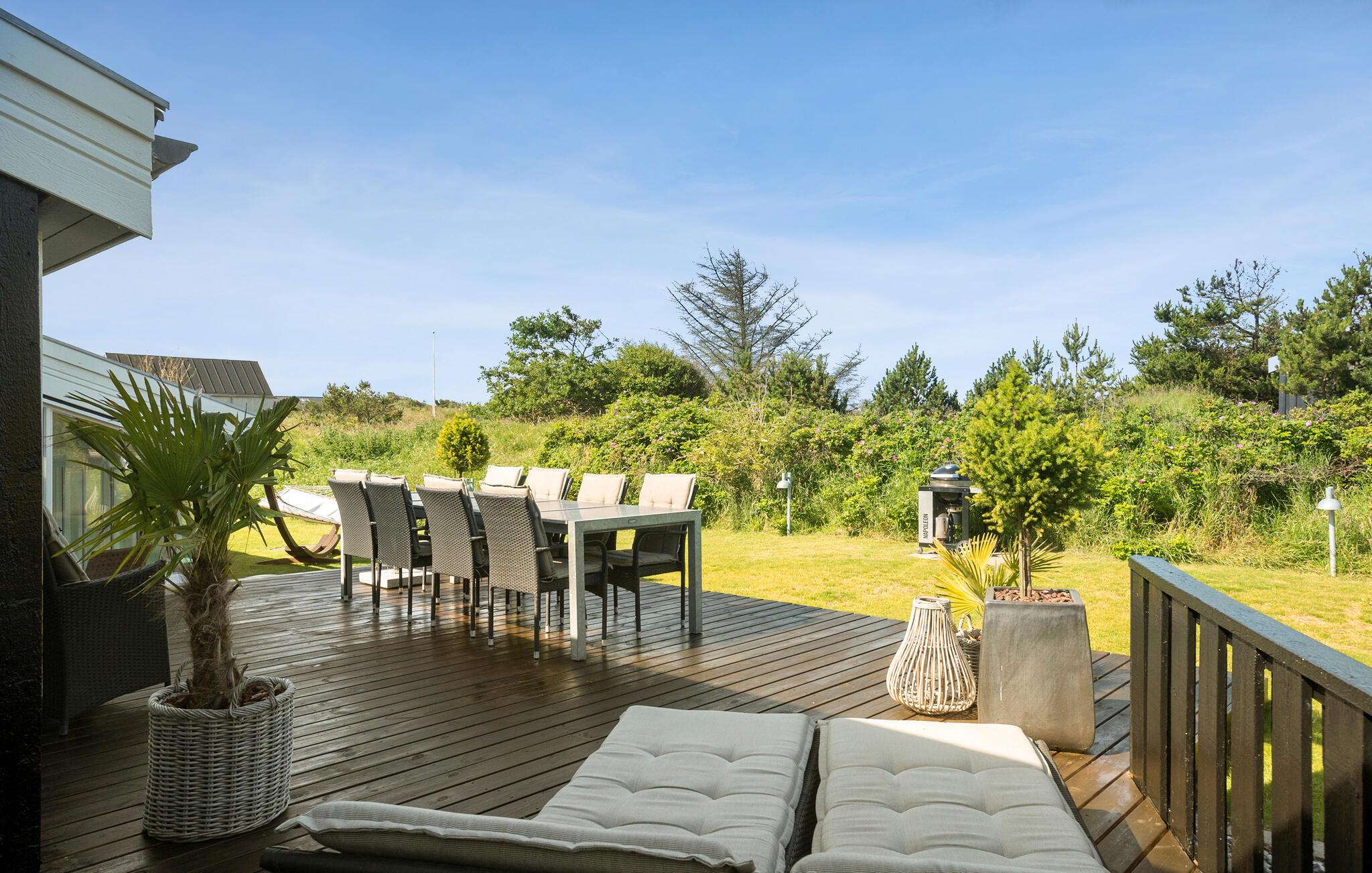 Hier verblijft u ook op loopafstand van een van de beste stranden van Denemarken. Het vakantiehuis is uiteraard van alle gemakken voorzien. Een van de attracties is het zwembad, dat u kunt zien vanuit de woonkamer/keuken en vanaf twee van de drie terrassen. In het zwembad bevinden zich een bad, een sauna en ligstoelen. De sfeer in de woonkeuken is gezellig en de vloer is gedeeltelijk verlaagd, wat een interessant perspectief oplevert. De terrassen en de lampen in de tuin bieden ontspanning met veel sfeer.