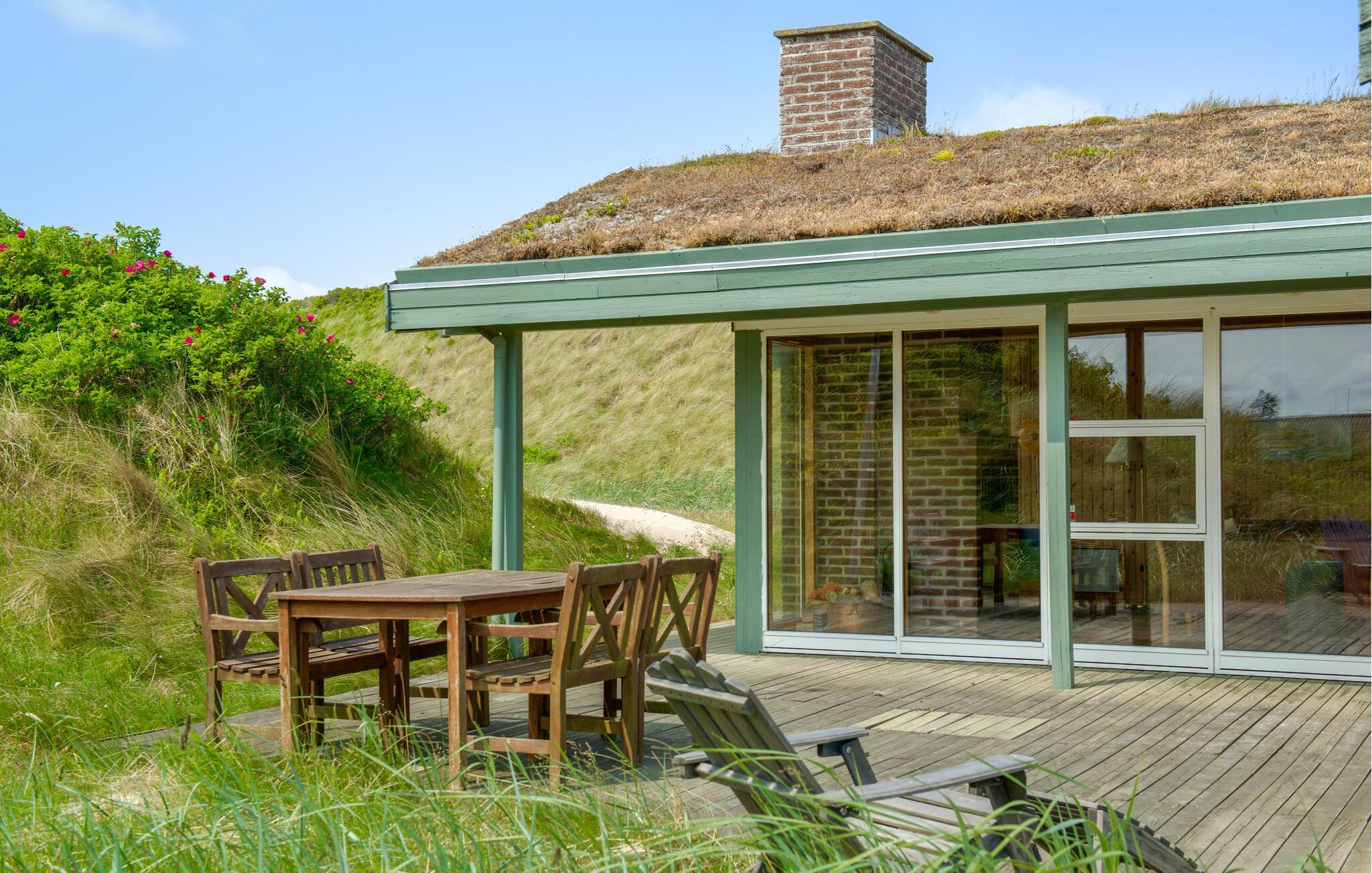 Geniet van een stijlvol vakantiehuis met grasdak, sauna en prachtig uitzicht op de duinen nabij Saltum strand.