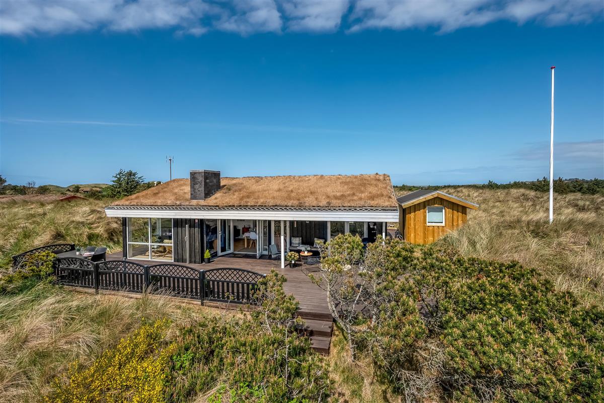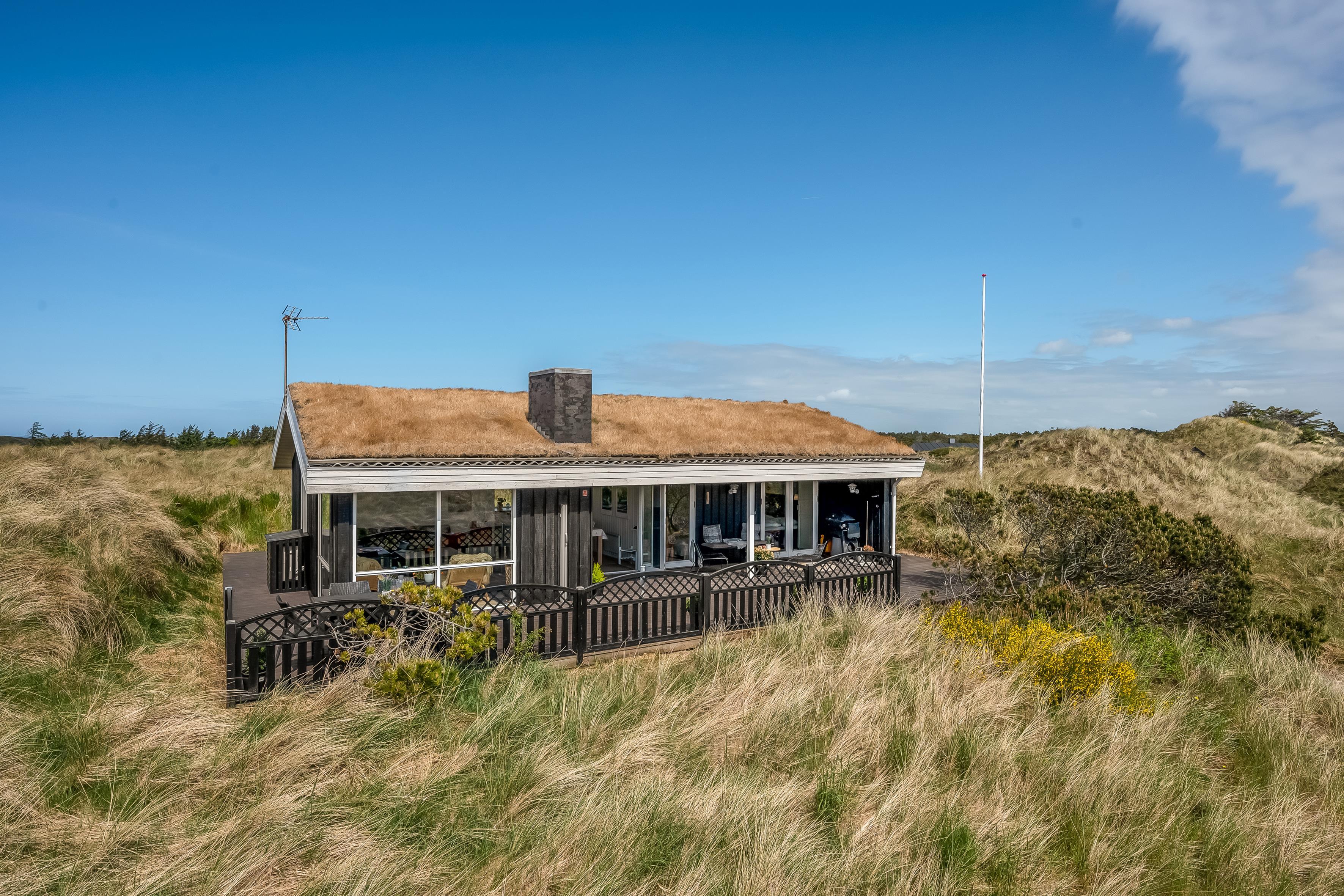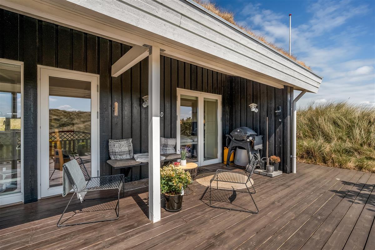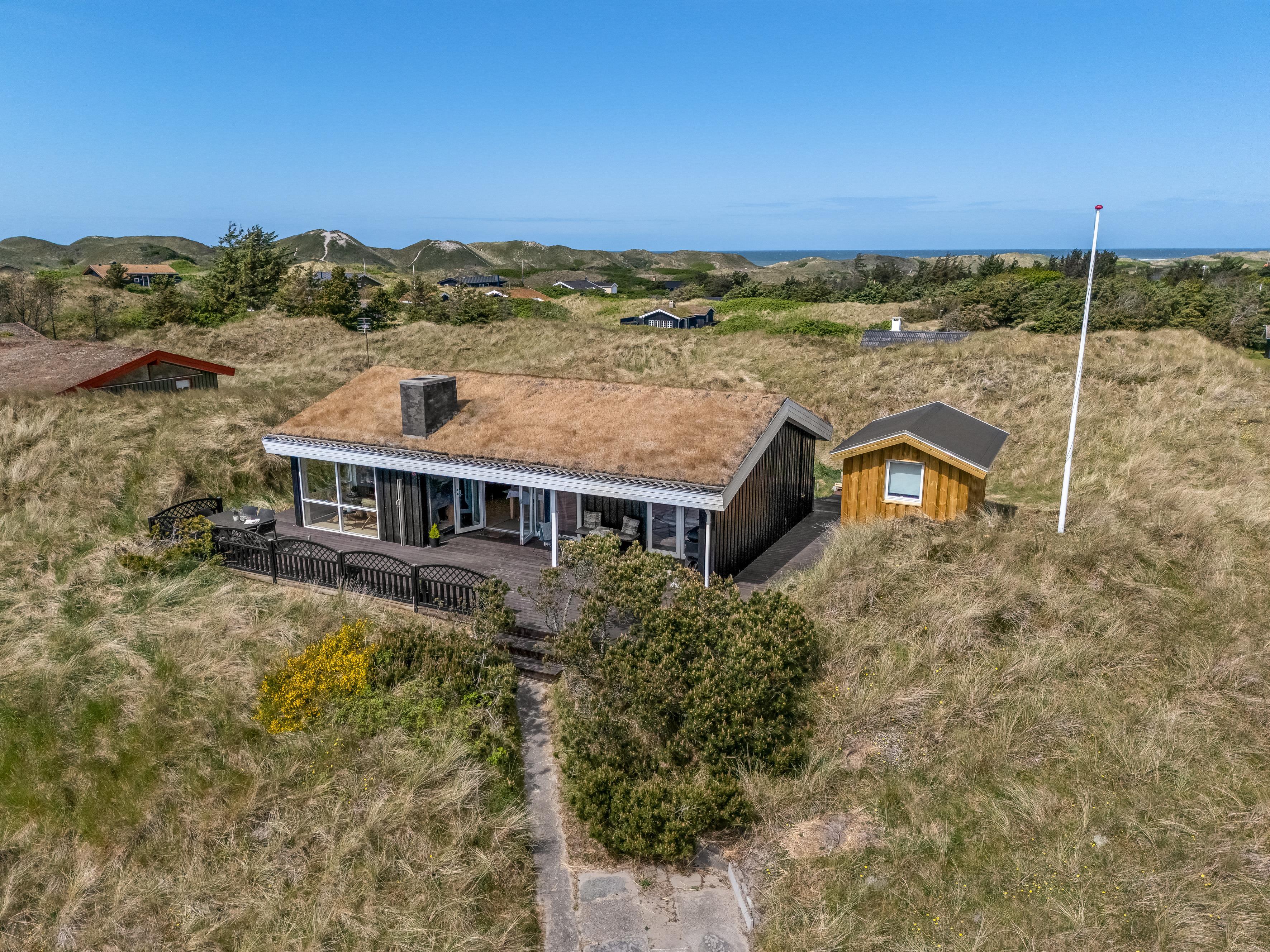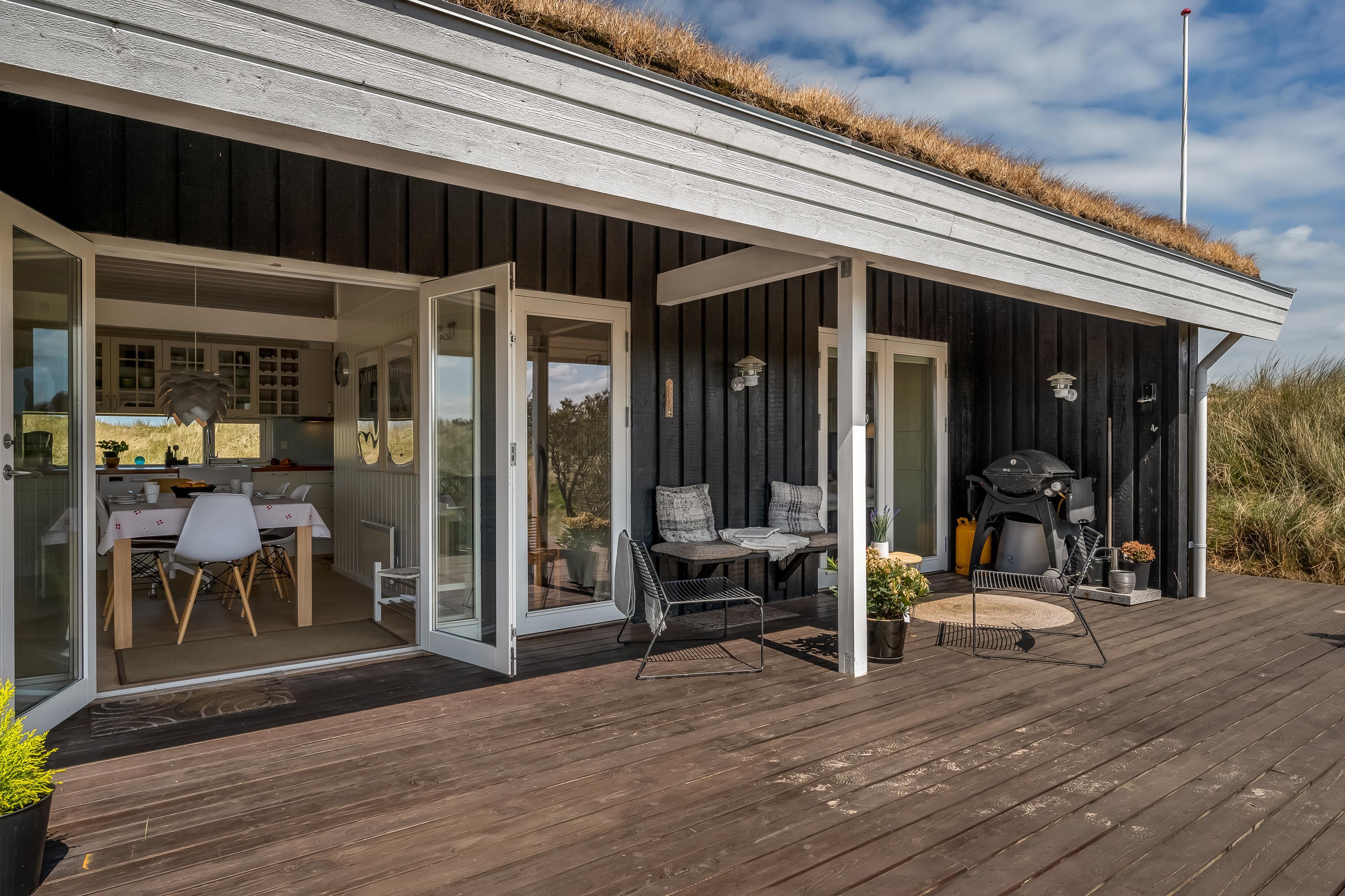 The modern house features a light and harmonious interior with large windows that bring the dune landscape right into the living room. The open-plan living area combines kitchen and lounge, and the wood-burning stove creates a cosy atmosphere on cool evenings. Two of the three bedrooms have direct access to the terrace, and the stylish bathroom completes the indoor comfort. Sleeps 5.
