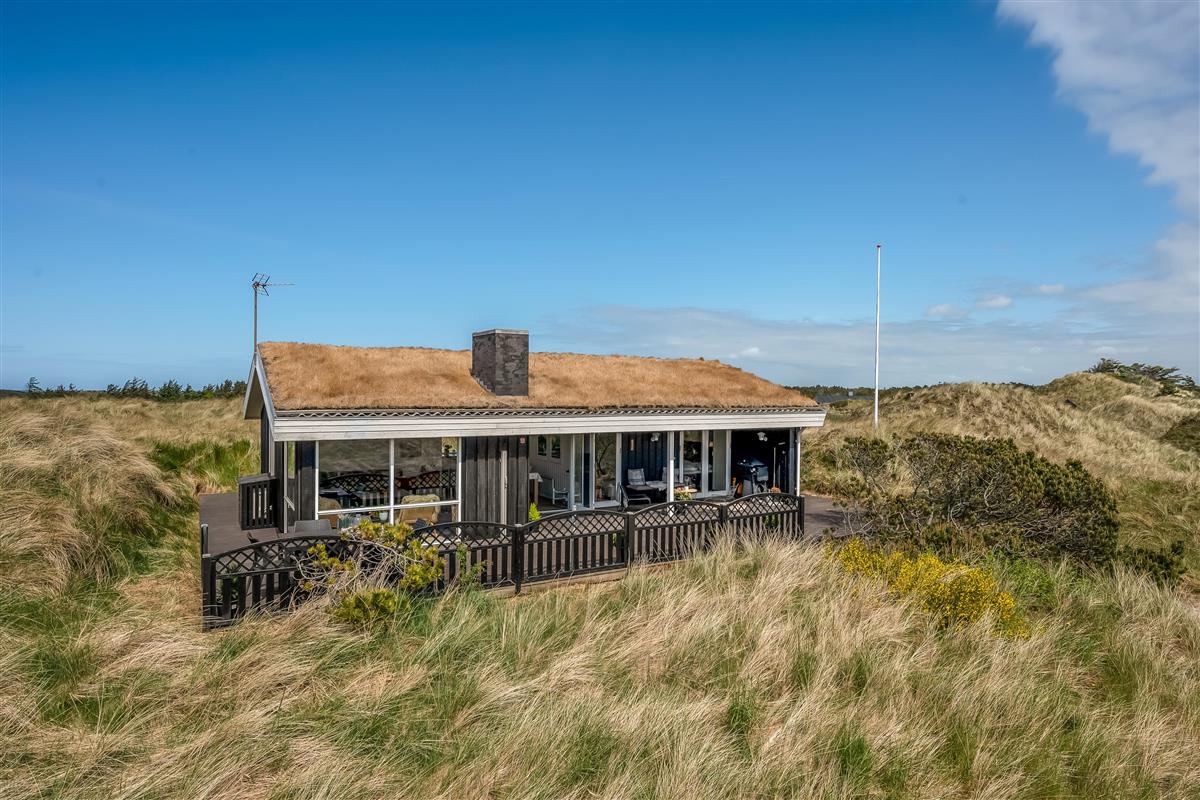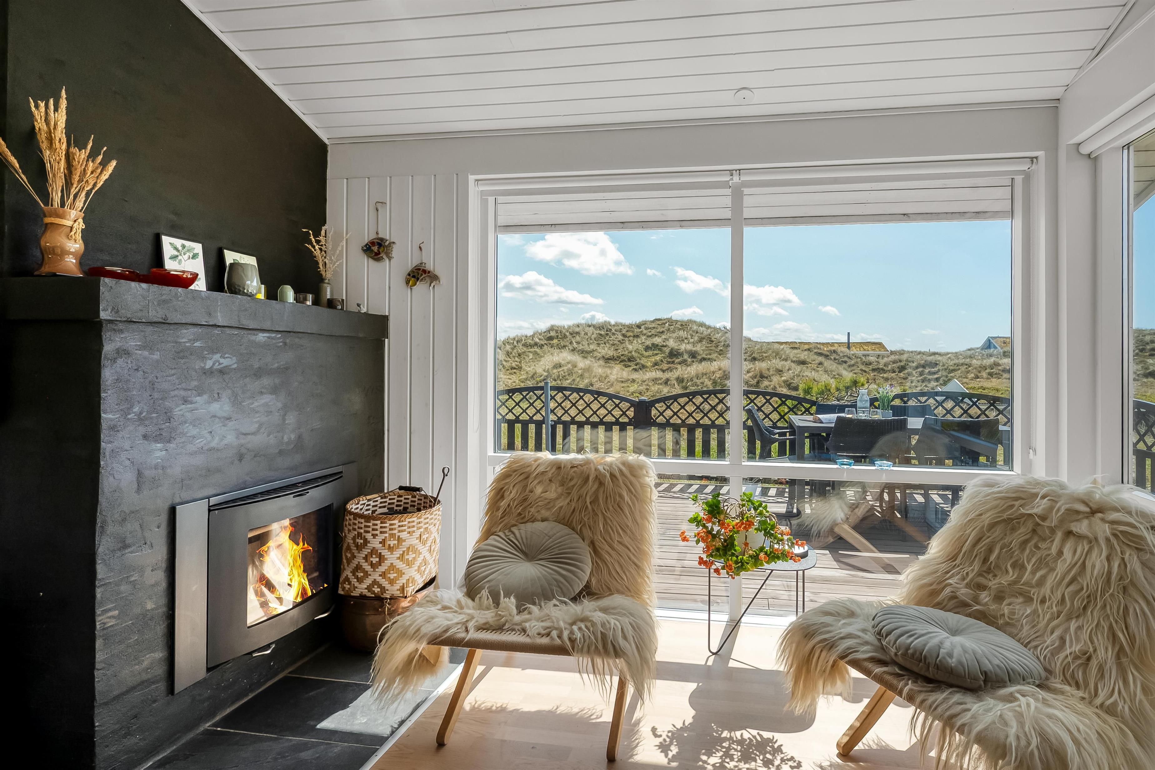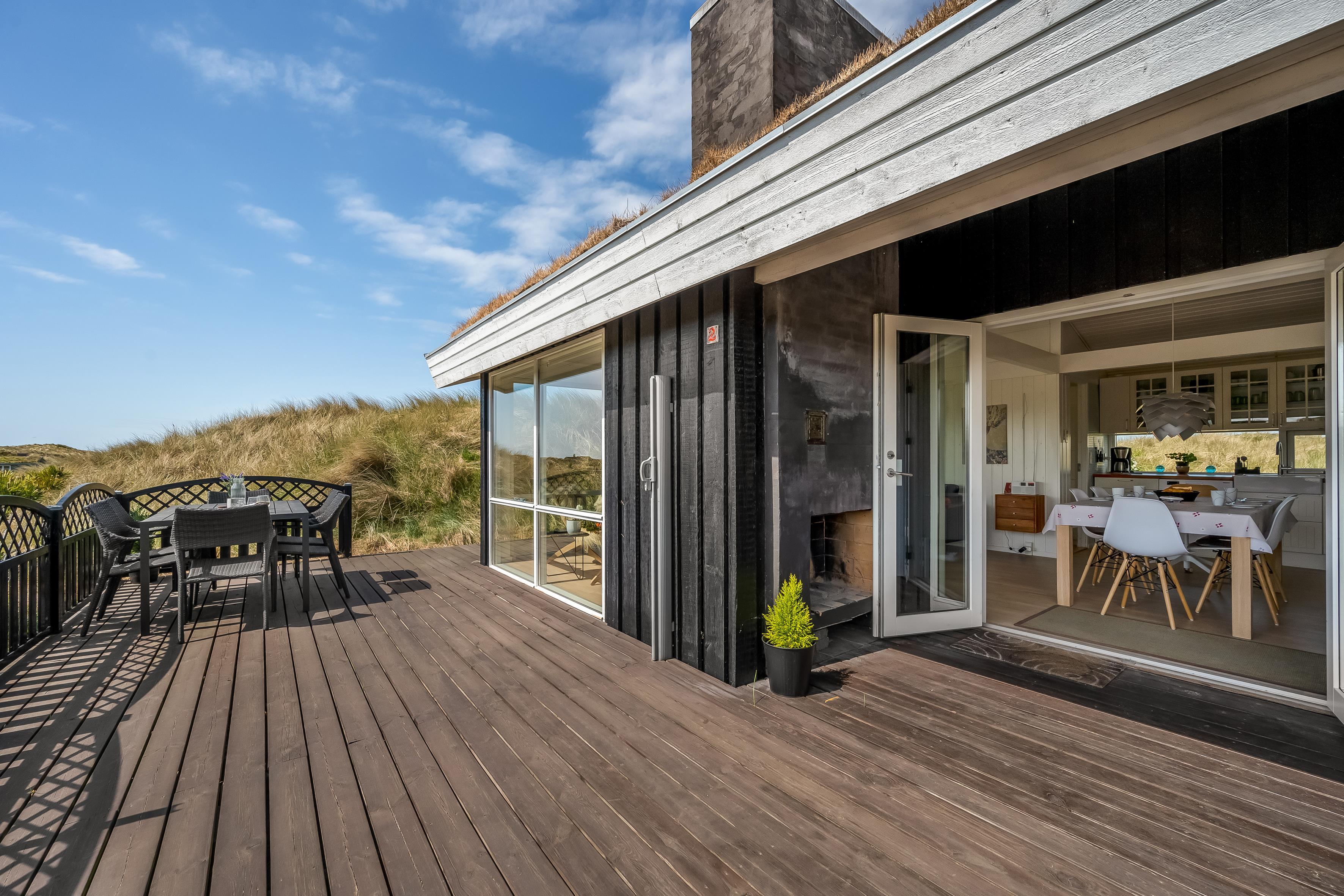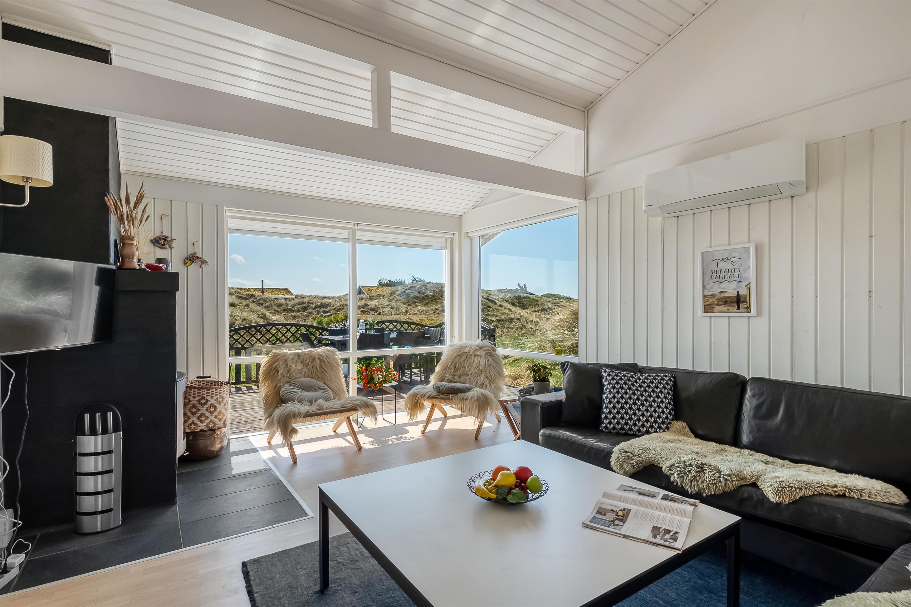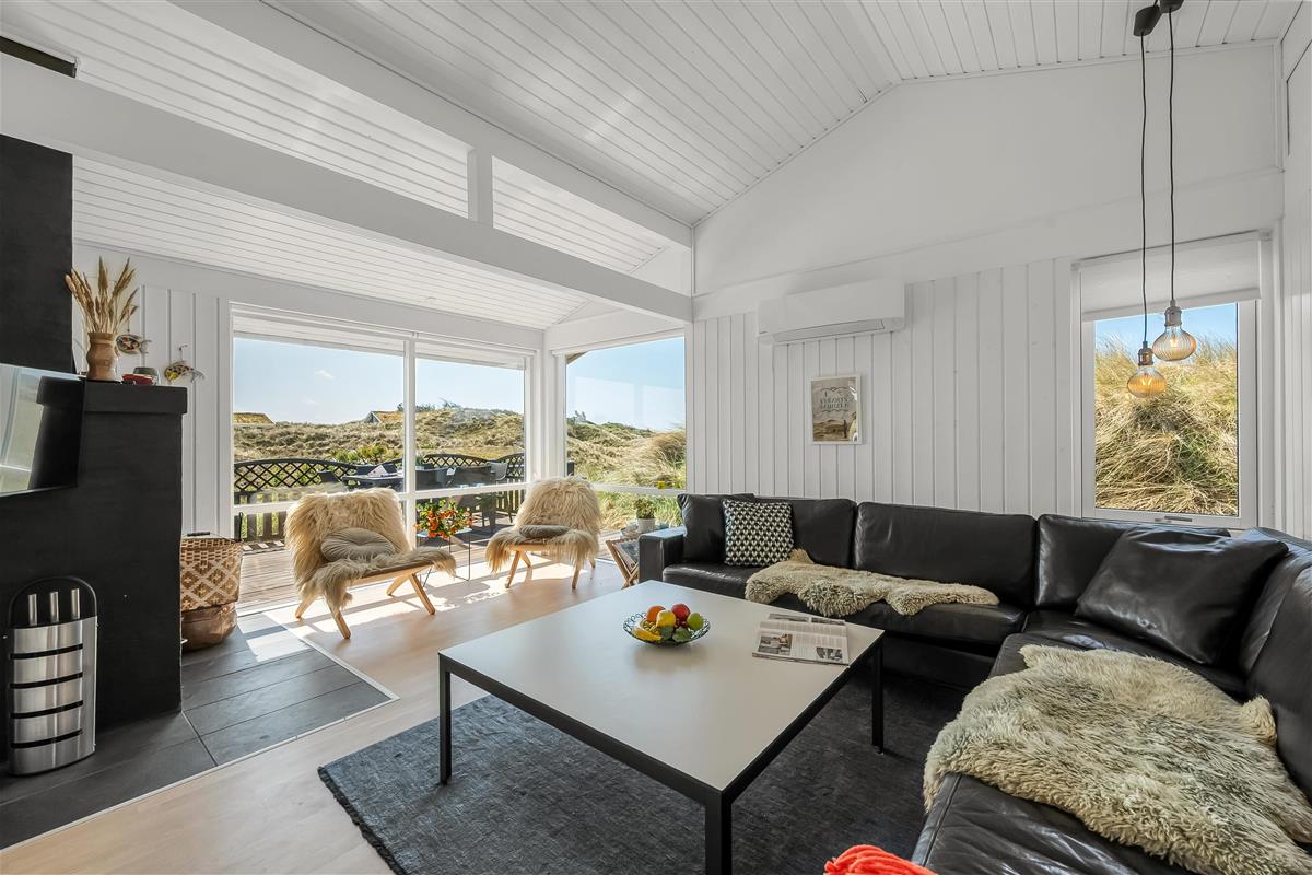 The modern house features a light and harmonious interior with large windows that bring the dune landscape right into the living room. The open-plan living area combines kitchen and lounge, and the wood-burning stove creates a cosy atmosphere on cool evenings. Two of the three bedrooms have direct access to the terrace, and the stylish bathroom completes the indoor comfort. Sleeps 5.