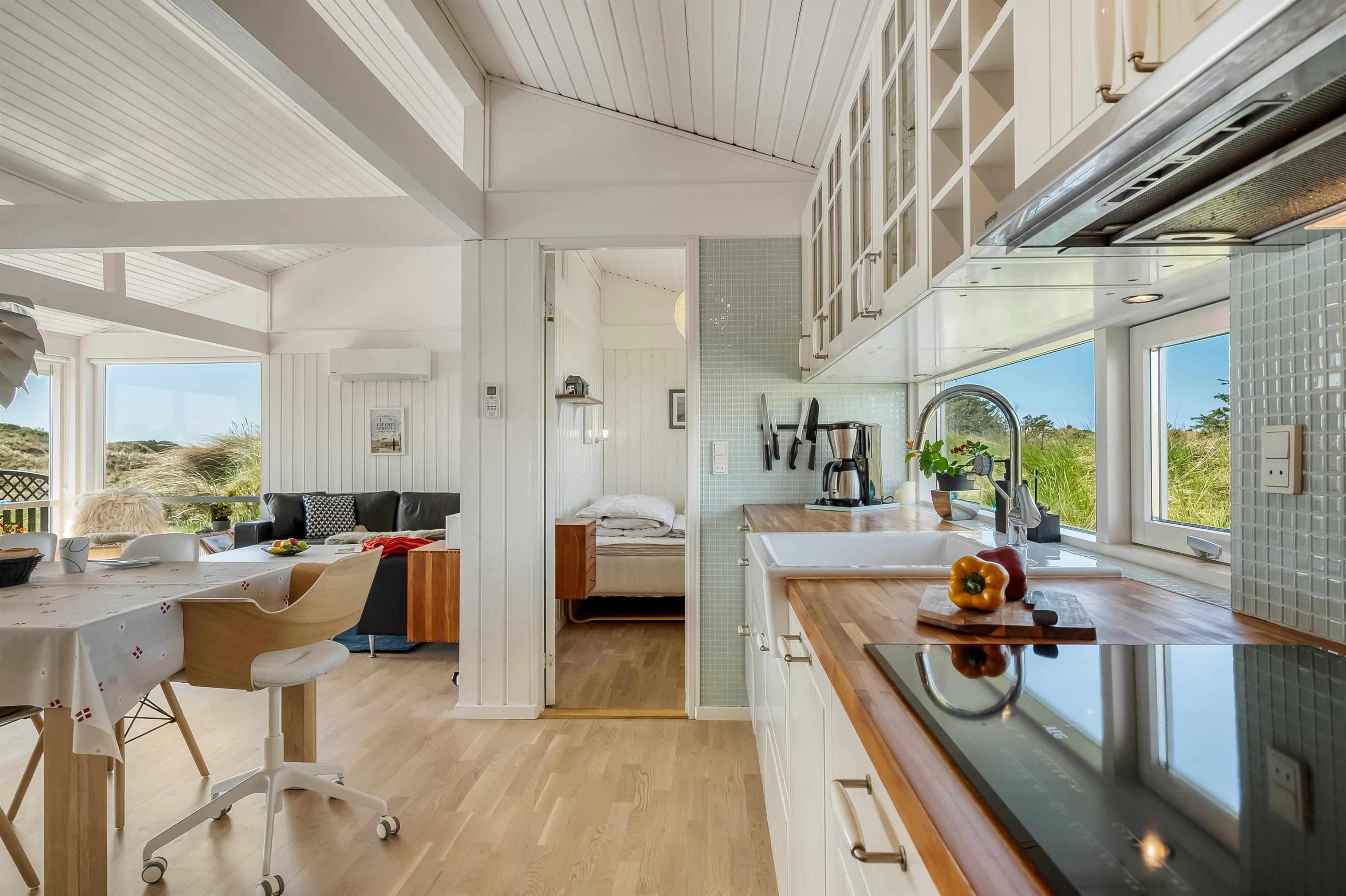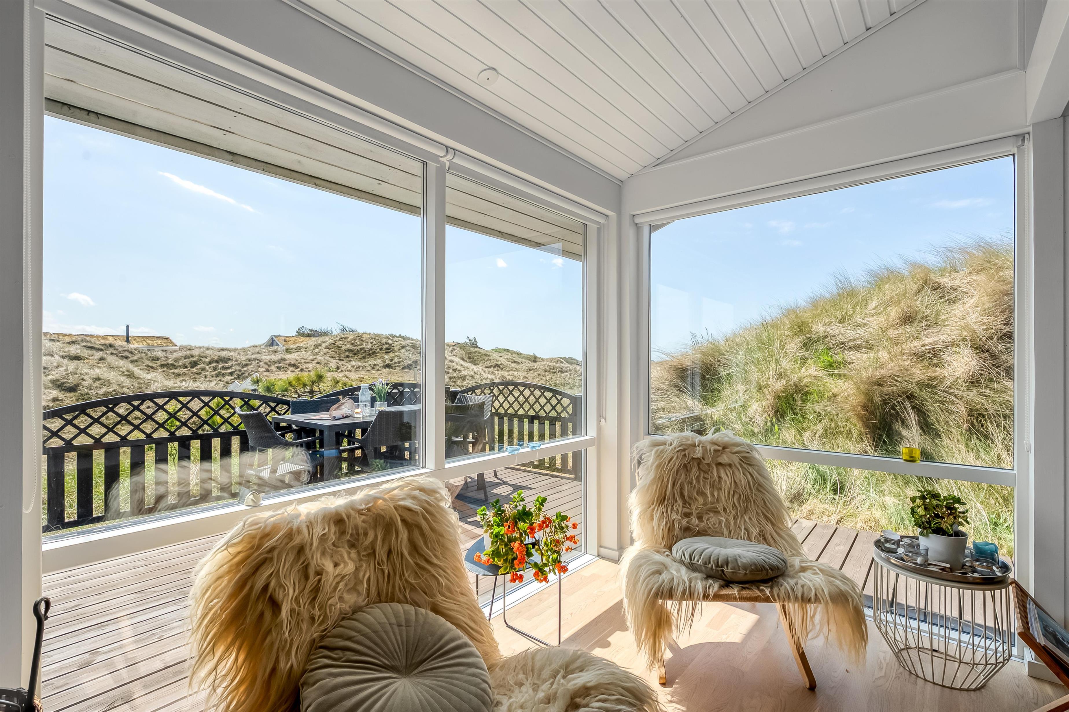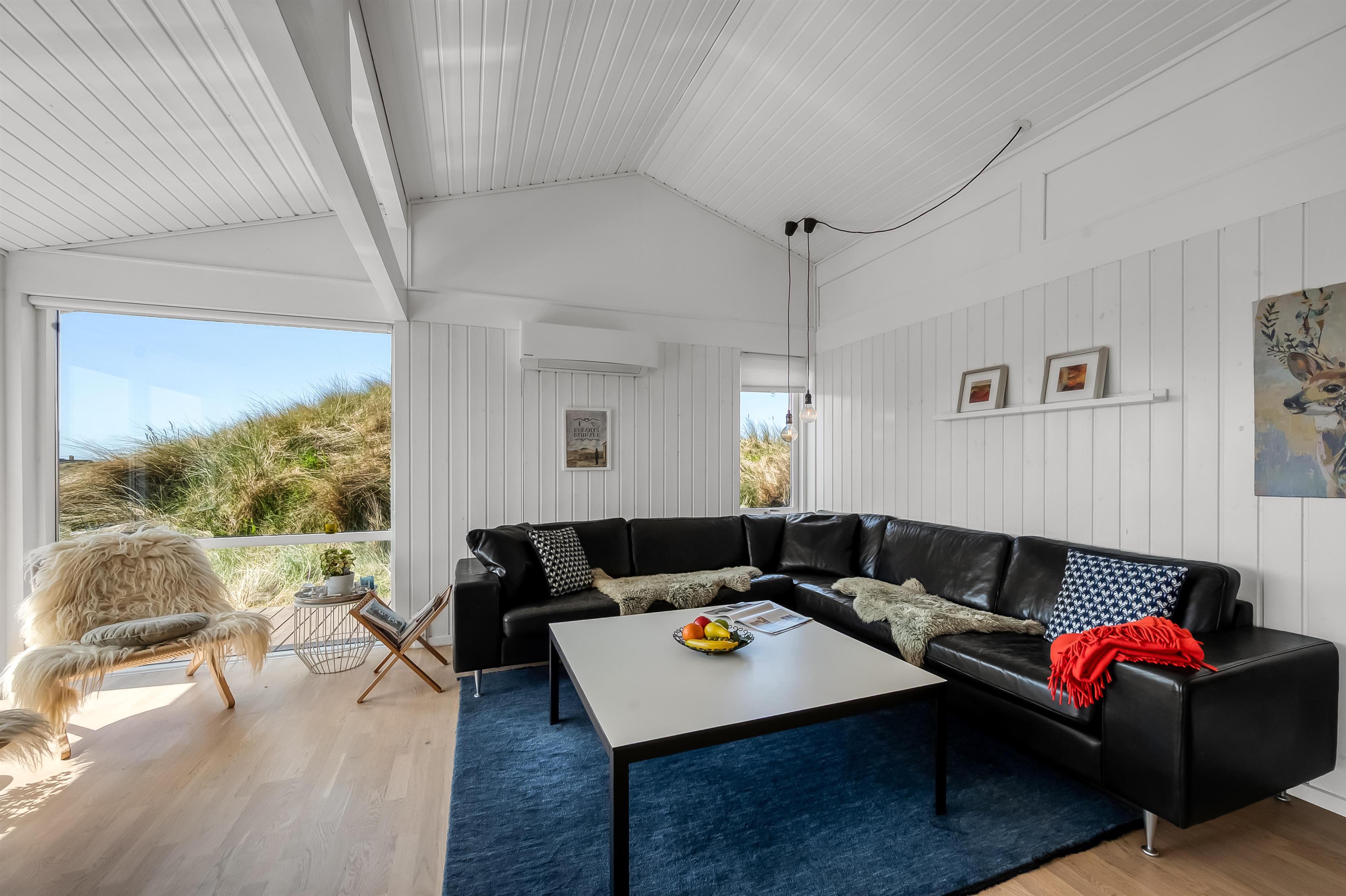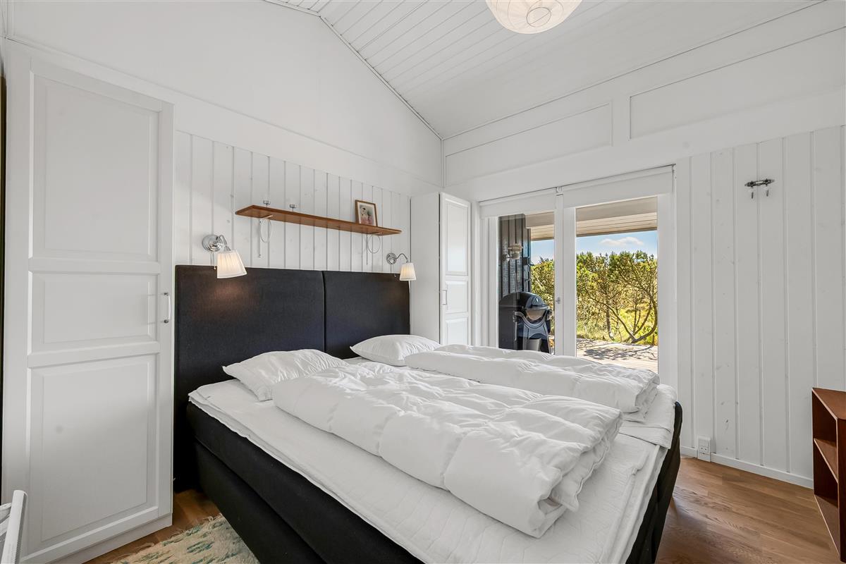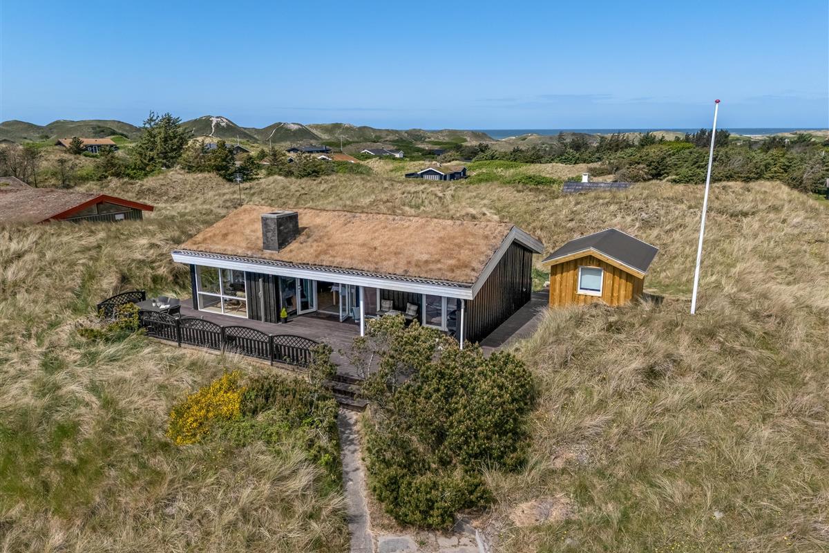 The modern house features a light and harmonious interior with large windows that bring the dune landscape right into the living room. The open-plan living area combines kitchen and lounge, and the wood-burning stove creates a cosy atmosphere on cool evenings. Two of the three bedrooms have direct access to the terrace, and the stylish bathroom completes the indoor comfort. Sleeps 5.