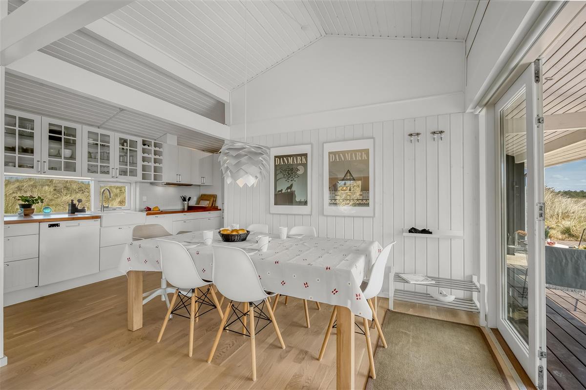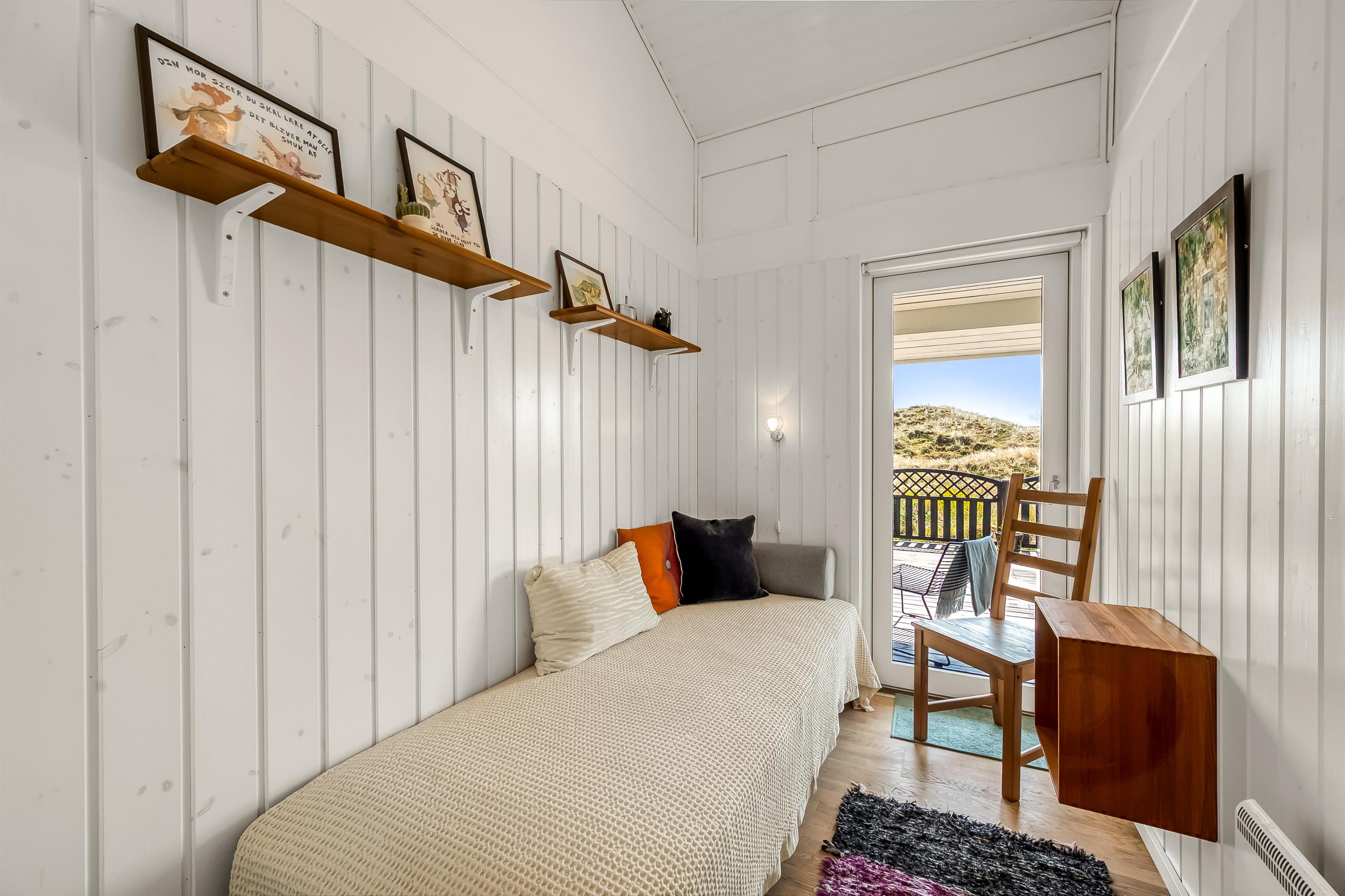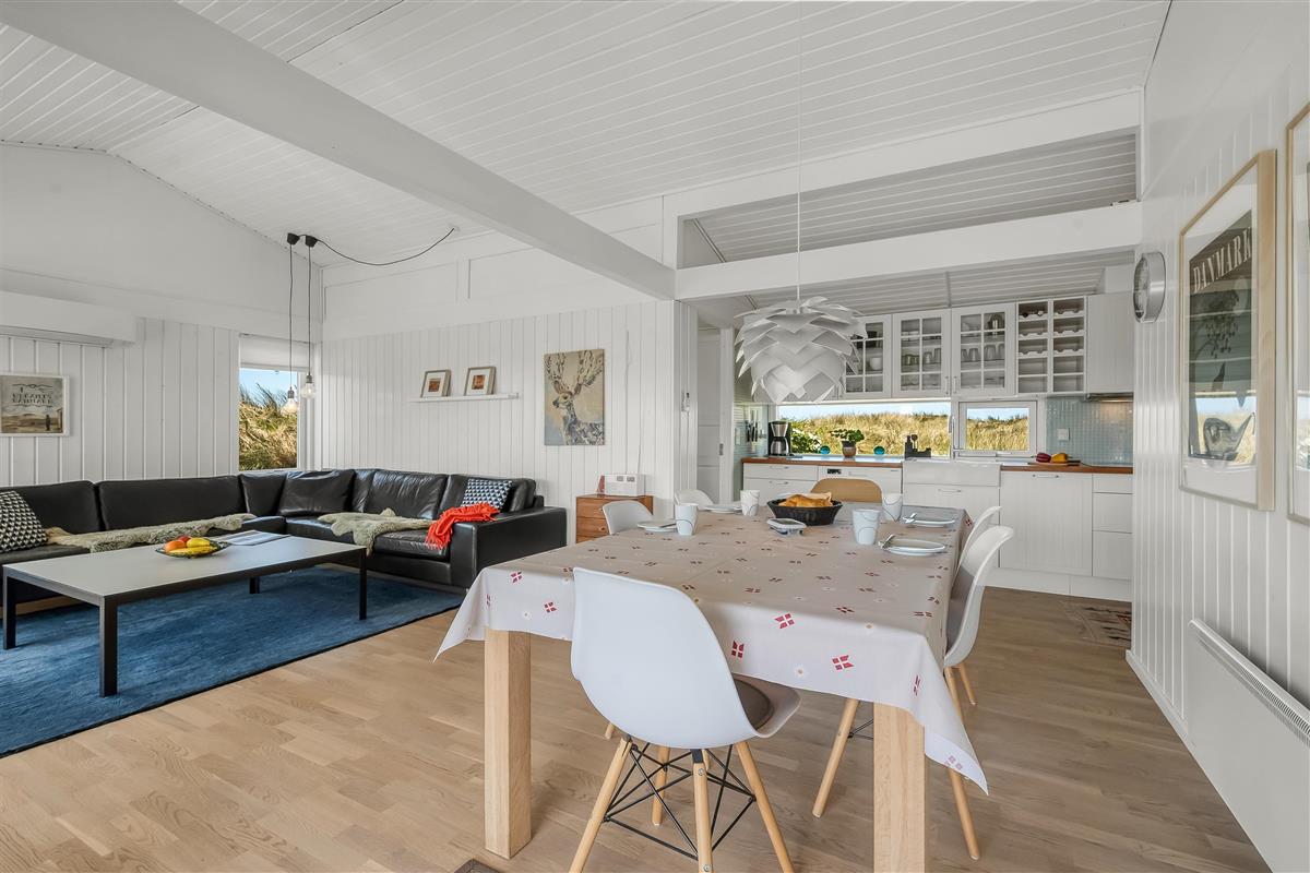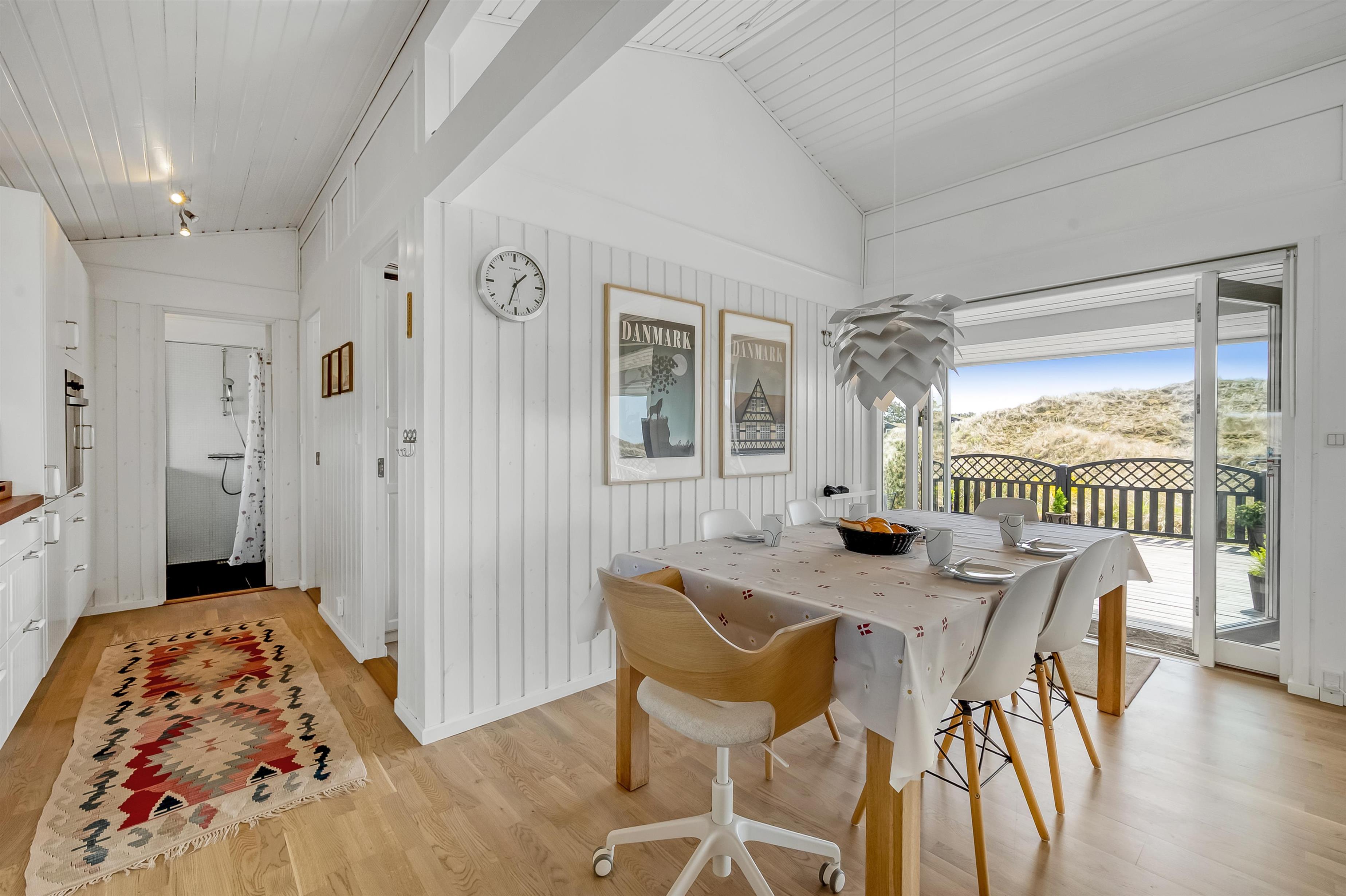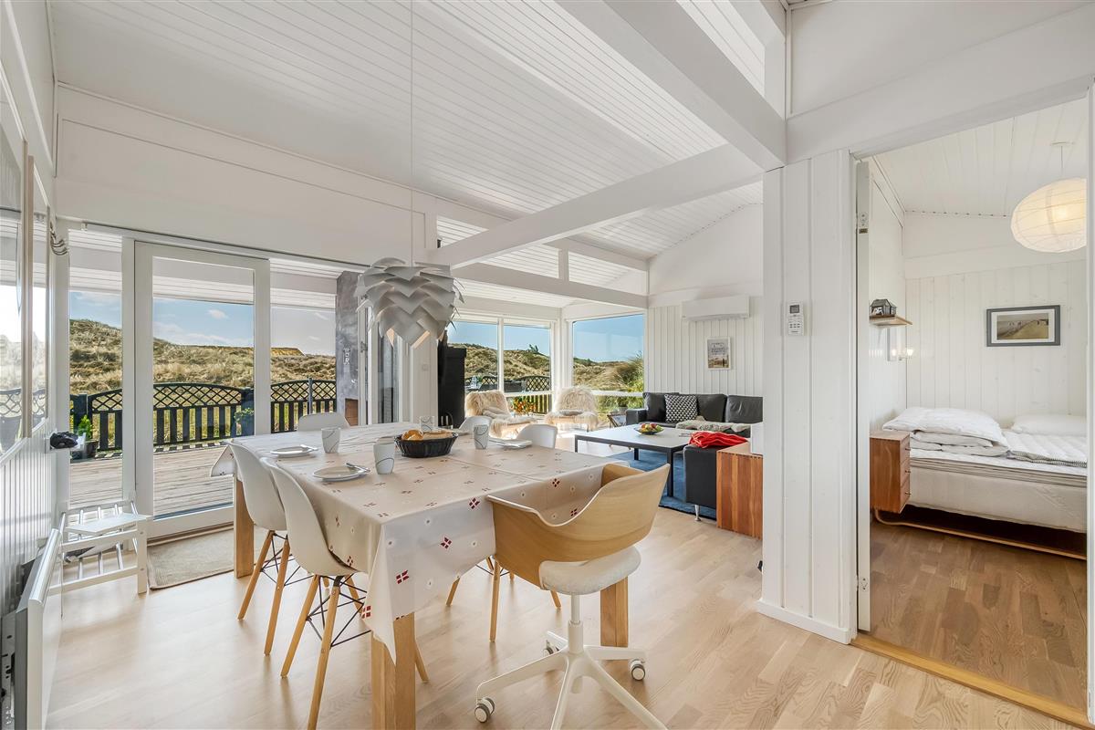The modern house features a light and harmonious interior with large windows that bring the dune landscape right into the living room. The open-plan living area combines kitchen and lounge, and the wood-burning stove creates a cosy atmosphere on cool evenings. Two of the three bedrooms have direct access to the terrace, and the stylish bathroom completes the indoor comfort. Sleeps 5.
