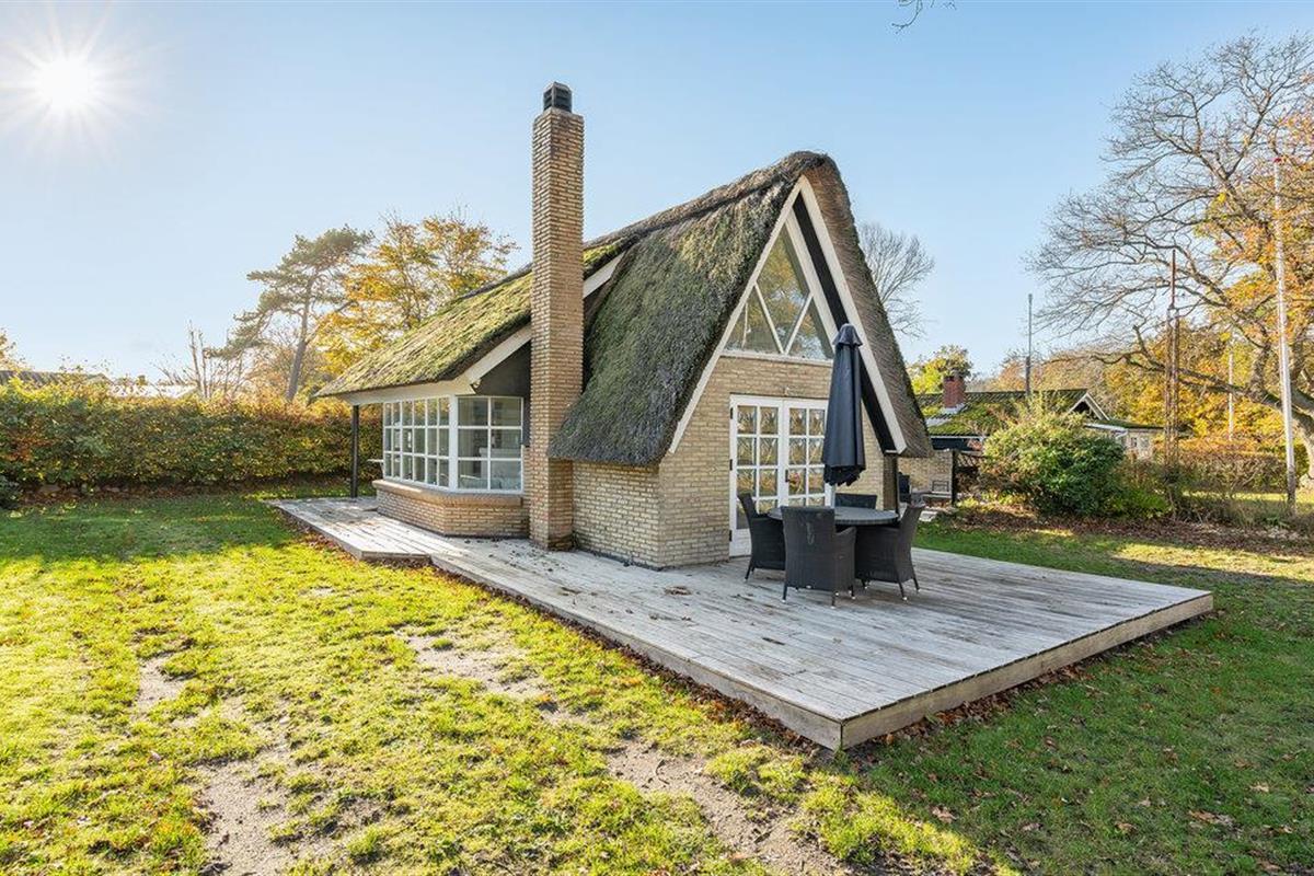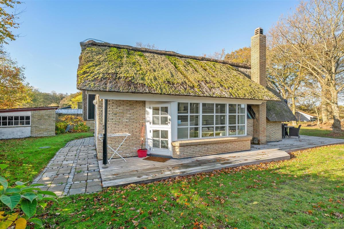 Charmant landhuis met rieten dak en zeezicht in Sandersvig Strand, ideaal voor een rustige vakantie aan de Deense kust.
