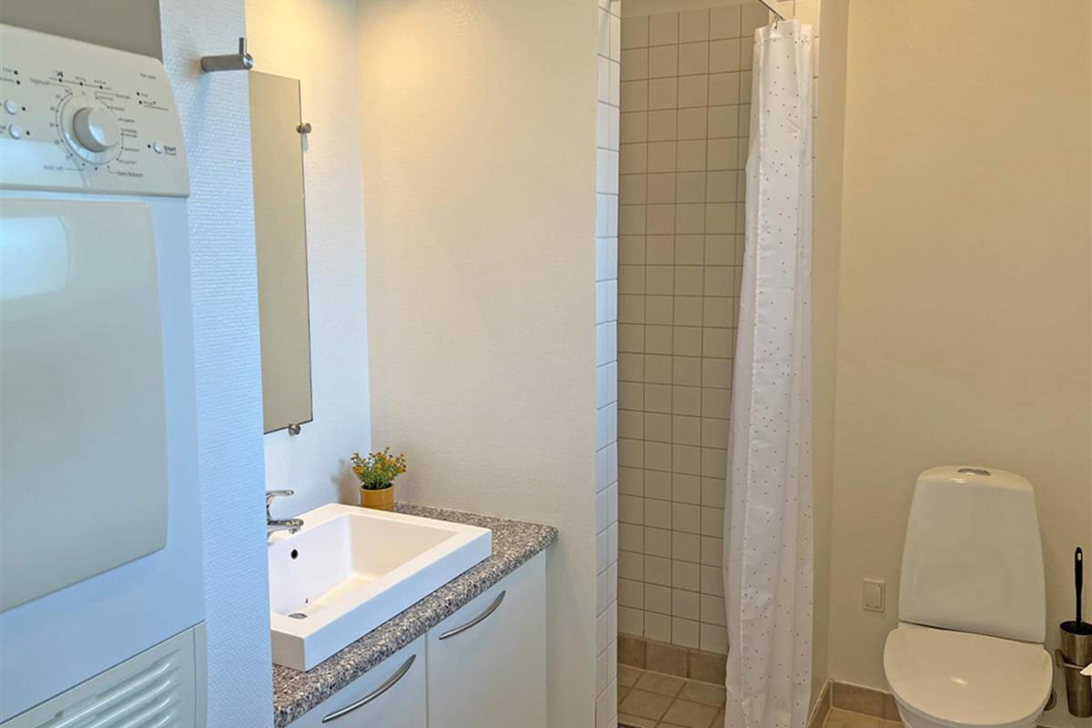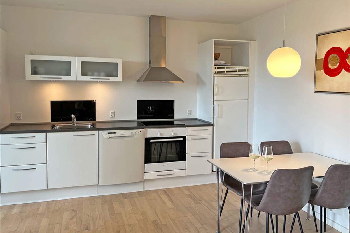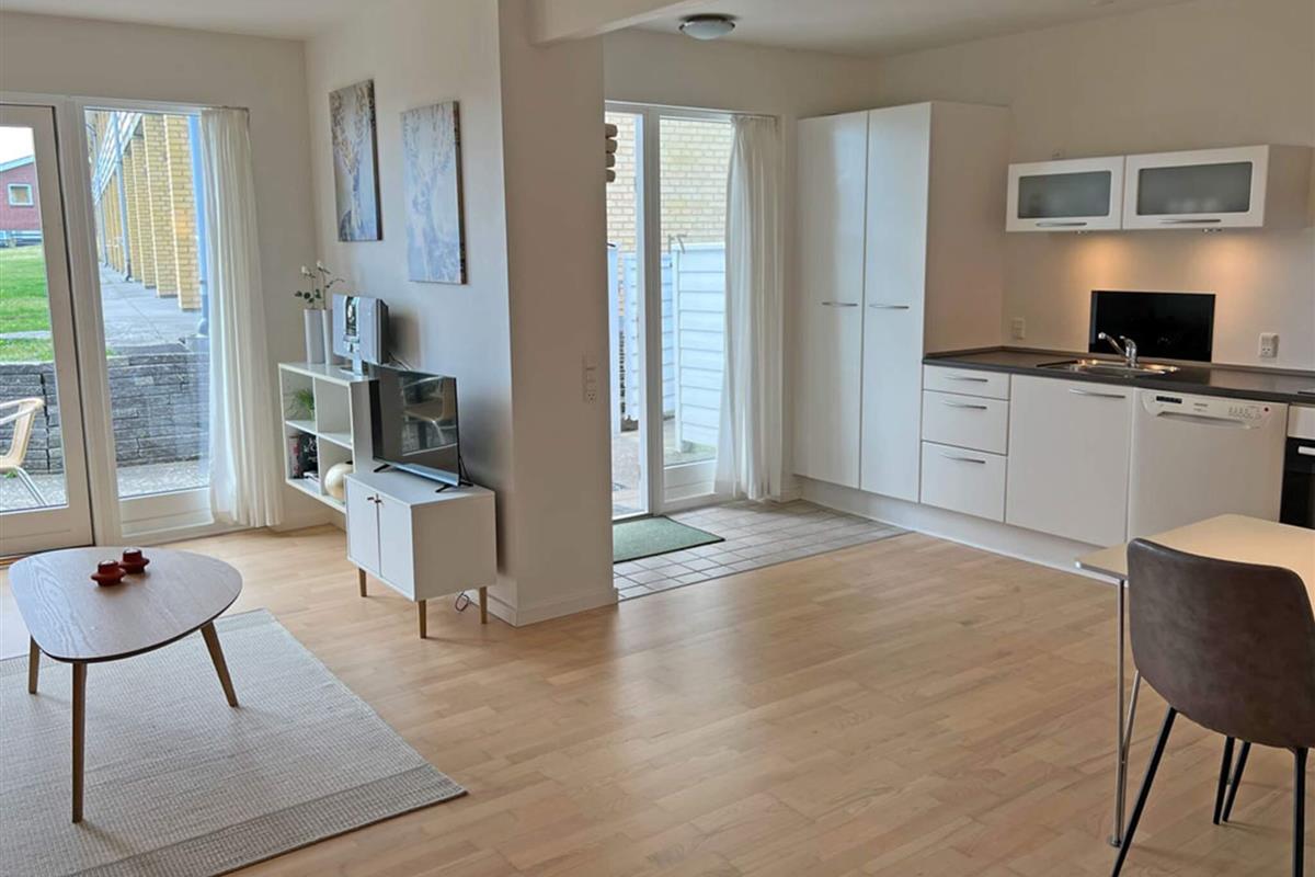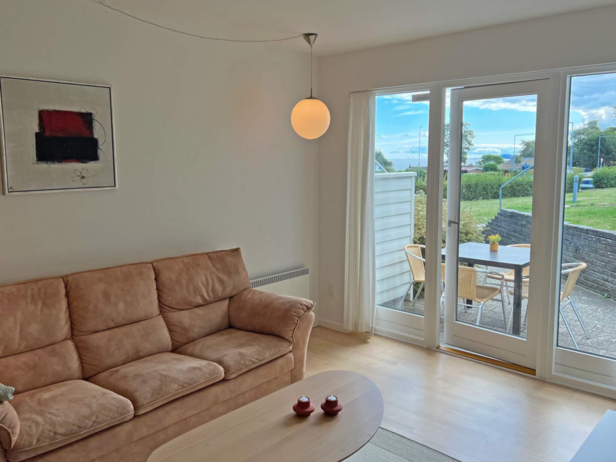 Schöne und helle Ferienwohnung für 2-4 Personen. Die Wohnung ist mit einem Wohnzimmer bestehend aus einer Küche, einem Wohnzimmer mit einem Sofa und zwei Sofasesseln sowie einem Fernseher ausgestattet. Vom Wohnzimmer aus gelangt man in ein separates Schlafzimmer mit Doppelbett und in ein Badezimmer mit Dusche, WC und Fußbodenheizung. Vom Wohnzimmer aus haben Sie außerdem Zugang zu einer privaten Terrasse mit Gartenmöbeln. Die Küche, die mit der Eingangshalle und dem Wohnzimmer verbunden ist, ist gut ausgestattet und enthält u.a. Kaffeemaschine, Wasserkocher, Geschirrspüler, Cerankochfeld, Backofen und einen Kühlschrank mit Gefrierfach. Es gibt einen Esstisch und Esstischstühle für 4 Personen.