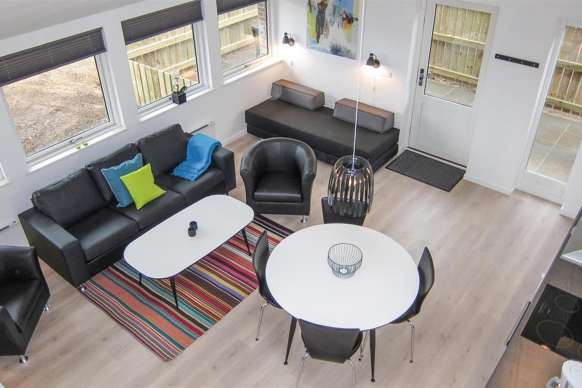 Het natuurlijke ontmoetingspunt van het huis is de open keuken-woonkamer, waar het op menig avond gezellig wordt terwijl de een kookt en de ander tv kijkt. Vanuit de woonkamer heeft u toegang tot een terras met loungemeubilair en barbecue, waar u het uzelf gemakkelijk kunt maken met een goed boek, geniet van de frisse zeelucht en uw barbecue. Er is aangename vloerverwarming in de badkamer. Op de begane grond vindt u een slaapkamer, een vide met een tweepersoonsmatras en een slaapbank.