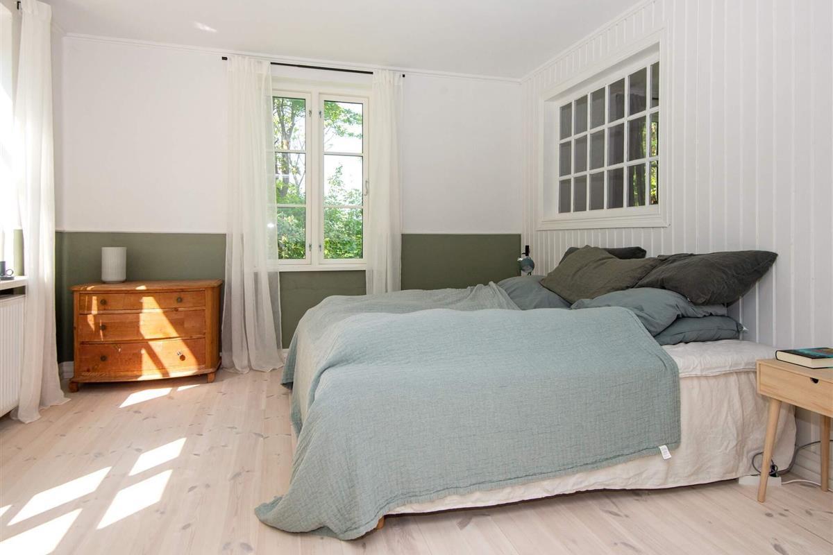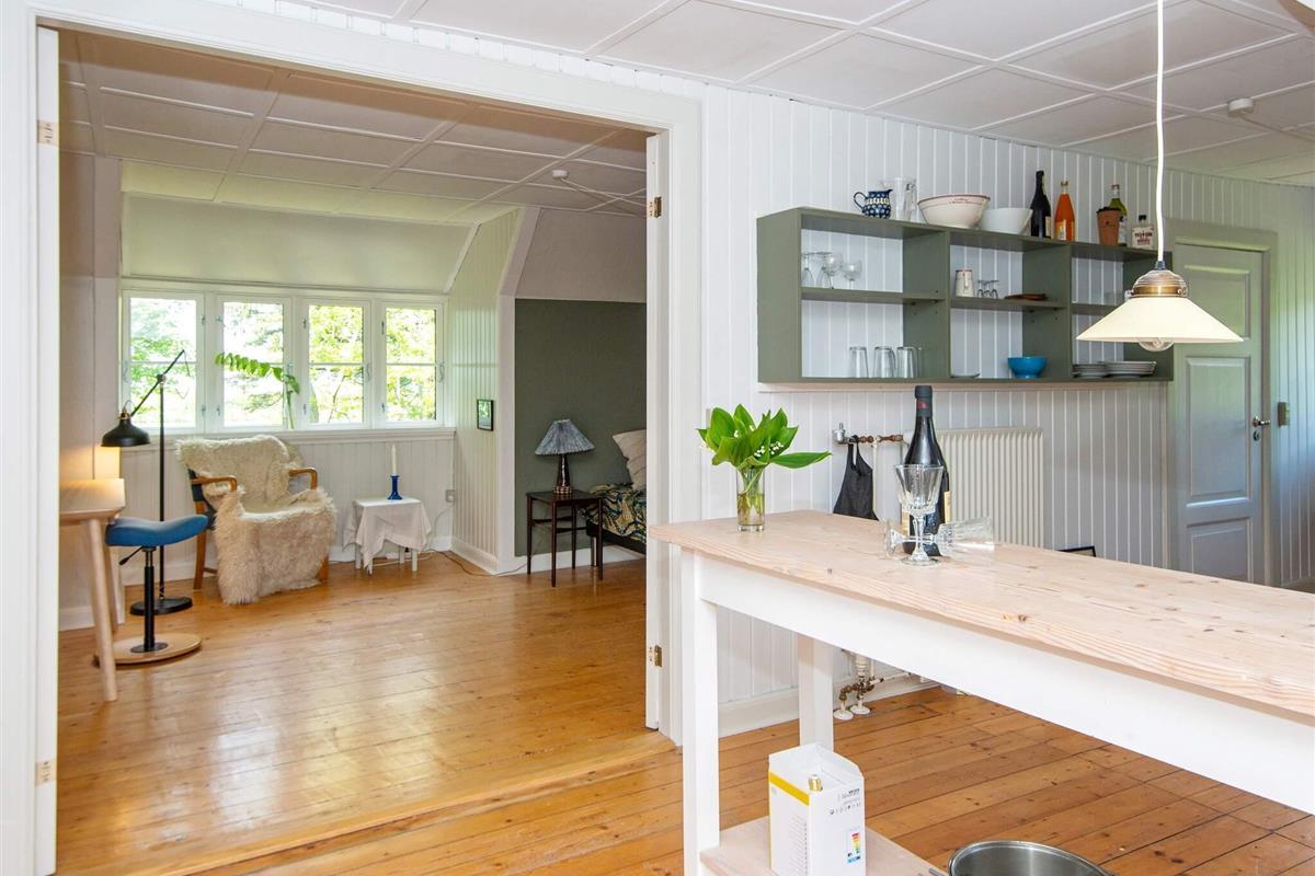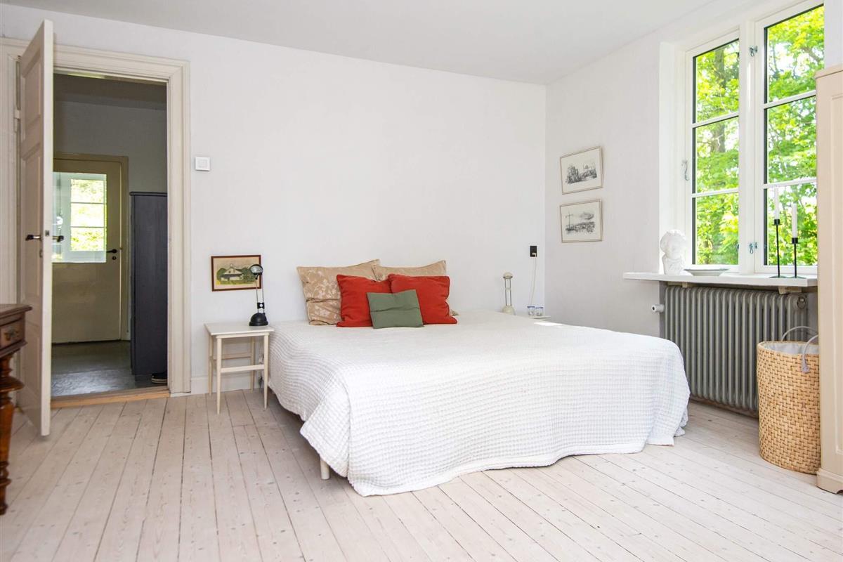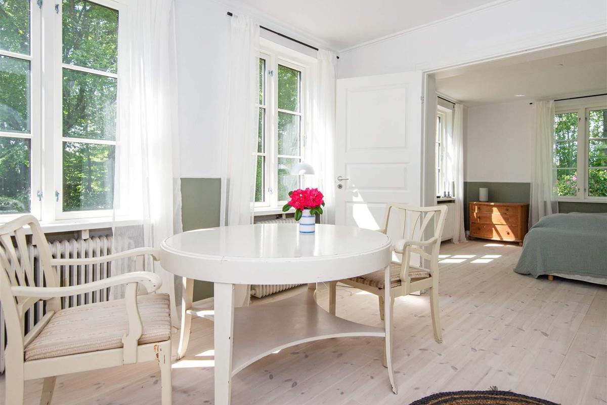 Der südwestliche Flügel des Hauses ist quasi eine separate Wohnung mit drei Schlafzimmern sowie zwei Aufenthaltsbereichen, ausgestattet mit einem großen Arbeitstisch, einem Holzofen und einem Panoramafenster nach Westen mit einem wunderbaren Licht am Nachmittag und Abend. Zu diesem Bereich gehören zudem zwei größere Bäder.