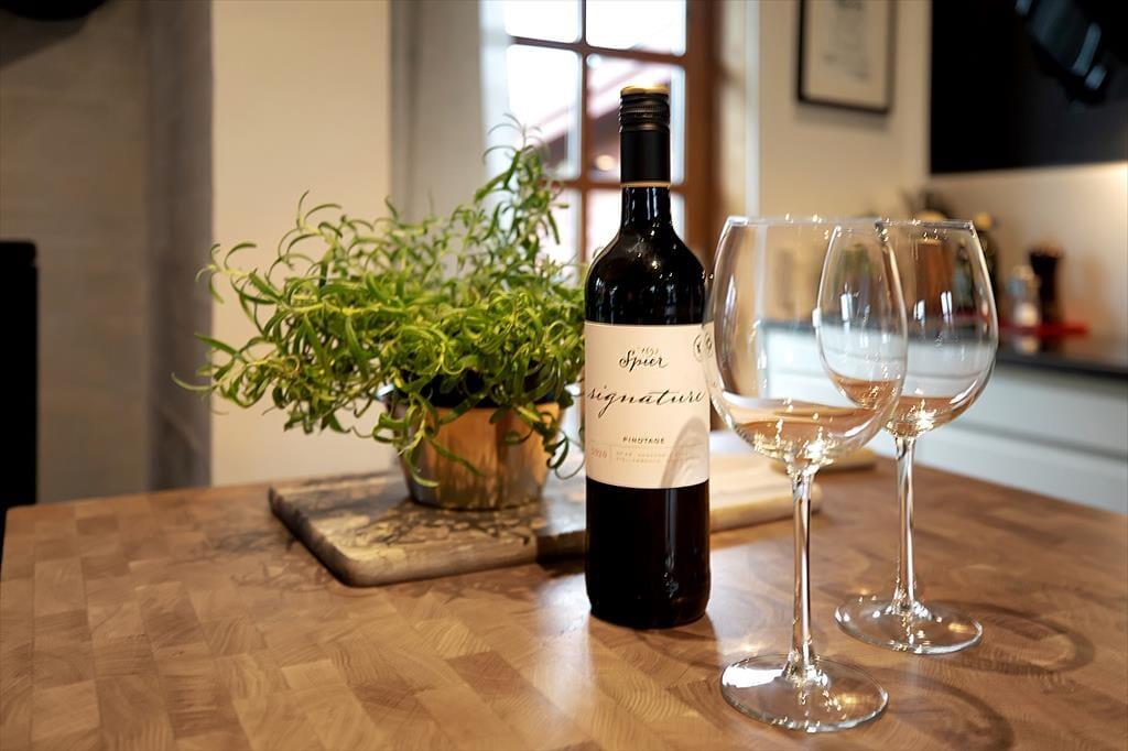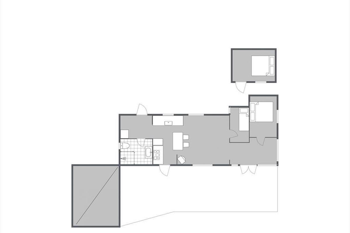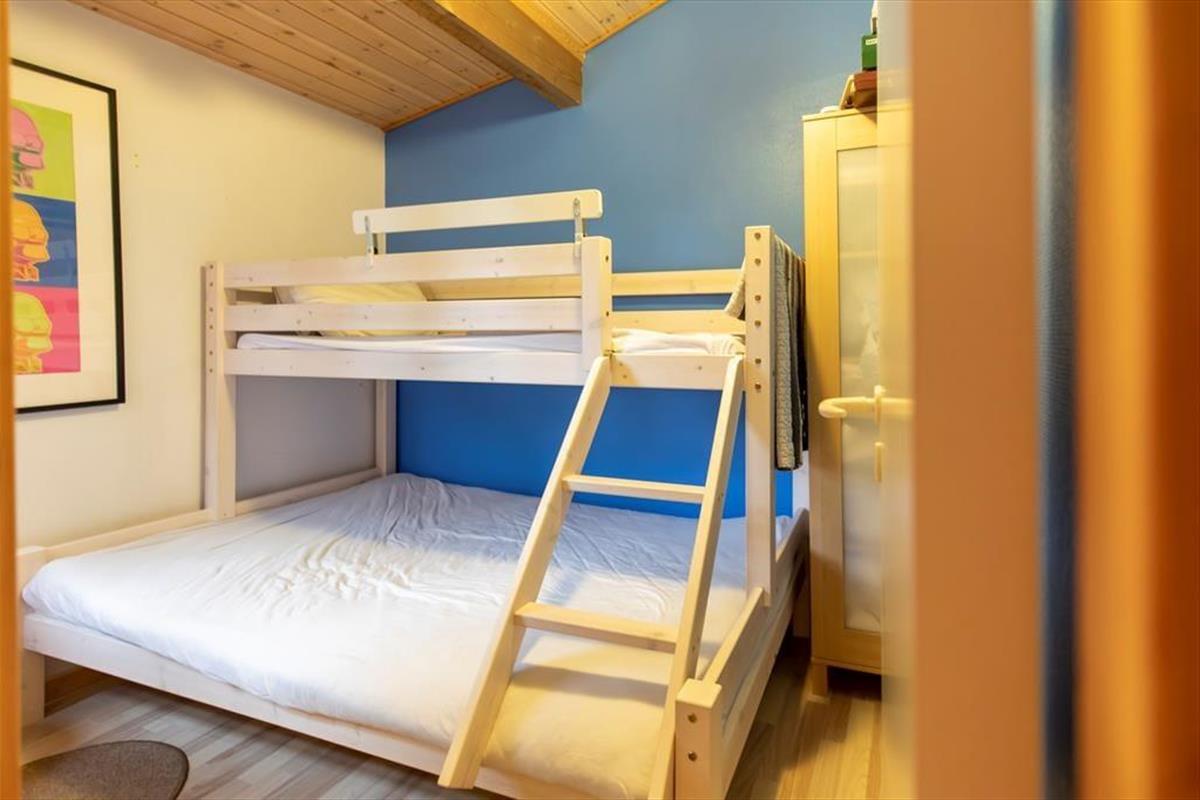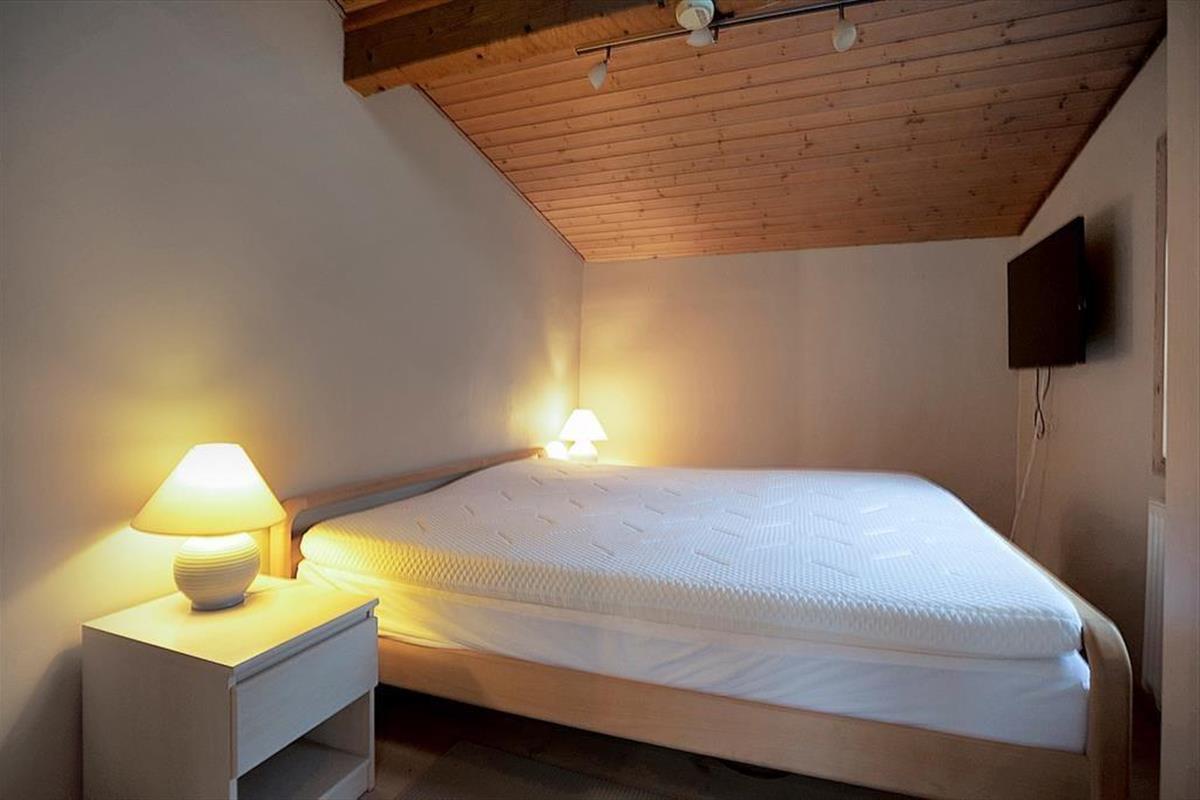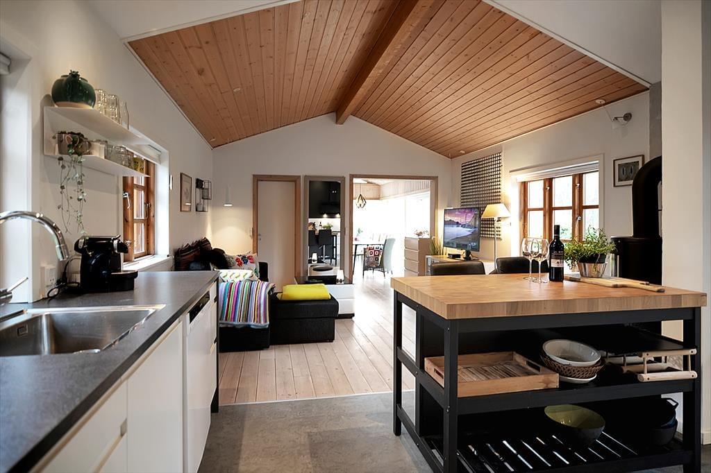 Der Wohnraum deines Ferienhauses ist mittig zwischen der offenen Küche und dem Esszimmer mit langer Fensterfront platziert. Während du das Abendessen zubereitest, den Tisch deckst oder das Feuer im Einbaukaminofen anheizt, genießt du somit zu jeder Zeit die Nähe deiner Lieben, die es sich beispielsweise auf dem Sofa gemütlich gemacht haben. Während du in den Töpfen rührst, leisten dir deine bessere Hälfte oder deine Kinder dank der Barhocker am Küchentresen sicherlich gerne Gesellschaft. Gemeinsame Mahlzeiten am Esstisch werden vom Ausblick in den Garten untermalt. An warmen Tagen stellt ihr während des Essens einfach die Terrassentür weit auf.