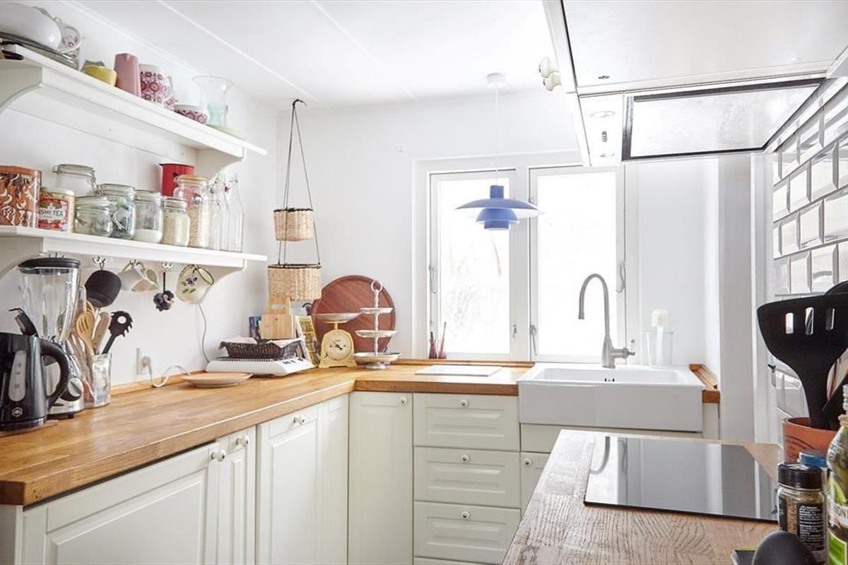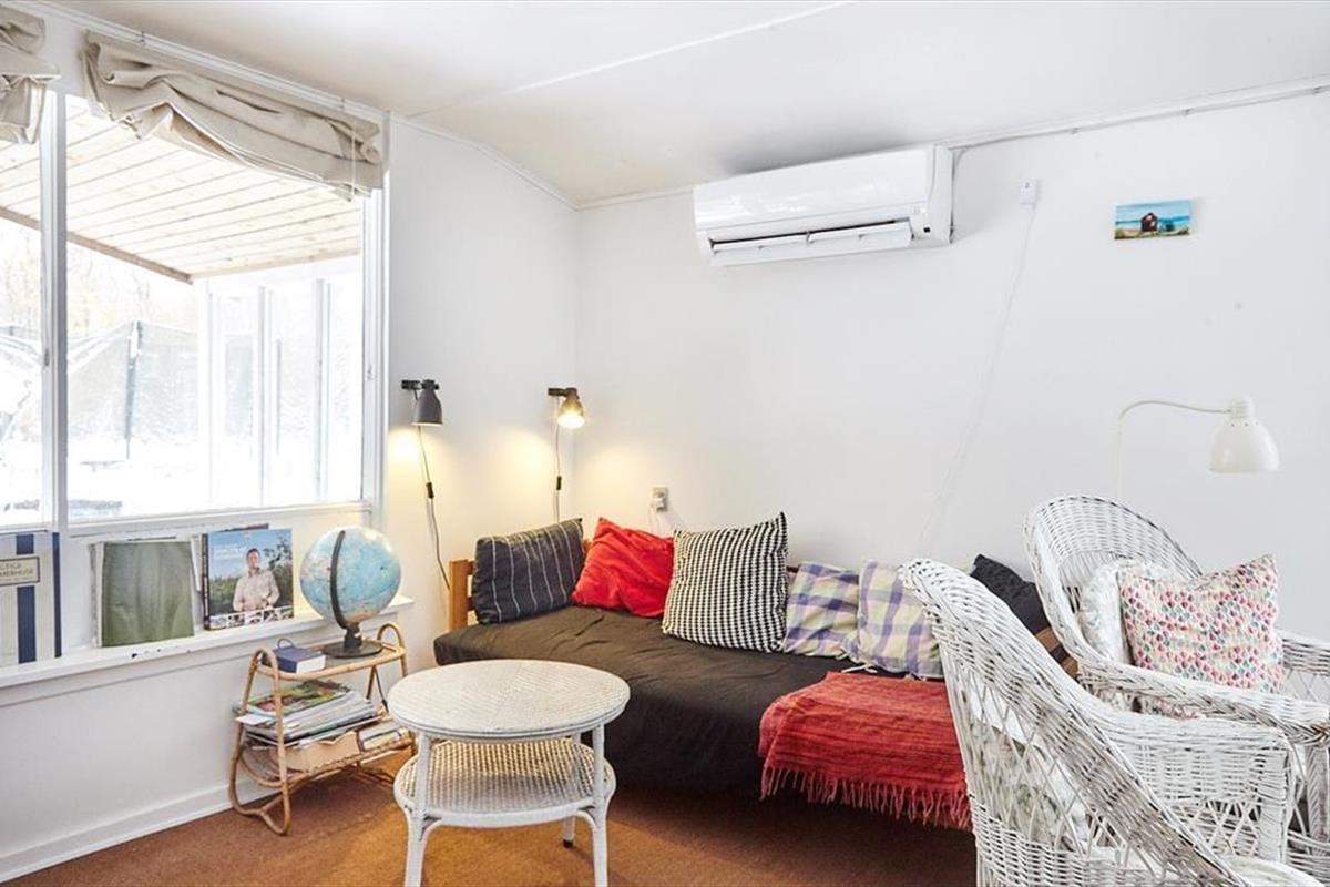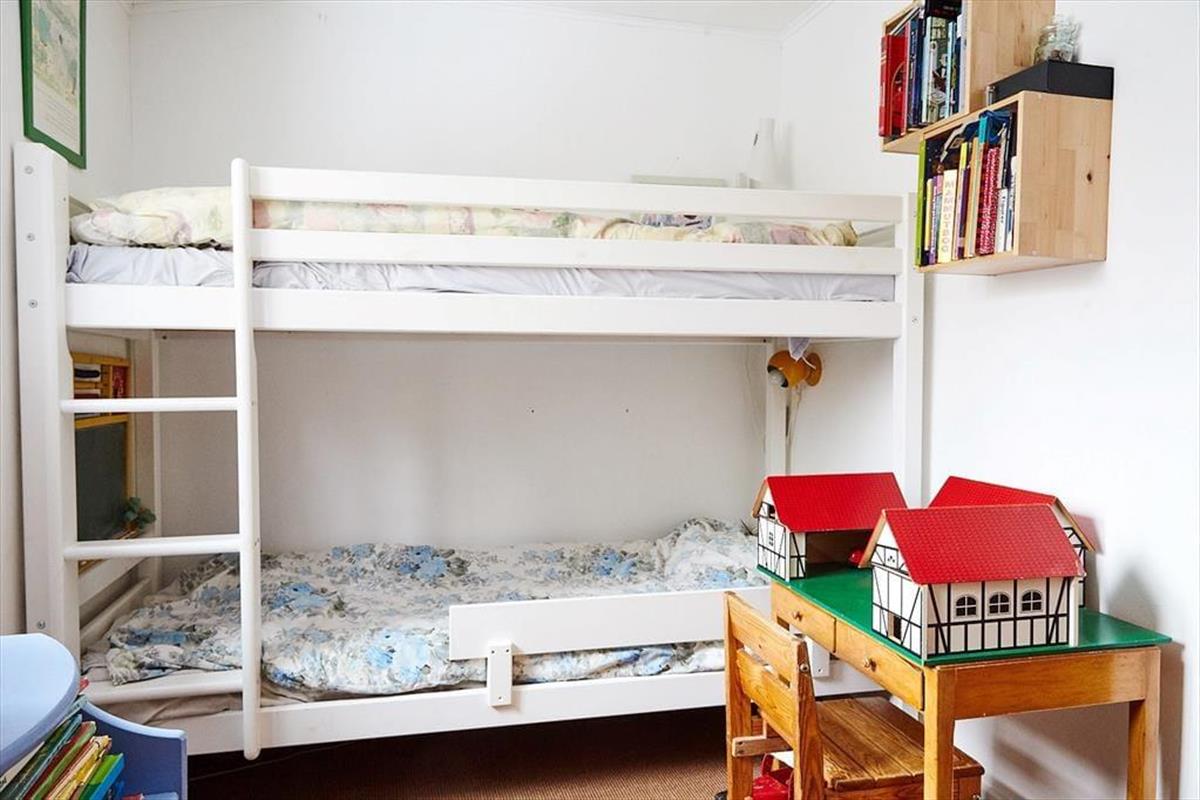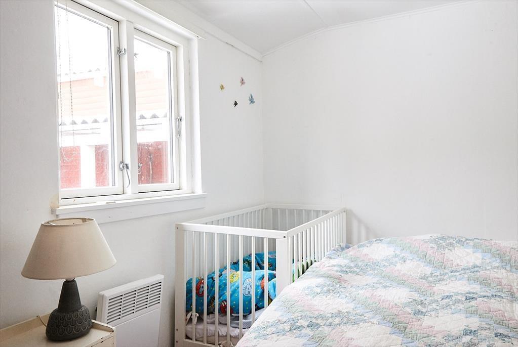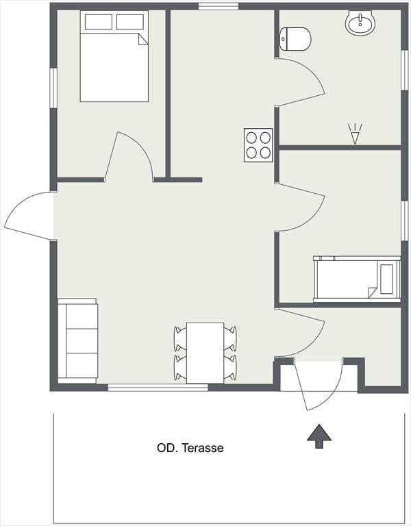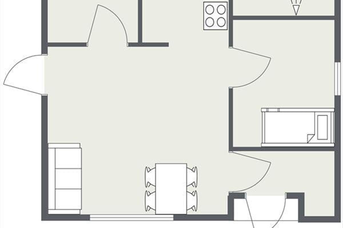 Das Ferienhaus empfängt Sie mit einem Eingangsbereich, von dem Sie in den Wohnraum mit einem Essbereich, einem Kaminofen und einem Zugang zur West-Terrasse gelangen. Das Schlafzimmer für Kinder ist mit einem Etagenbett eingerichtet. Die Küche verfügt über einen Geschirrspüler und über ein Kochfeld mit zwei Kochzonen sowie eine separate Kochplatte.