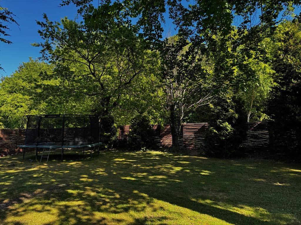 Unter freiem Himmel erwartet dich eine große, nach Südwesten ausgerichtete Terrasse, die viel Platz für ausgedehnte Sonnenbäder und gemeinsame Mittagessen im Freien bietet. Falls es dir in der Sonne zu warm werden sollte, kannst du dich auf der angenehm geräumigen, überdachten Terrasse niederlassen, die direkt vom Wohnraum aus zugänglich ist. Gleiches gilt für die Abendstunden, wenn die Sonne untergegangen ist und sich die Dunkelheit über das Gebiet legt. Während du dich in vollen Zügen auf der Terrasse entspannst, werden deine Kinder vergnügt auf dem Gartentrampolin hüpfen. Im Garten können Kinder und Erwachsene sich bei Gartenspielen und Tischtennis messen oder die Kinder können sich auf dem Trampolin austoben.