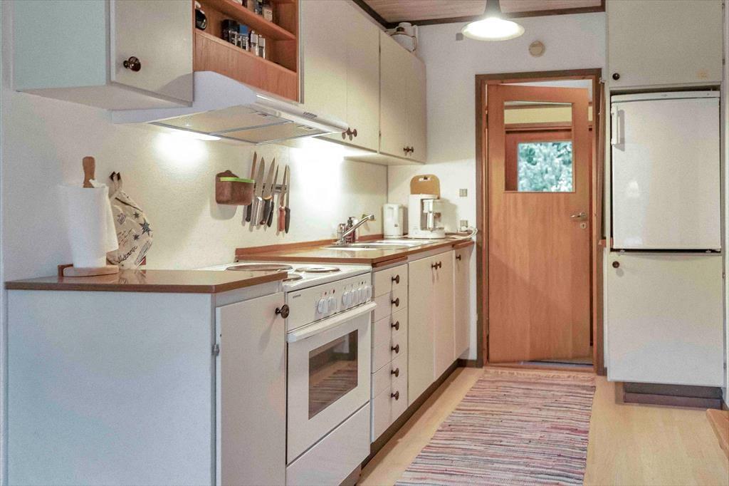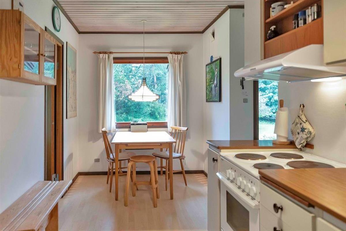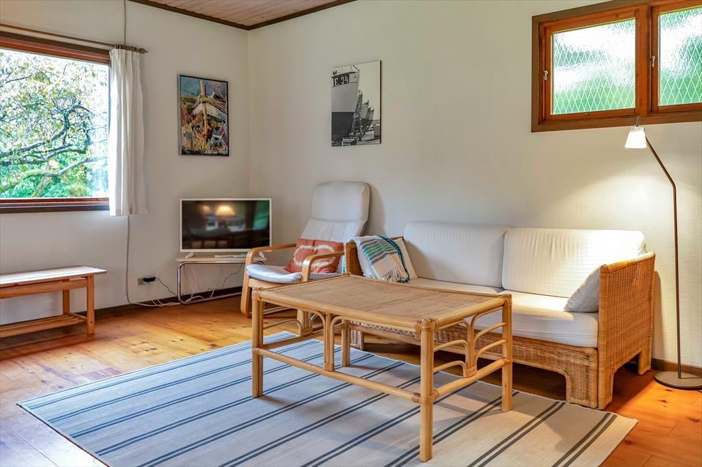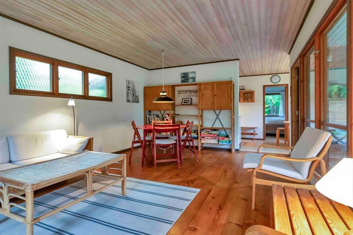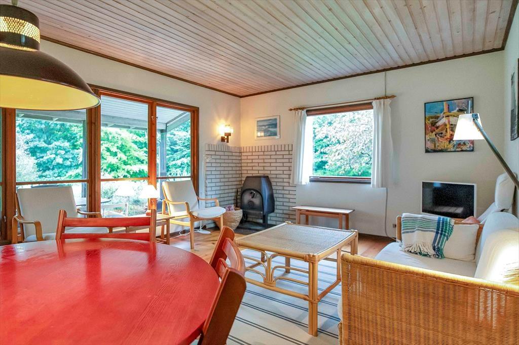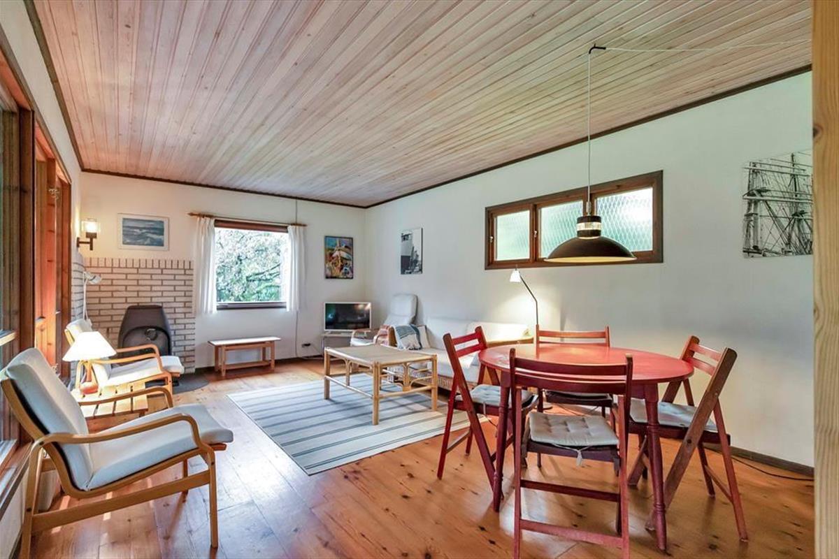 Dein Ferienhaus begrüßt dich mit einer gemütlichen Wohnatmosphäre, die unter anderem durch die breiten Dielenböden und holzvertäfelten Decken geprägt wird. Obwohl das Haus nicht sonderlich groß ist, verwöhnt es mit einer schönen, entspannten Urlaubsstimmung. Der Wohnraum ist der natürliche Sammelpunkt. Hier lässt du mit deinen Lieben am Esstisch die Erlebnisse des Tages Revue passieren - untermalt von der Aussicht auf den Garten, der sich hinter der großen Fensterpartie erstreckt.