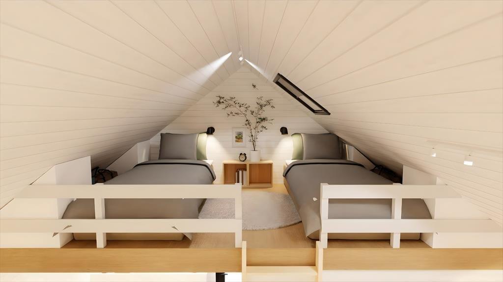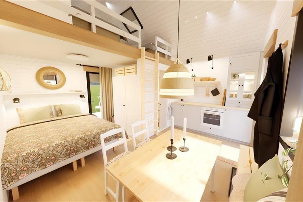 I hytten, vil du med det samme få følelsen af at være velkommen, alt er lyst, nyt, lækkert og særdeles indbydende. Du vil hurtigt få skuldrene ned og mærke, at det endelig er tid til ferie. I den dejlige stue, der er placeret i forbindelse med det åbne køkken, kan I samles omkring spisebordet til et brætspil eller en god frokost. Hvis I rejser som en gruppe, er der i alt 5 hytter til rådighed.