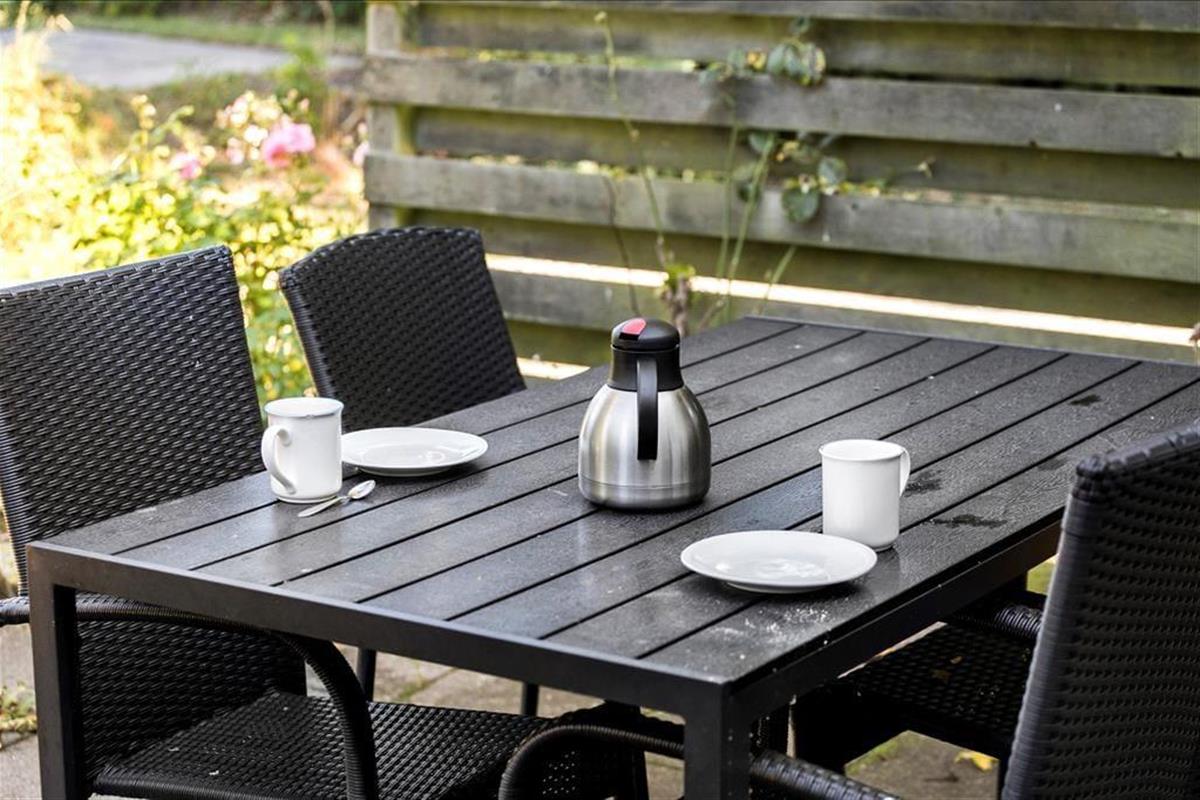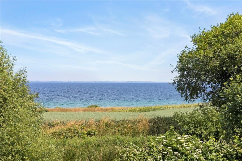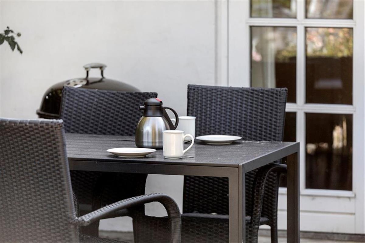 Til Lejligheden er der en grund på 55 m2 med en lille fliseterrasse foran, hvorfra der er udsigt over vandet. Der er havemøbler og grill til rådighed.