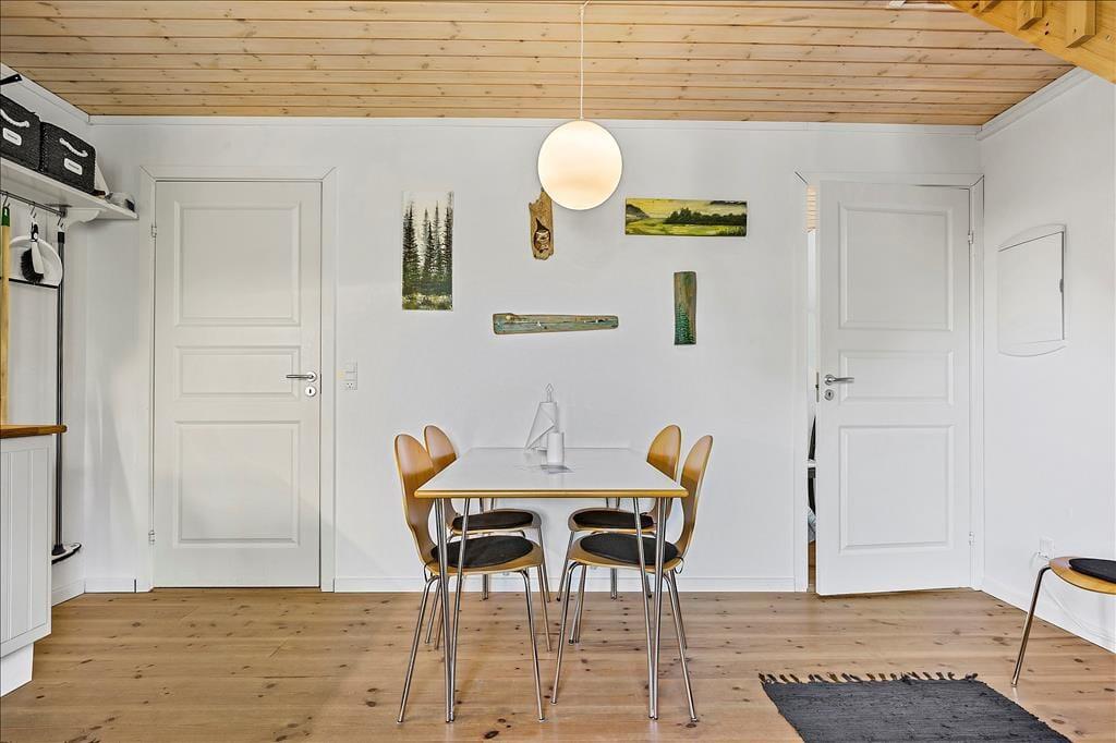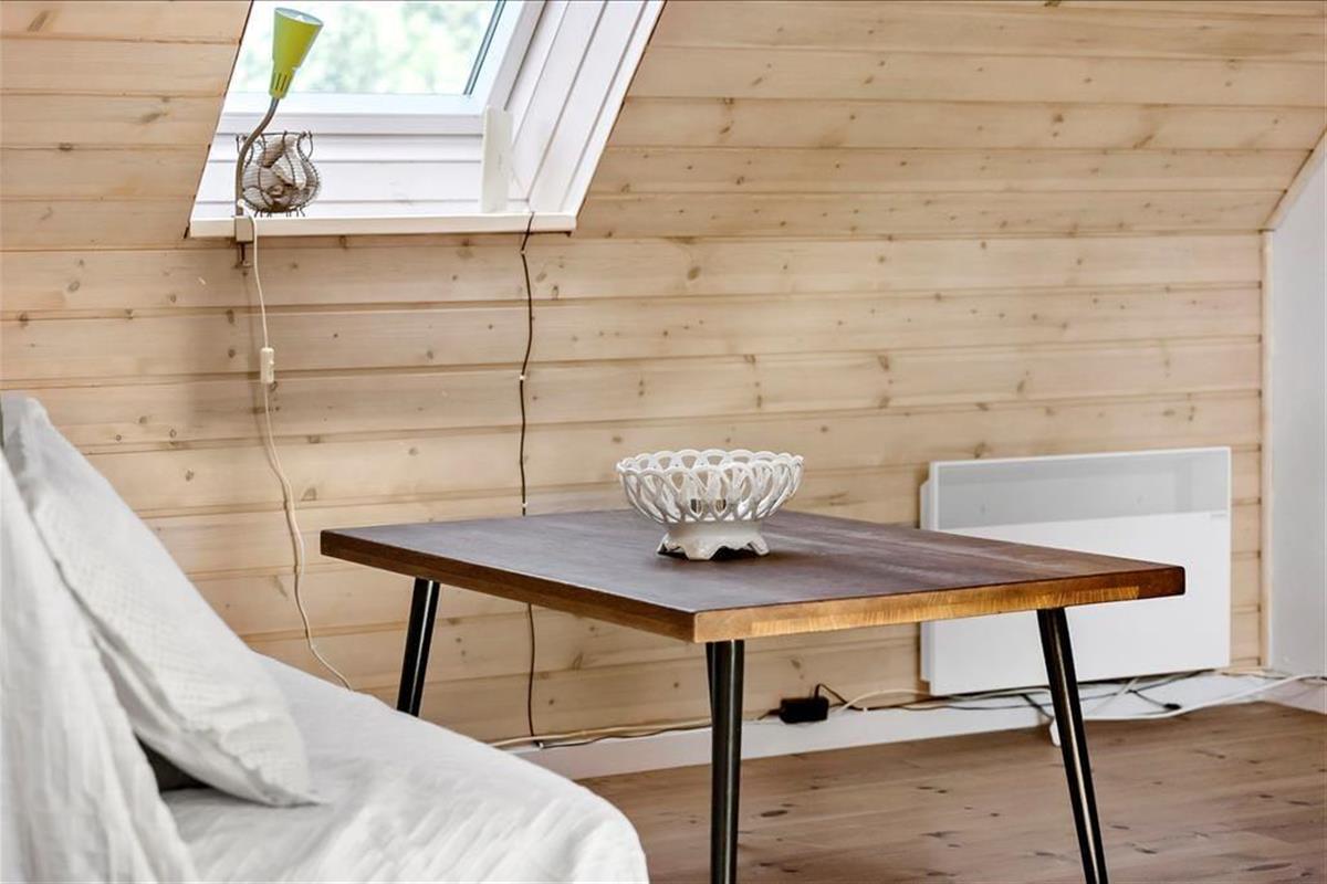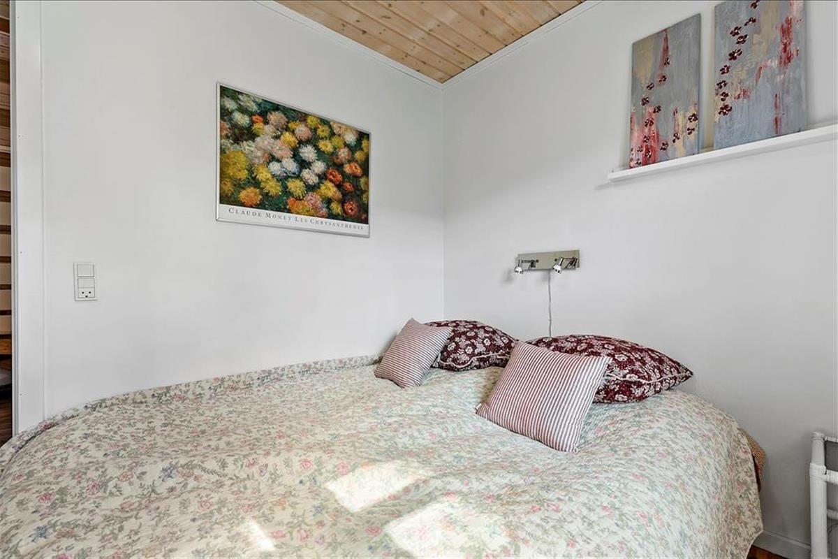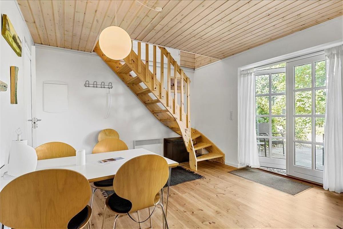 Lejligheden som ligger ved siden af 4 andre ferielejligheder: Den er i 2 plan. I stueetagen er der køkken/alrum, badeværelse, soveværelse med dobbeltseng, samt udgang til terrasse. Køkkenet indeholder køleskab, indbygget ovn og to kogeplader. På 1. sal er der hyggekrog med sofa og kurvestole, tv og to enkeltsenge (soveafdeling kan skilles fra med lamelgardin). Fra vinduet på 1 sal er der en skøn udsigt til vandet. Der er de danske DR TV-kanaler til rådighed. Lejligheden opvarmes med varmepumpe og elvarme.