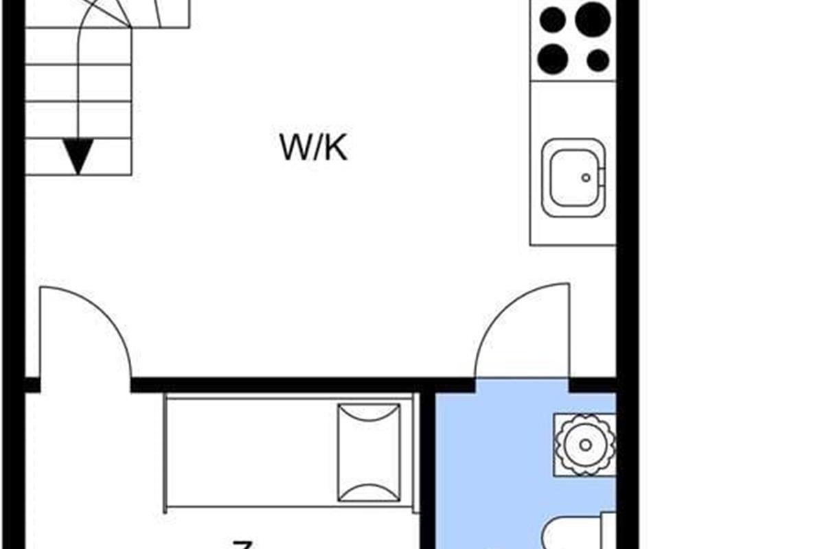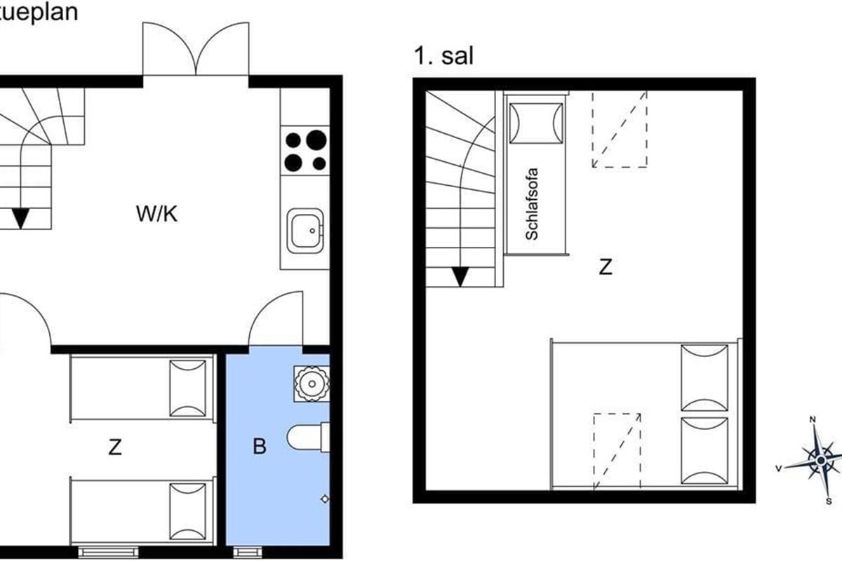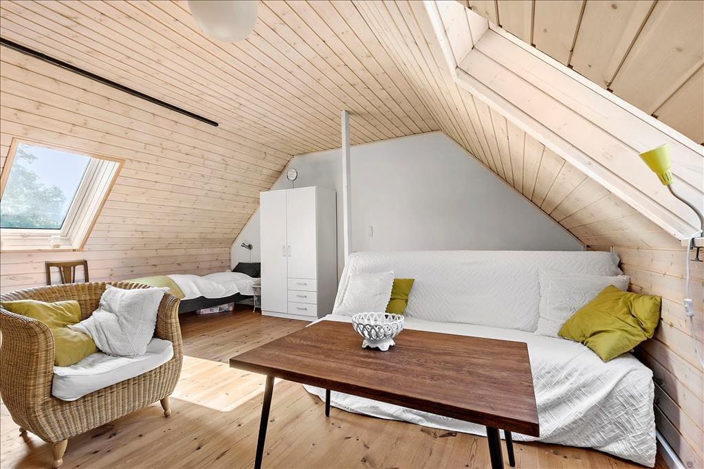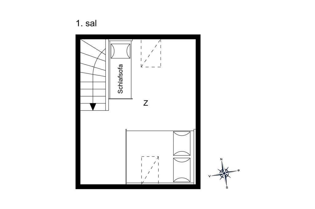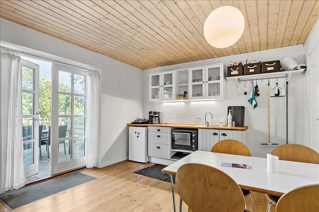 Lejligheden som ligger ved siden af 4 andre ferielejligheder: Den er i 2 plan. I stueetagen er der køkken/alrum, badeværelse, soveværelse med dobbeltseng, samt udgang til terrasse. Køkkenet indeholder køleskab, indbygget ovn og to kogeplader. På 1. sal er der hyggekrog med sofa og kurvestole, tv og to enkeltsenge (soveafdeling kan skilles fra med lamelgardin). Fra vinduet på 1 sal er der en skøn udsigt til vandet. Der er de danske DR TV-kanaler til rådighed. Lejligheden opvarmes med varmepumpe og elvarme.