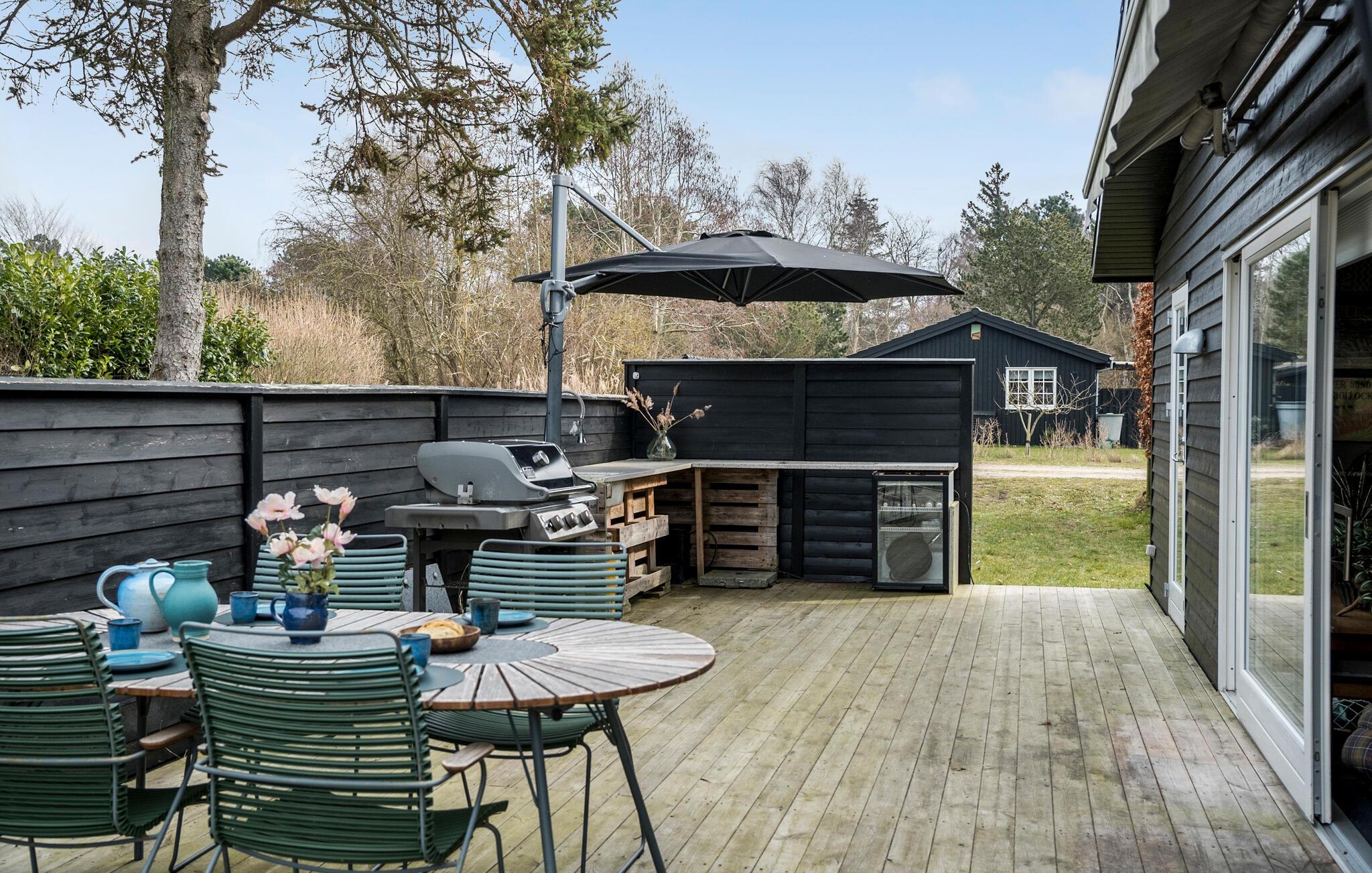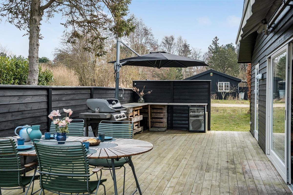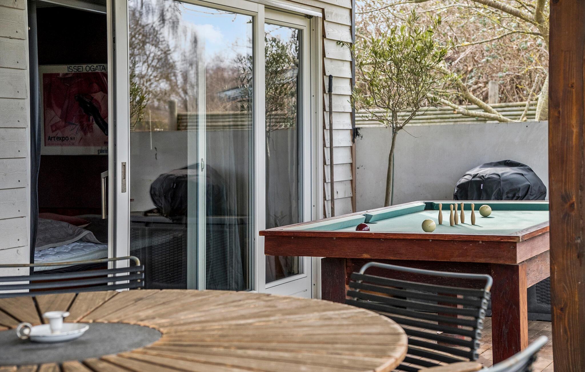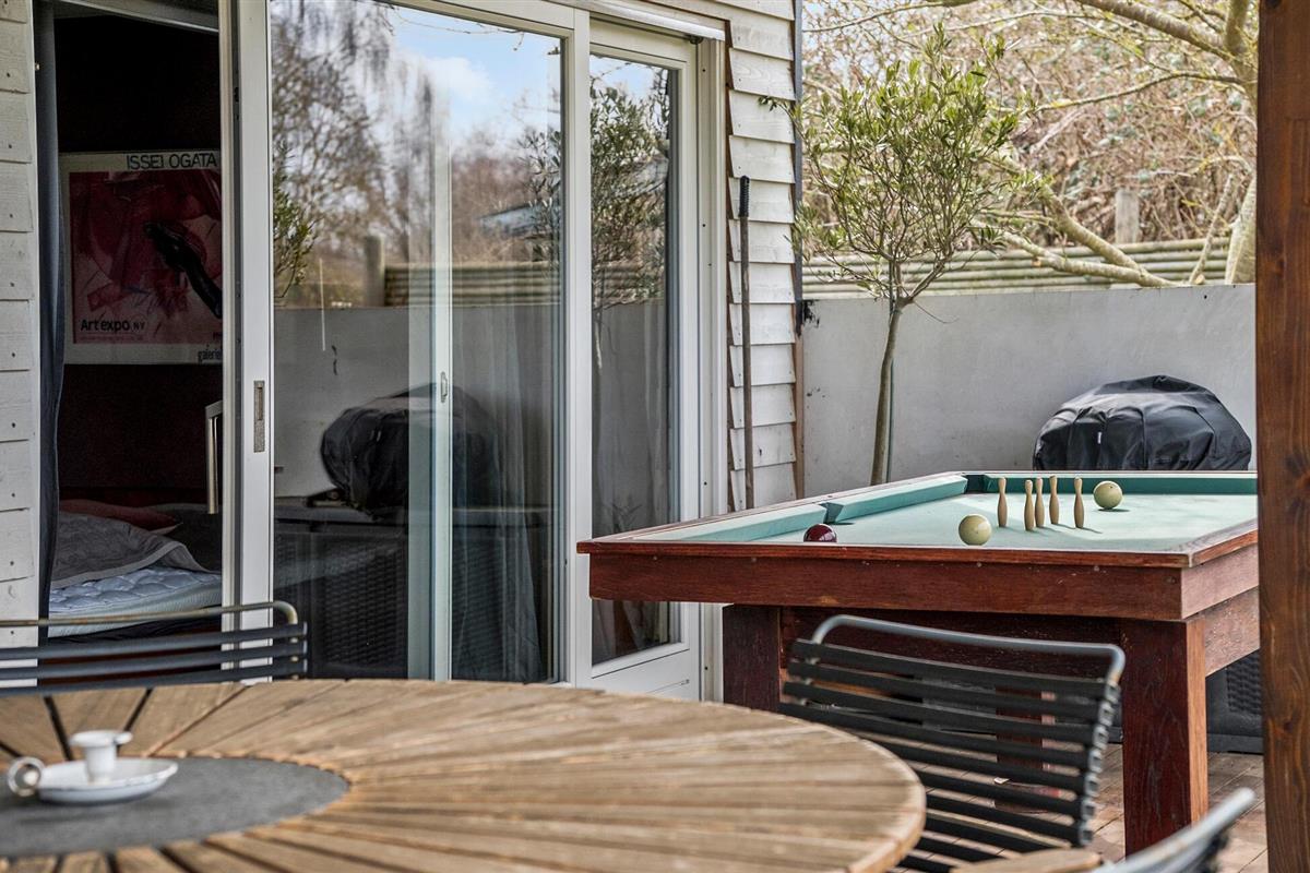 Buiten kun je ontspannende uren doorbrengen op het grote houten terras met barbecue, gezellige zitjes en ligstoelen. Geniet van ontspannen barbecue-avonden, speel buiten een spelletje biljart of organiseer spannende Kubb-wedstrijden in de tuin. Een gezellige open haard in de tuin nodigt uit om de dag samen af te sluiten.