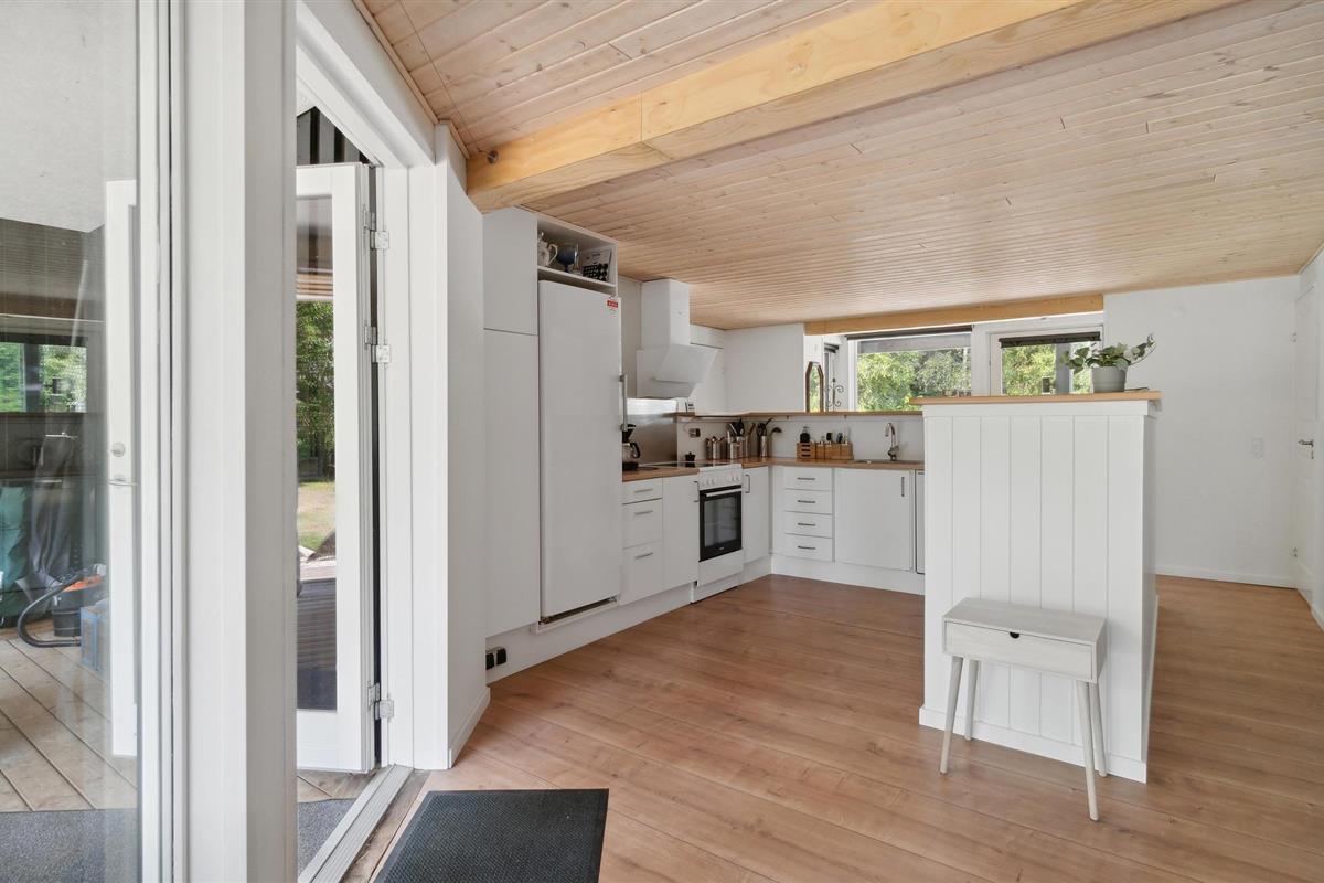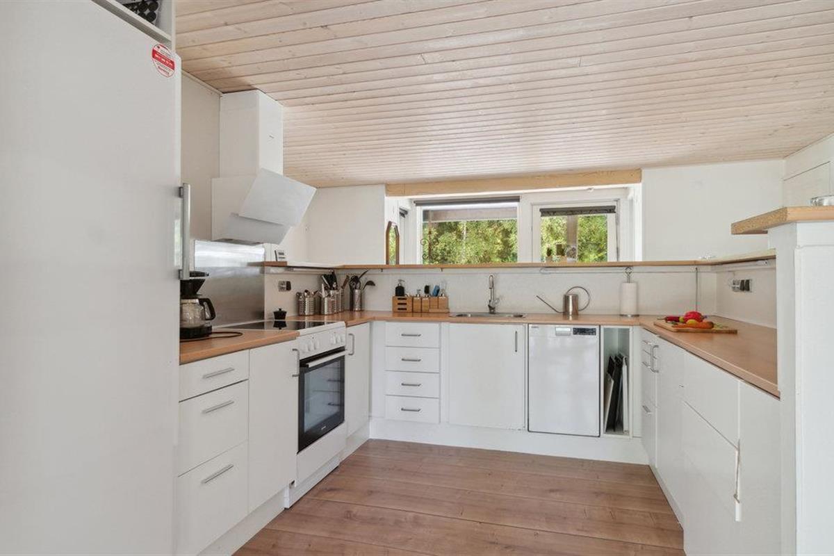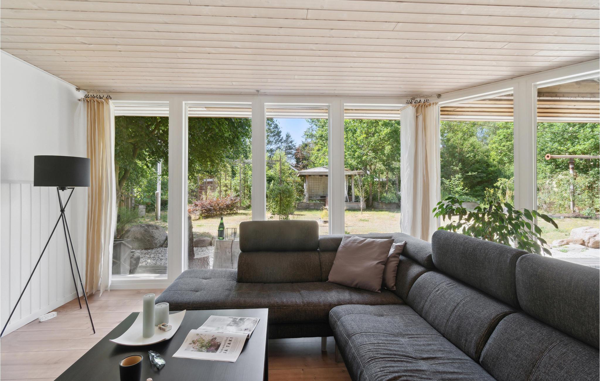 Rustig vakantiehuis in Selkær Mølle met open haard, modern ingerichte keuken en groot gazon voor ontspanning.