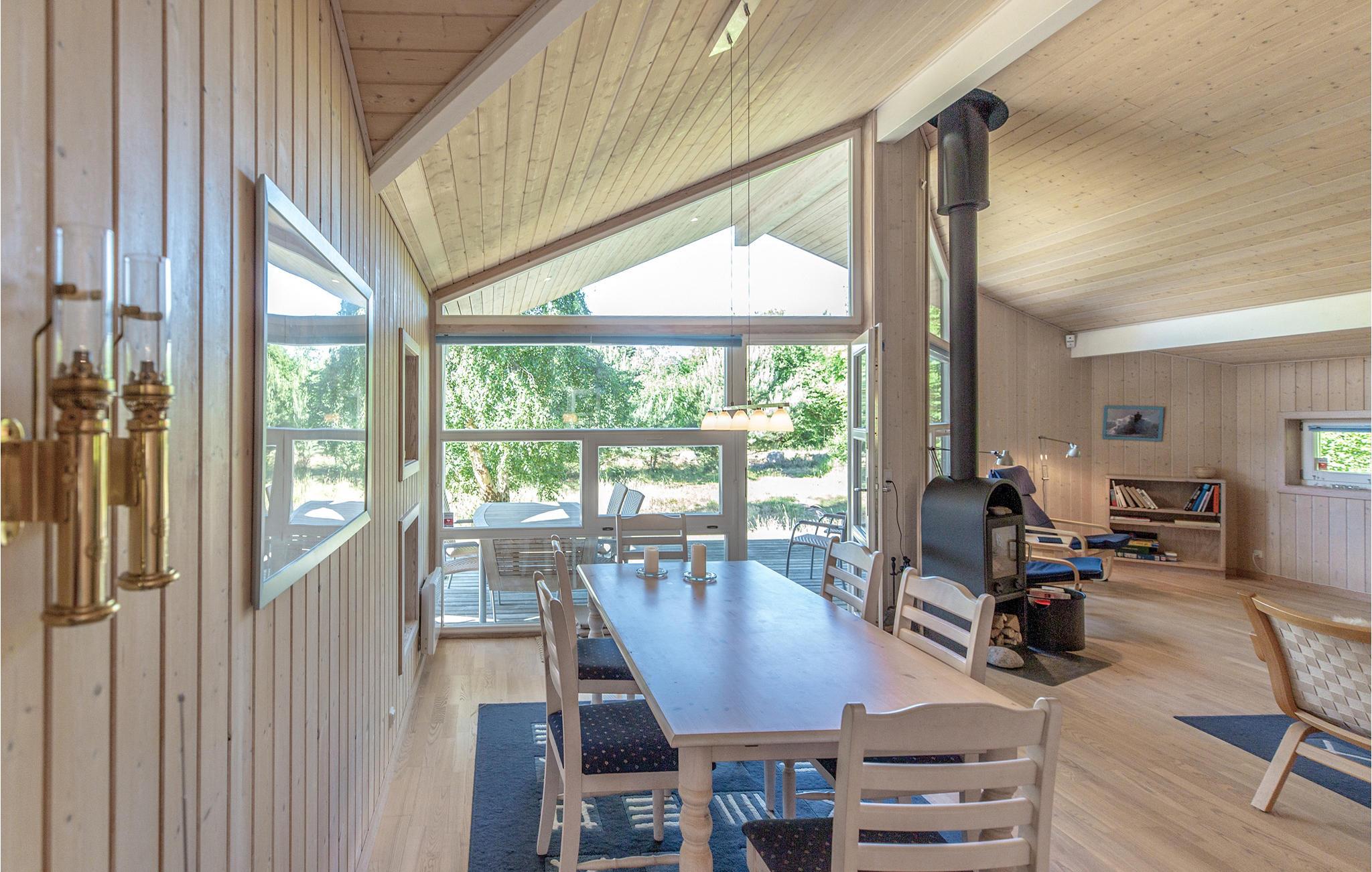 Binnen vindt u een comfortabele woonkeuken met houtkachel, drie slaapkamers en een slaapzolder. De twee badkamers zijn luxe uitgerust, waaronder een met massagebad en sauna. Het huis biedt een unieke combinatie van comfort en natuurschoon, ideaal voor een ontspannen vakantie.