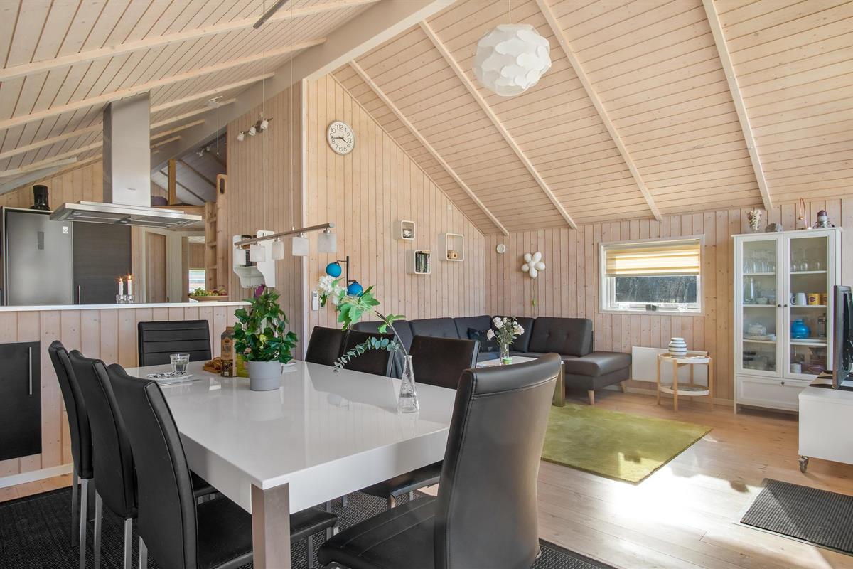 De lichte kamers in dit comfortabele huis zijn perfect om te ontspannen met het hele gezin. De houten lambrisering en moderne inrichting creëren een huiselijke sfeer, terwijl de glazen pui veel natuurlijk licht binnenlaat. Kook hier met uitzicht op de tuin, geniet samen van maaltijden aan de lange eettafel, ook met een prachtig uitzicht op de tuin. Maak het je later gemakkelijk op de bank, na een heerlijke vakantiedag op het strand of tijdens een excursie, kun je 's avonds de houtkachel aansteken en nog lang gezellig bij elkaar zitten.