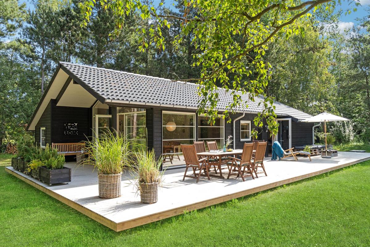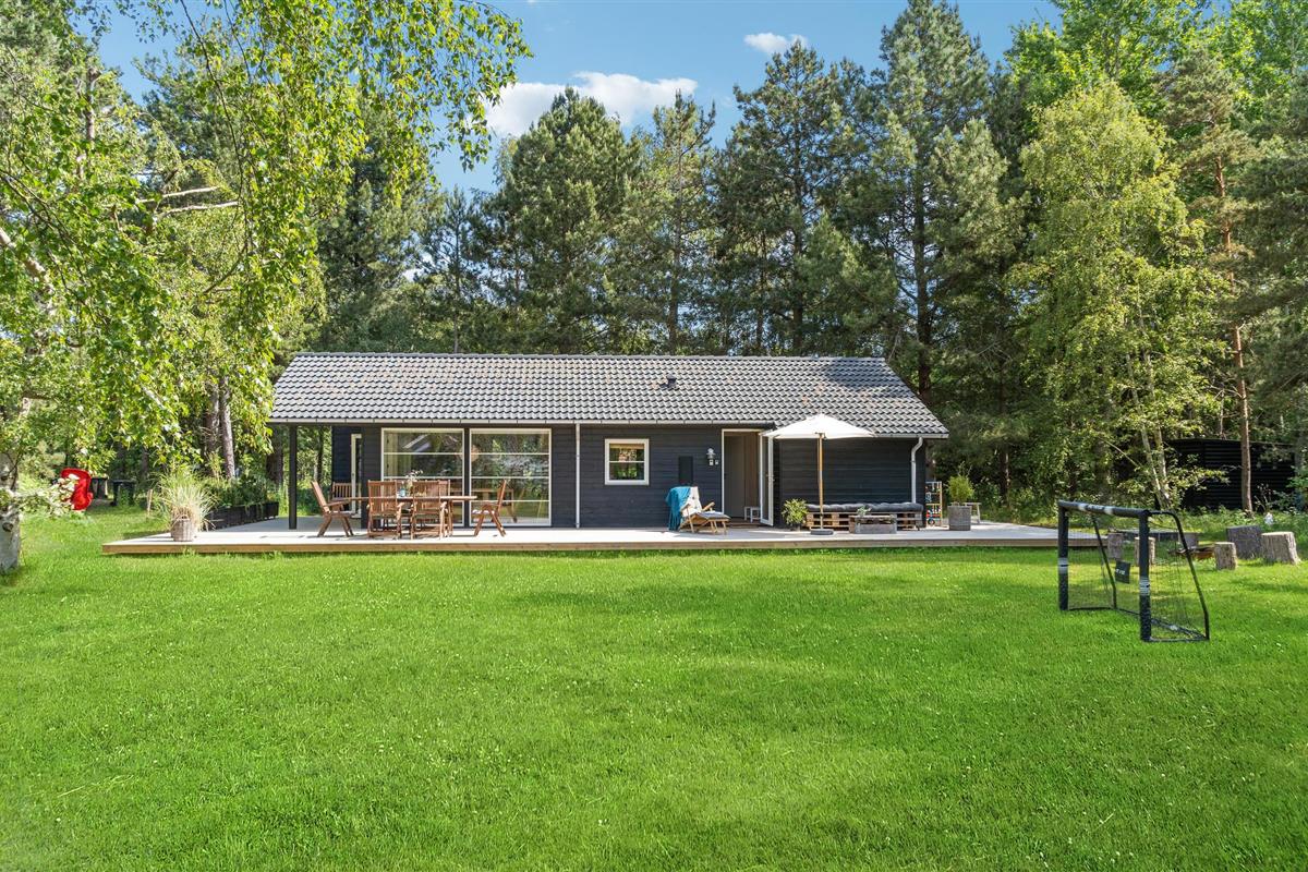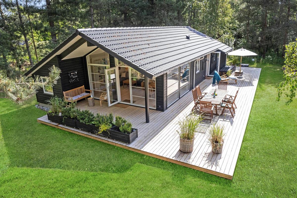 Modern houten vakantiehuis op Sjællands Odde, dicht bij zee, met terras, tuin en speelvoorzieningen voor kinderen.