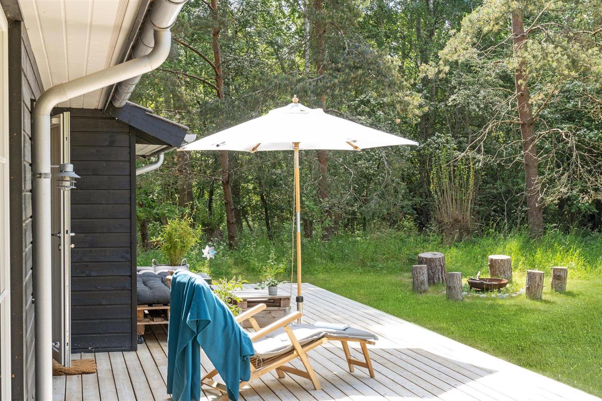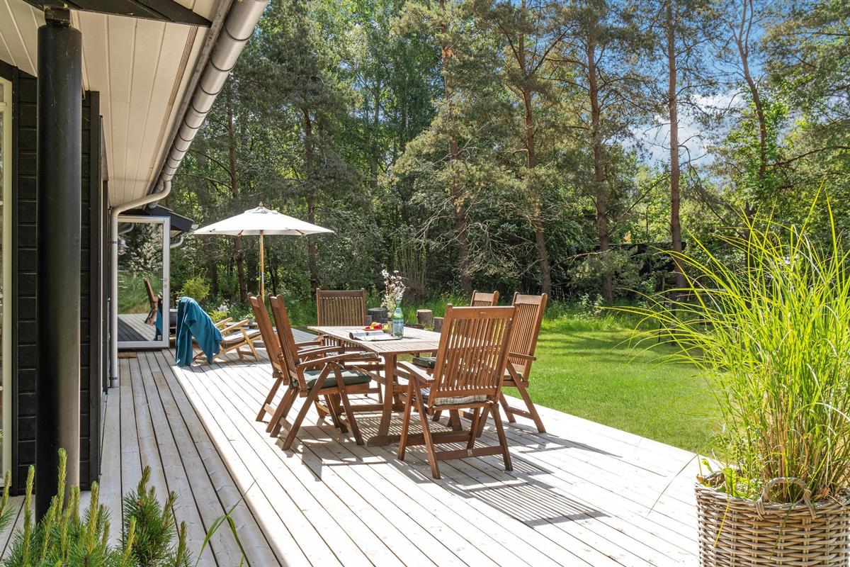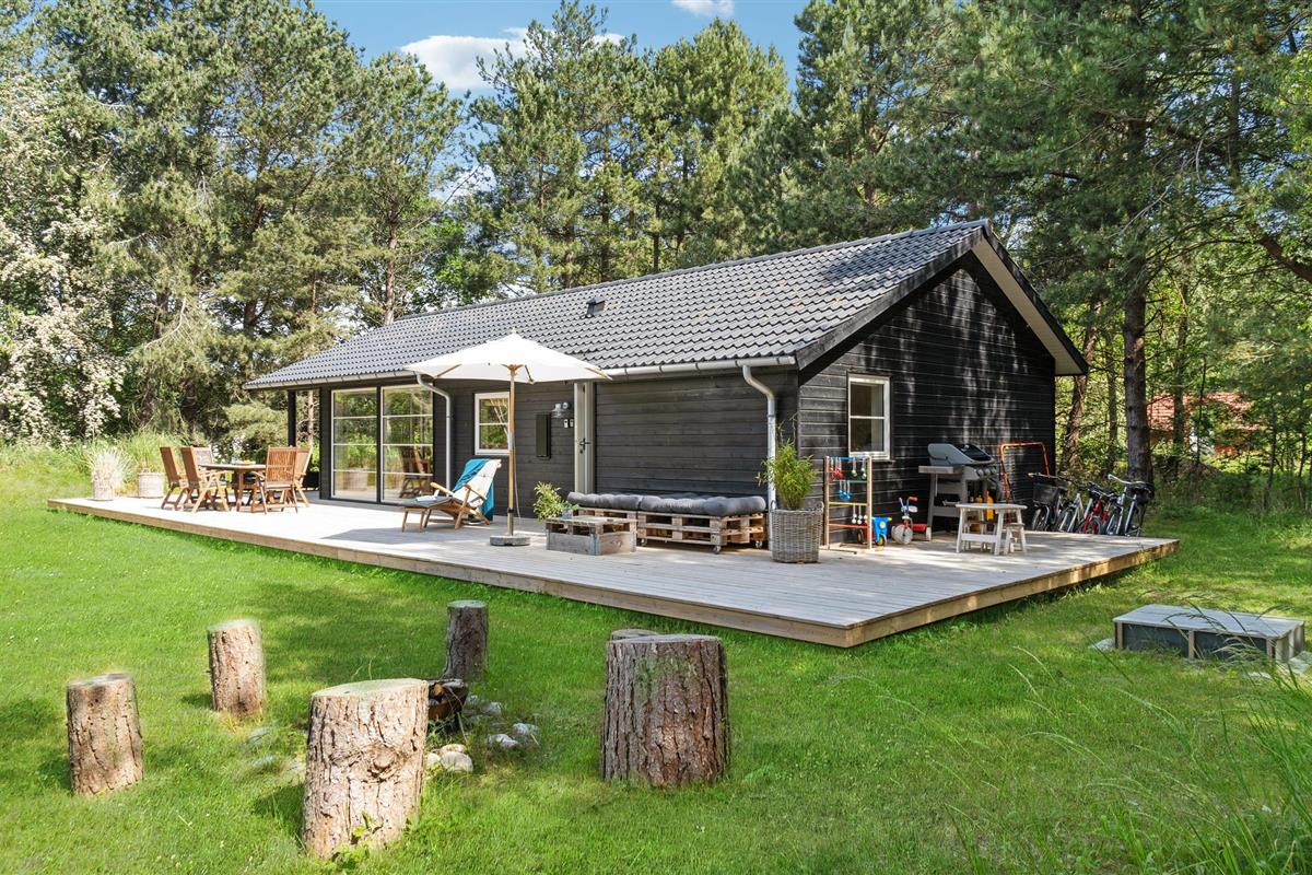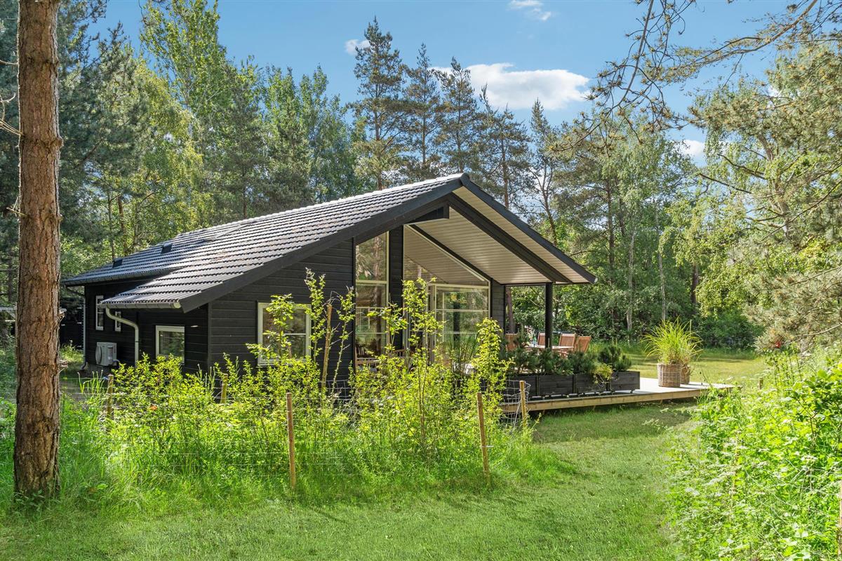Modern houten vakantiehuis op Sjællands Odde, dicht bij zee, met terras, tuin en speelvoorzieningen voor kinderen.