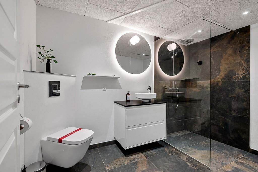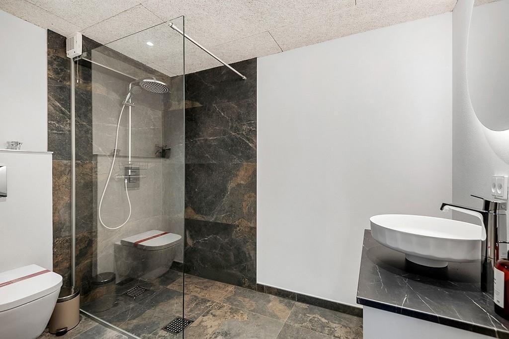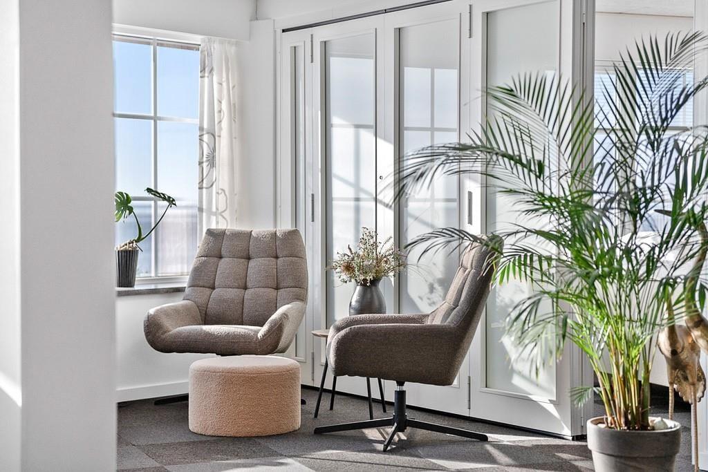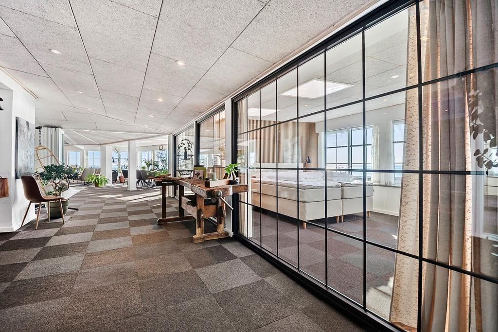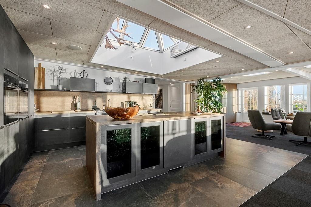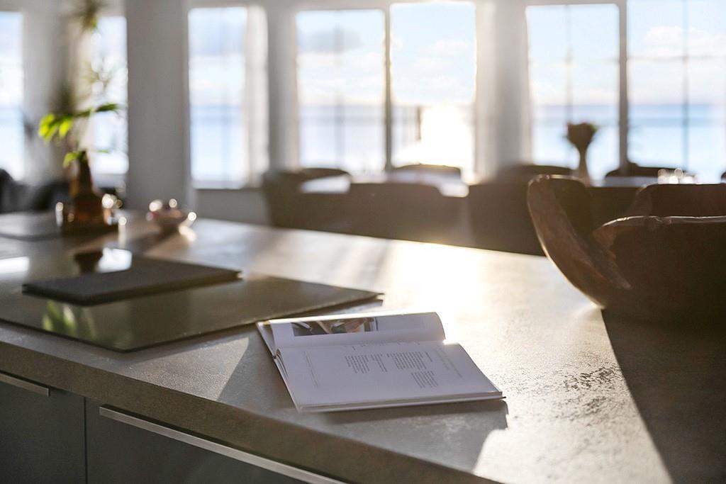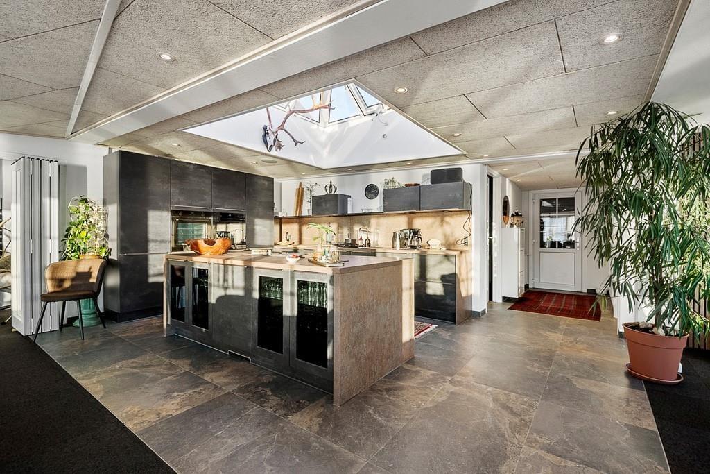 Im Inneren erwartet dich ein hochwertiges Wohnküchen-Ensemble, in dem das Licht durch die Oberlichter einfällt und den Raum hell, offen und einladend wirken lässt. Hier gibt es viel Platz, um sich beim Kochen und bei gemeinsamen Mahlzeiten zu versammeln, während Gespräche ganz natürlich zwischen Küche und Essbereich fließen. Der gesamte Wohnbereich bietet Panoramablick und schafft eine stimmungsvolle Kulisse für lange Abendessen und gemütliche Abende, bei denen das sanfte Licht und die Natur draußen ein fester Teil des Erlebnisses sind. Das Ferienhaus verfügt über angenehme Schlafbereiche, die durch eine New-Yorker-Wand mit Vorhängen vom Wohnraum getrennt sind, sowie über mehrere Badezimmer, sodass alle entspannt und komfortabel in den Tag starten können – auch wenn ihr mit vielen Personen anreist. Wenn der Körper nach zusätzlicher Entspannung verlangt, kannst du die wohltuende Wärme der Infrarotsauna genießen, bevor du es dir auf dem Sofa gemütlich machst, eine Runde im Aktivitätsraum spielst oder zur Ruhe kommst – mit Blick auf das Wasser.