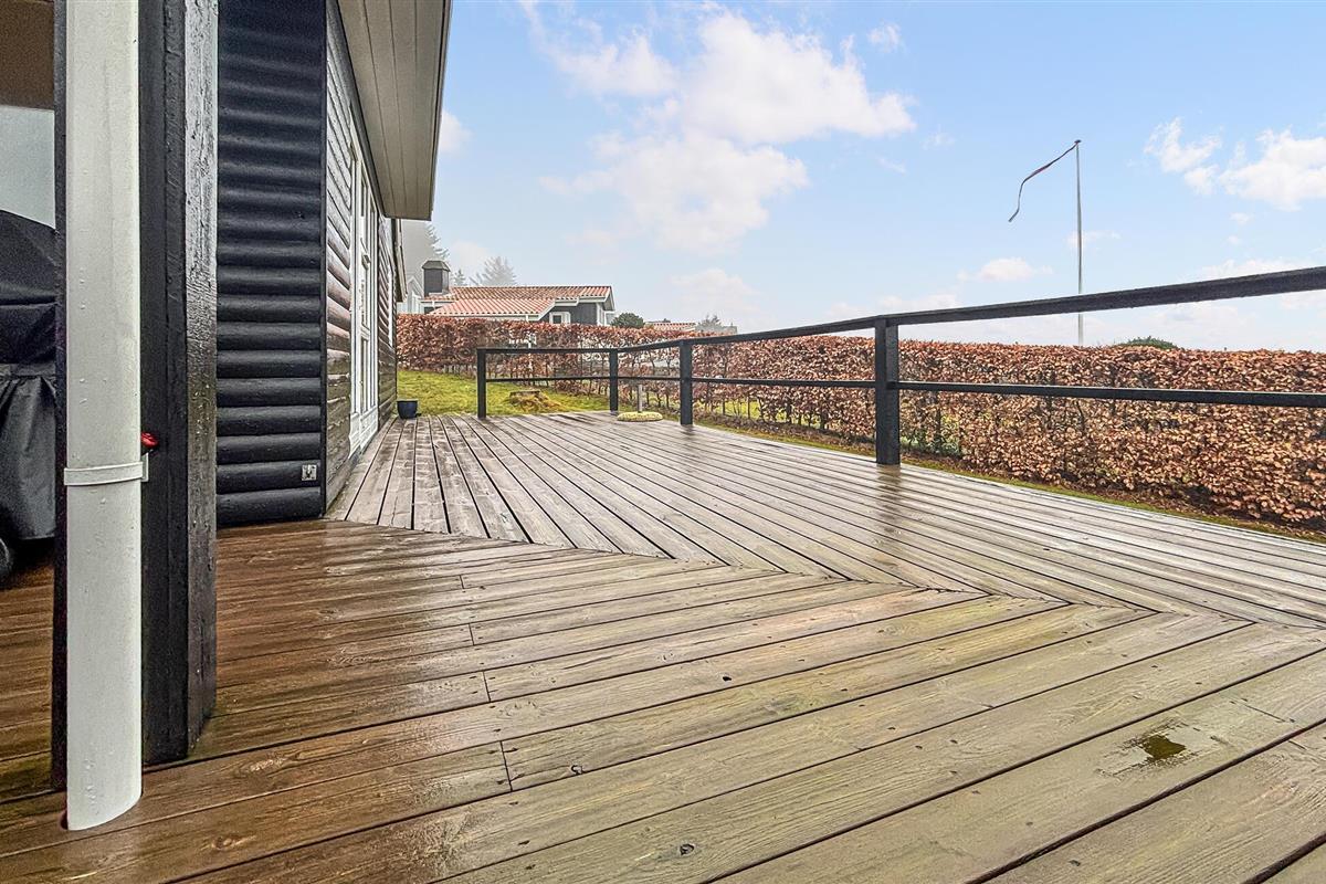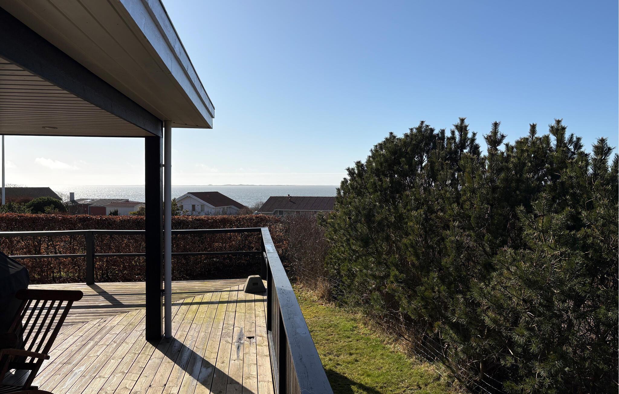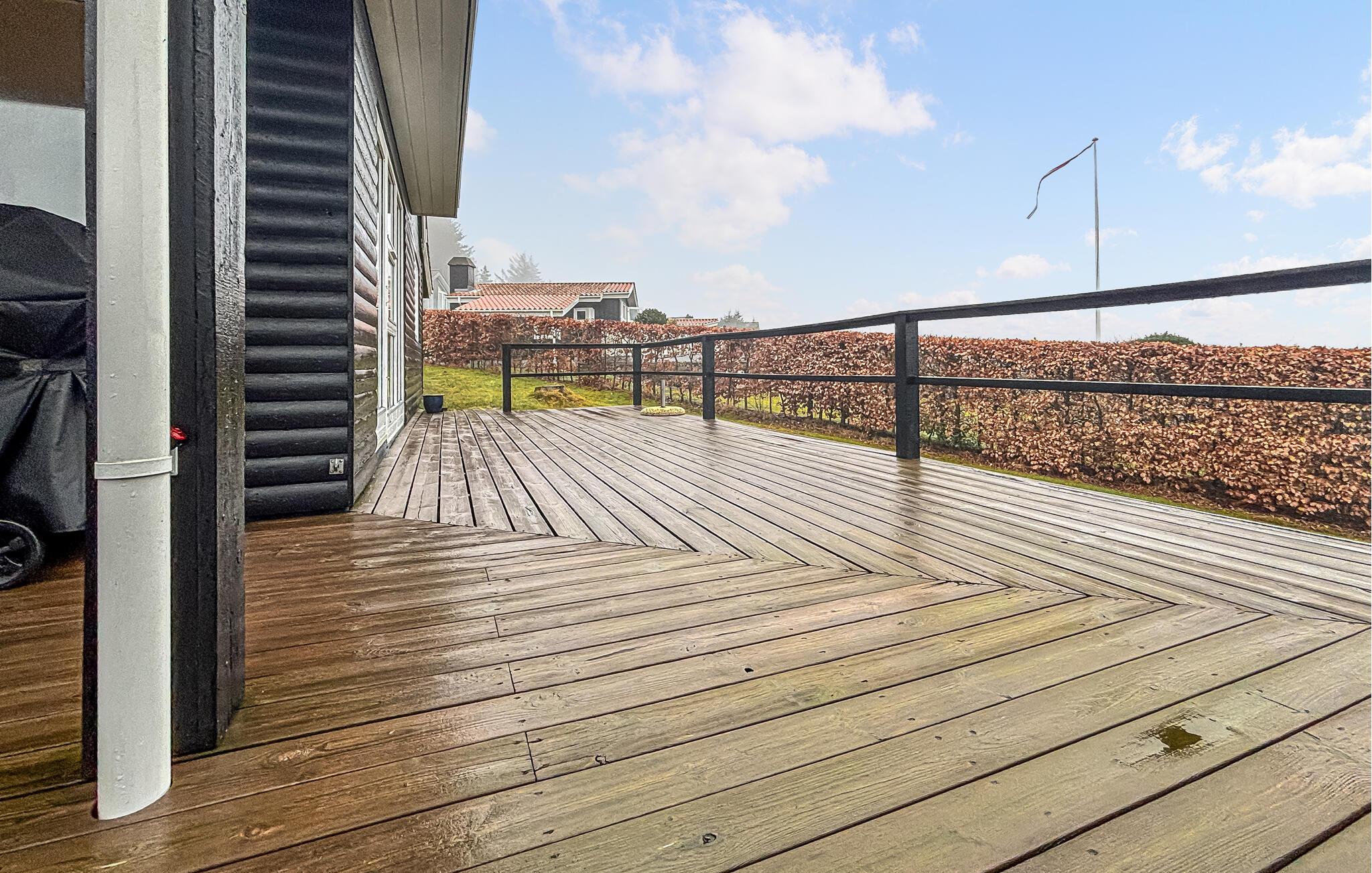 Open de deur naar het ruime houten terras dat het huis omringt. Neem plaats in een ligstoel en geniet van de frisse lucht. Gebruik de barbecue voor een gezamenlijke maaltijd in de open lucht. De goed onderhouden tuin biedt ruimte om te spelen of te ontspannen en wordt afgeschermd door heggen voor privacy.