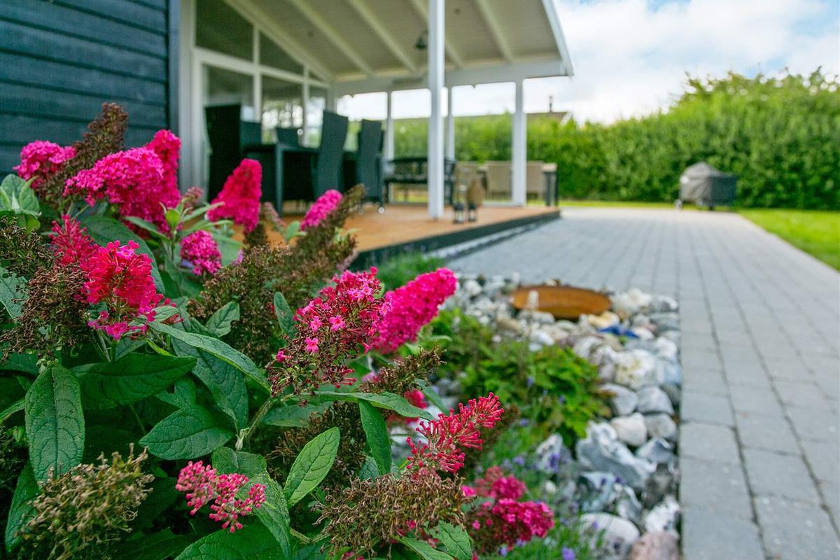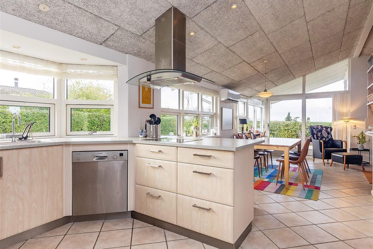Die Küche hat eine gute Arbeitsfläche, einen Heißluftofen mit Grillfunktion sowie eine Spülmaschine. Das Haus hat drei Schlafzimmer und zudem einen Alkoven. Es steht auf einem 710 m² großen, abgeschirmten Naturgrundstück, nur wenige Gehminuten von einem guten und kinderfreundlichen Badestrand entfernt.