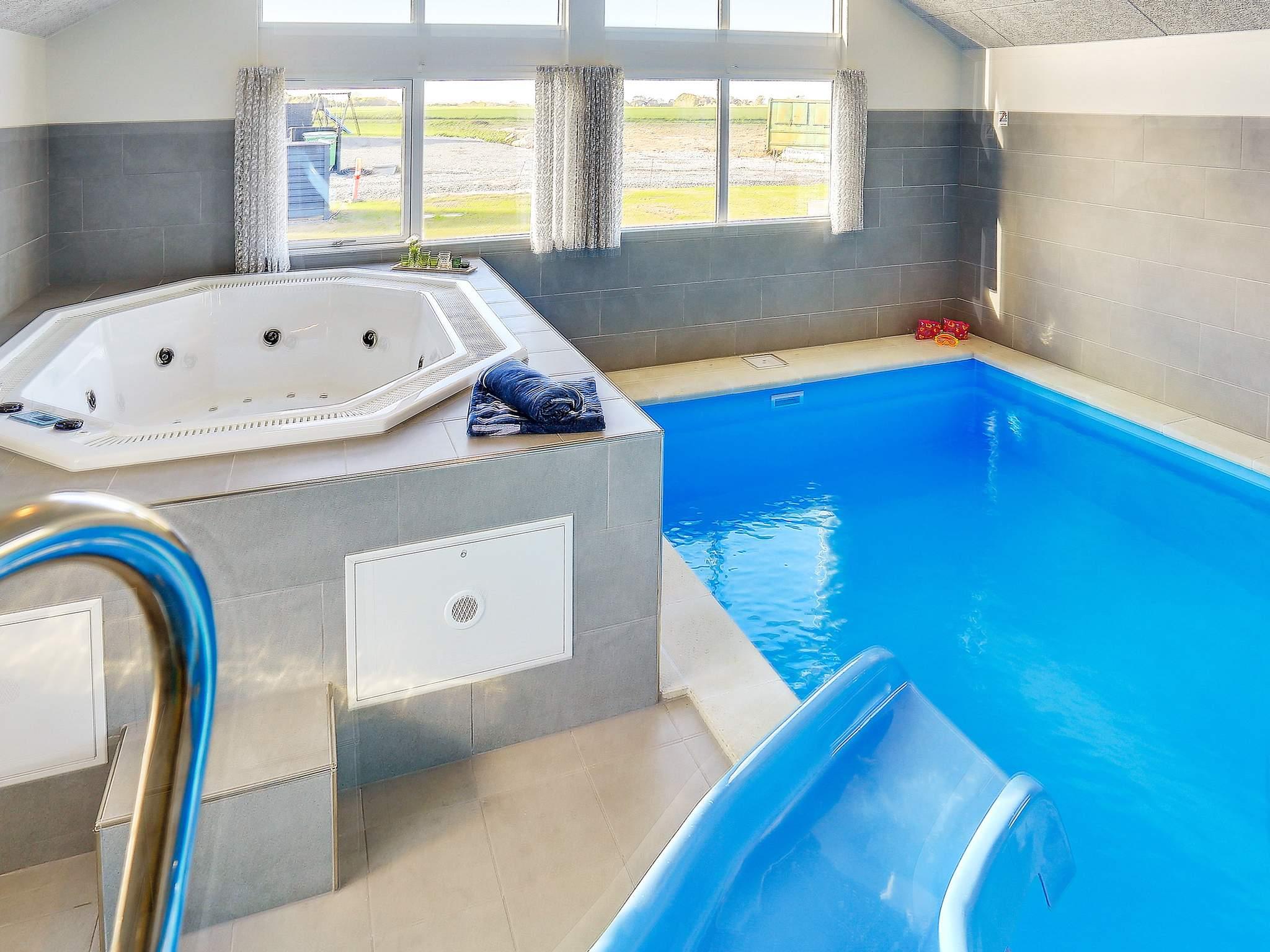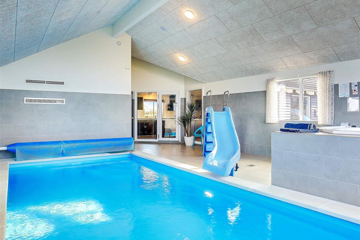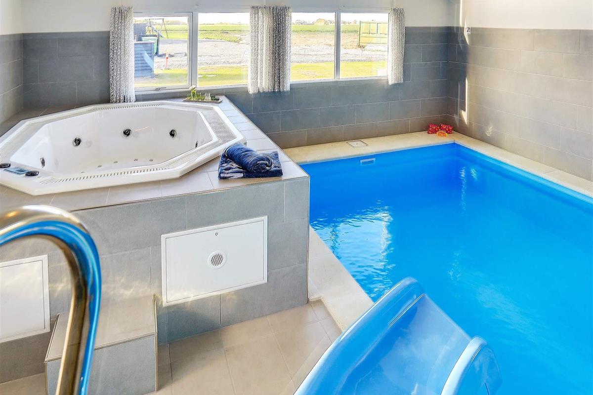 Genießen Sie im Poolbereich des Hauses, mit seinem 23 m² großen Pool mit Wasserrutsche und Gegenstromanlage, entspannte Stunden mit der ganzen Familie. Für die gewisse Portion Wellness sorgen gleich im Anschluss daran der Whirlpool oder die Sauna, beide für max. 6 Personen.