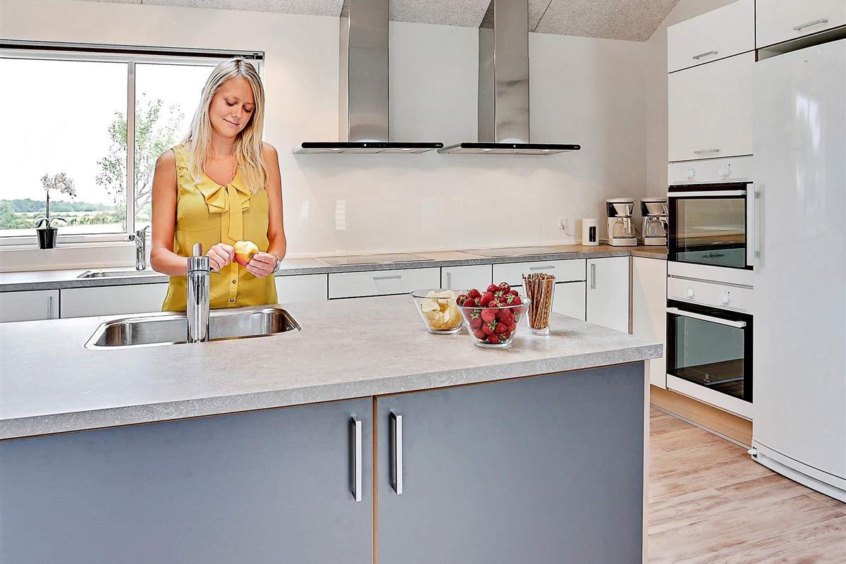 Die Küche, von der aus Sie ein wenig vom Meer erahnen können, verfügt u.a. über zwei Kühlschränke, einen großen Gefrierschrank, zwei Ceranfeldherde, zwei Spülen sowie zwei Spülmaschinen.