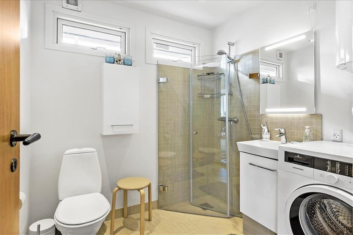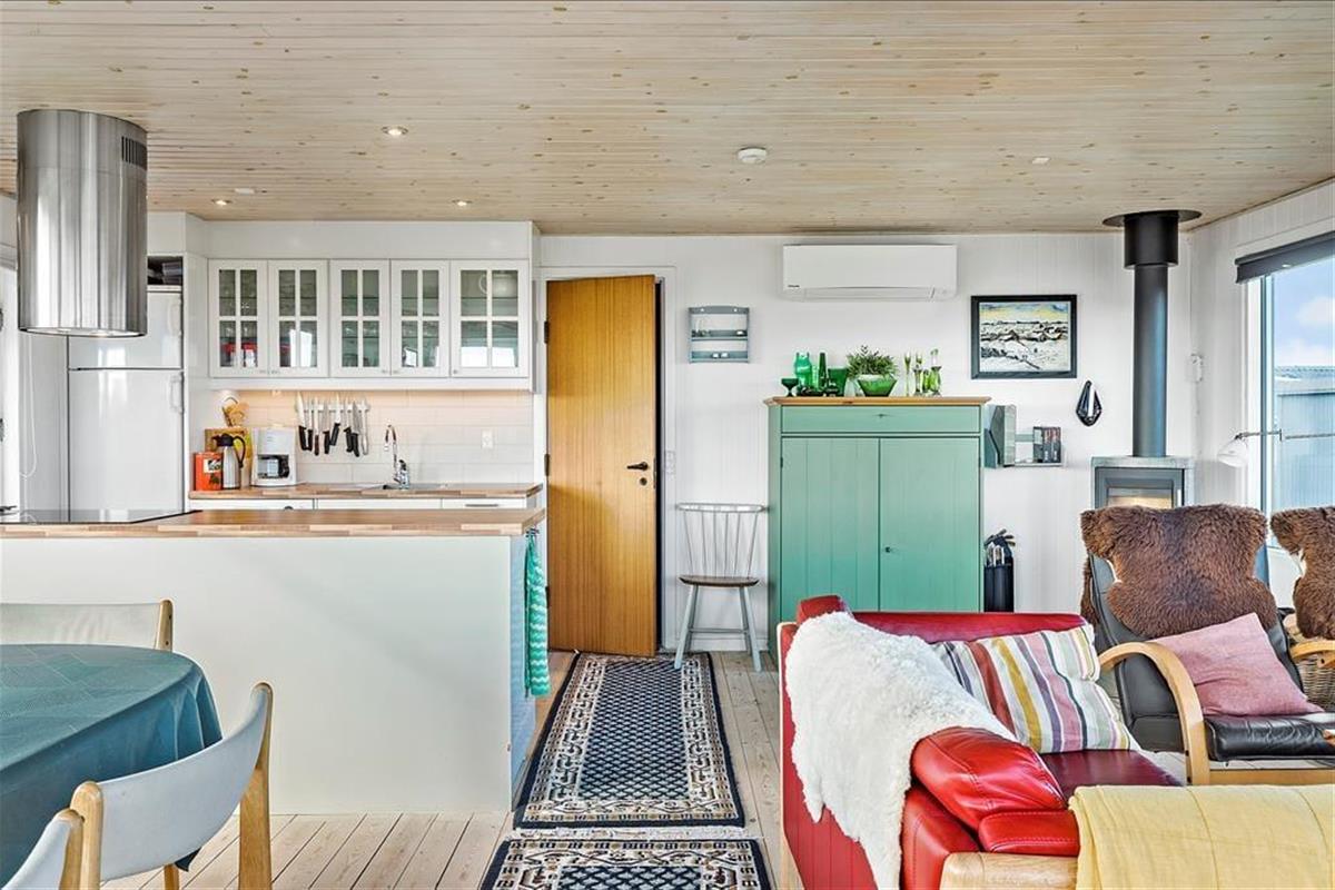 Das Innere des Ferienhauses strahlt Gemütlichkeit und Charme aus. Die offene Küche mit Essbereich ist das Herz des Hauses, wo der Kaminofen im Wohnzimmer Wärme und eine stimmungsvolle Atmosphäre verbreitet. Große Fensterwände auf drei Seiten des Raumes sorgen für einen schönen Lichteinfall und ermöglichen es dir, den Meerblick zu genießen, während du die Mahlzeiten zubereitest oder bei einer Tasse Kaffee am Esstisch entspannst. Das Wohnzimmer ist mit bequemen Möbeln und einem einladenden Blick auf das Meer und die umliegenden Felder ausgestattet, was es zum perfekten Ort macht, um mit einem guten Buch zu entspannen oder einen gemütlichen Filmabend zu verbringen. Das Badezimmer ist sowohl praktisch als auch stilvoll mit einer schönen Duschkabine und einer Waschmaschine eingerichtet, sodass auch die praktischen Aufgaben einfach und bequem erledigt werden können.