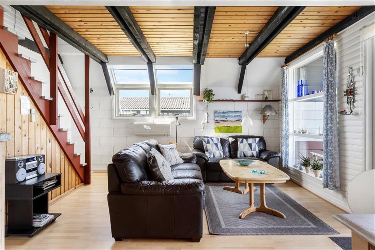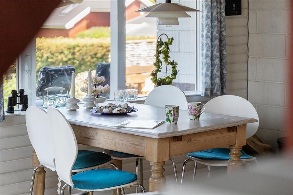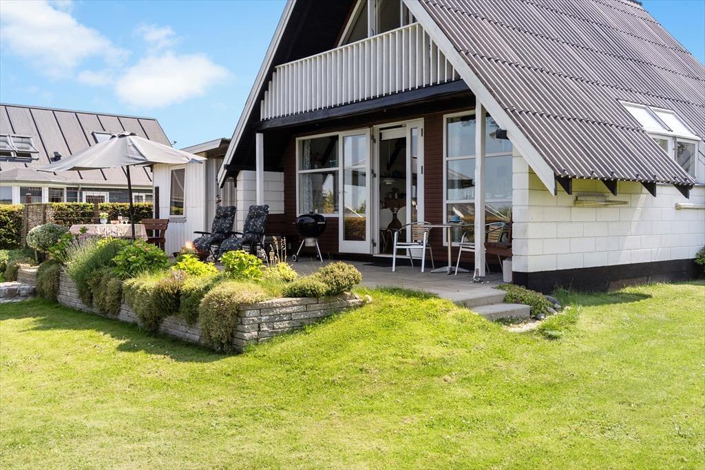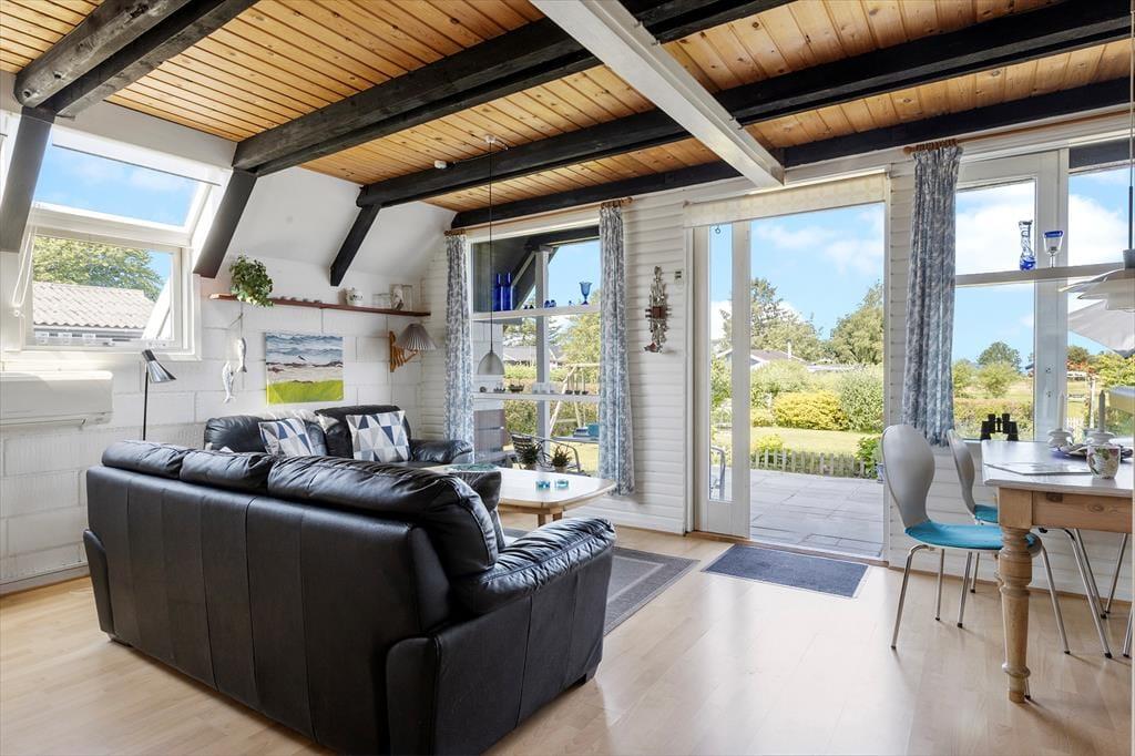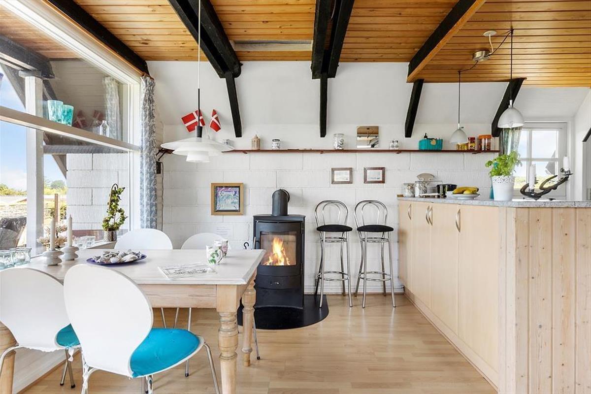 Beim Betreten des Ferienhauses werden Sie sofort von einer warmen und einladenden Atmosphäre empfangen. Das gemütliche Wohnzimmer und die offene Küche/Essbereich sind so gestaltet, dass sie die Familie zusammenbringen. Hier können Sie leckere Mahlzeiten zubereiten und die gemeinsame Zeit am Esstisch genießen, während der Kaminofen an kühleren Abenden für eine gemütliche Stimmung sorgt. Vom Wohnzimmer aus haben Sie direkten Zugang zur schönen Terrasse, wo Sie den Morgenkaffee in den Sonnenstrahlen genießen oder die Familie zum Grillen am Abend einladen können. Das Ferienhaus verfügt über zwei schöne Schlafzimmer, die Platz für eine erholsame Nachtruhe bieten, sowie ein Schlafsofa im Wohnzimmer für zusätzliche Gäste. Im Obergeschoss finden Sie ein weiteres Wohnzimmer mit Zugang zum Balkon, der einen fantastischen Blick auf das Wasser bietet – der perfekte Ort zum Entspannen und für schöne Momente.