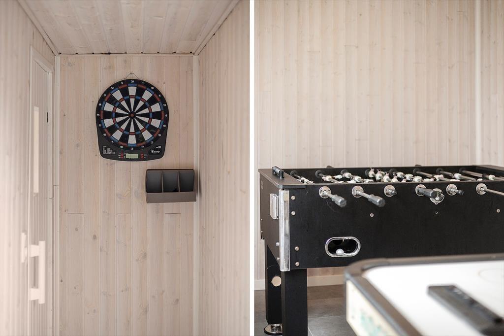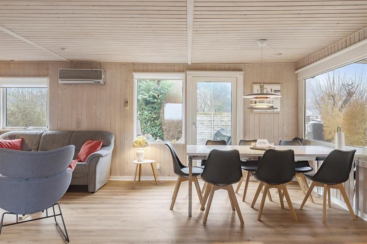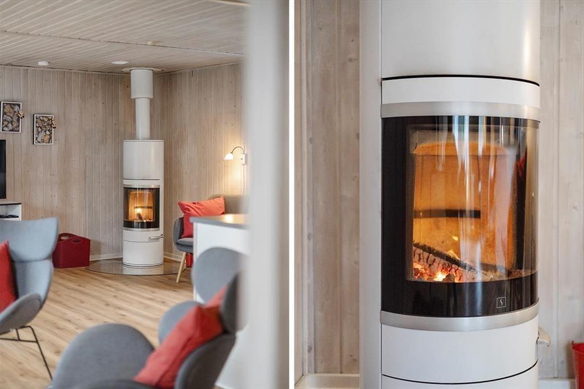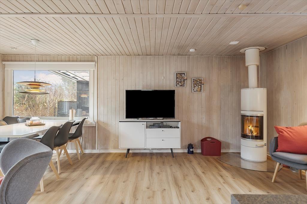 Wenn du das Ferienhaus betrittst, wirst du von einem hellen und einladenden Wohnzimmer empfangen, das den perfekten Rahmen für gemütliche Stunden mit Familie und Freunden bietet. Die offene Verbindung zur Küche erleichtert es, zusammen zu kommen, während du gemeinsam Mahlzeiten zubereitest. Der Kaminofen in der Ecke sorgt für eine warme und gemütliche Atmosphäre – ideal für kühle Abende. Vom Wohnzimmer aus hast du direkten Zugang zu einer schönen Terrasse, auf der du deinen Morgenkaffee unter freiem Himmel genießen kannst. Das Ferienhaus verfügt auch über vier schöne Schlafzimmer, die jedes für sich ausreichend Platz und Komfort für eine erholsame Nachtruhe bieten. Das Badezimmer ist funktional mit Dusche, und es gibt auch ein separates Annex, das eine Sauna und ein Spielzimmer umfasst – perfekt für Entspannung und Spaß. Das Haus ist ideal für kleine und große Gruppen und die Einrichtung strahlt eine heimelige Atmosphäre aus.