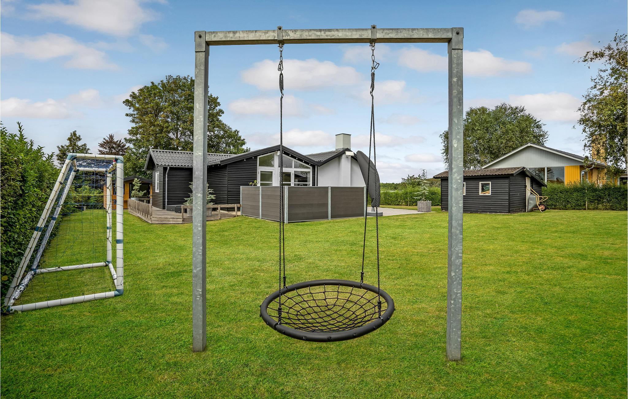 Er is zandspeelgoed en een schommel. Er is ook een sorteerstation voor metalen blikjes en gerecycled glas, en asbakken voor restjes van de barbecue en het fornuis.