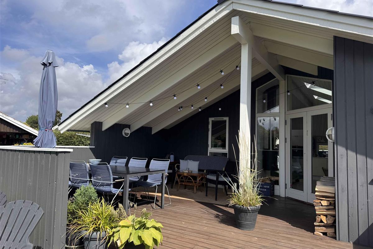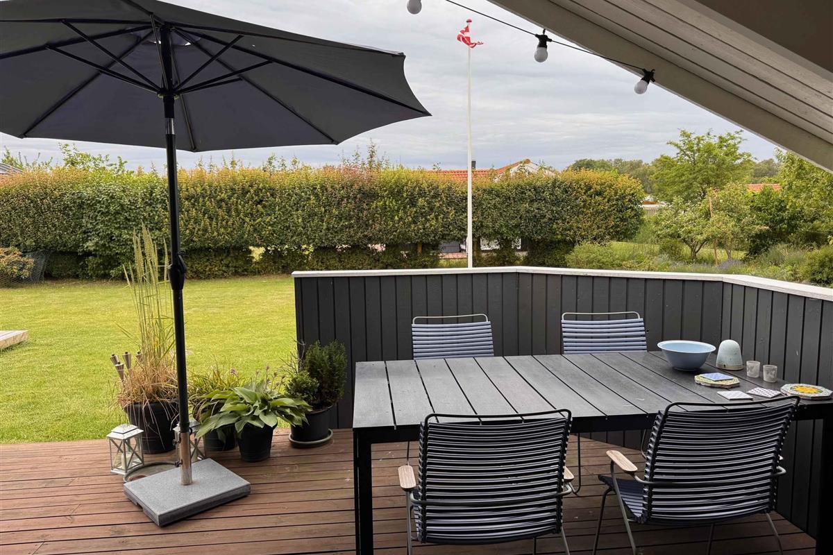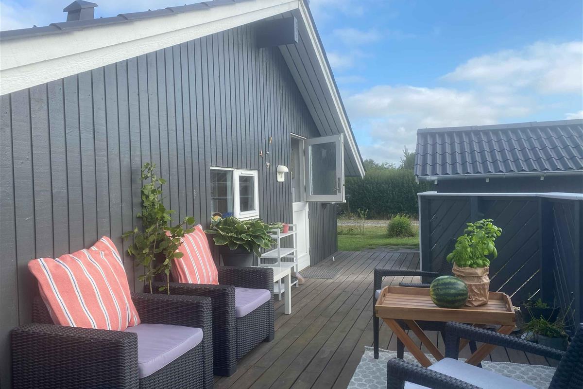 Knus zomerhuisje nabij strand en natuur in Skælskør, met moderne keuken, twee terrassen en trampoline voor buitenplezier.