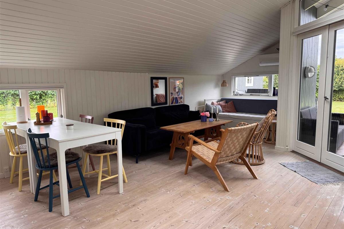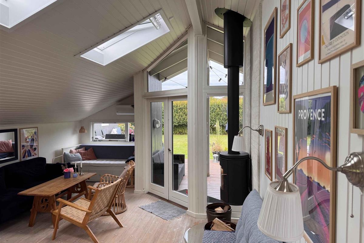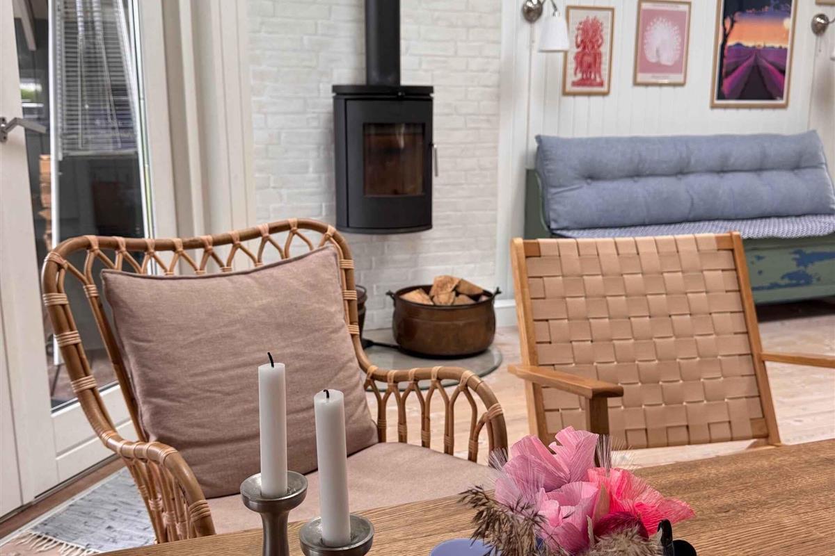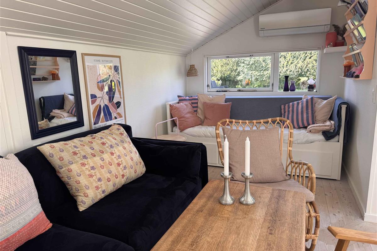 Dit kleine pareltje van een zomerhuis is warm en persoonlijk ingericht, uitnodigend tot rust, gezelligheid en kwaliteitstijd. Het belooft een week vol ontspanning, bordspellen, baden vanaf de “Koninginsteiger” en prachtige wandelingen in de natuur. In het hart van het huis ligt een lichte, uitnodigende woonkamer, verbonden met een kleiner maar functioneel keukenblok. Er is ruimte voor koken, spelen aan de eettafel en relaxen op de bank. Grote dakramen laten daglicht binnenstromen en geven een open, lichte sfeer – ongeacht het weer. Er zijn twee slaapkamers – één groot en één kleiner – beide met tweepersoonsbed. In de woonkamer staat bovendien een slaapbank voor twee extra personen. Bij het huis hoort ook een gezellig bijgebouw als tv-kamer, ideaal om favoriete content van je mobiel te streamen – of voor een ongestoorde dut op een van de twee bedden die functioneren als bank. Buiten vind je twee fijne terrassen: een ochtendterras voor de eerste kop koffie bij zonsopgang in het oosten, en een avondterras op het westen met barbecue en comfortabele meubels, perfect voor middagcocktails en diners onder de lange zomeravonden – binnen of op het overdekte terras. Voor de jongste of speelse geesten is er een ingraafbare trampoline – ideaal om buiten te spelen en bewegen. Grote grasvelden nodigen bovendien uit tot balspel en Vikingspel. Let op: Niet te huur voor commercieel gebruik.