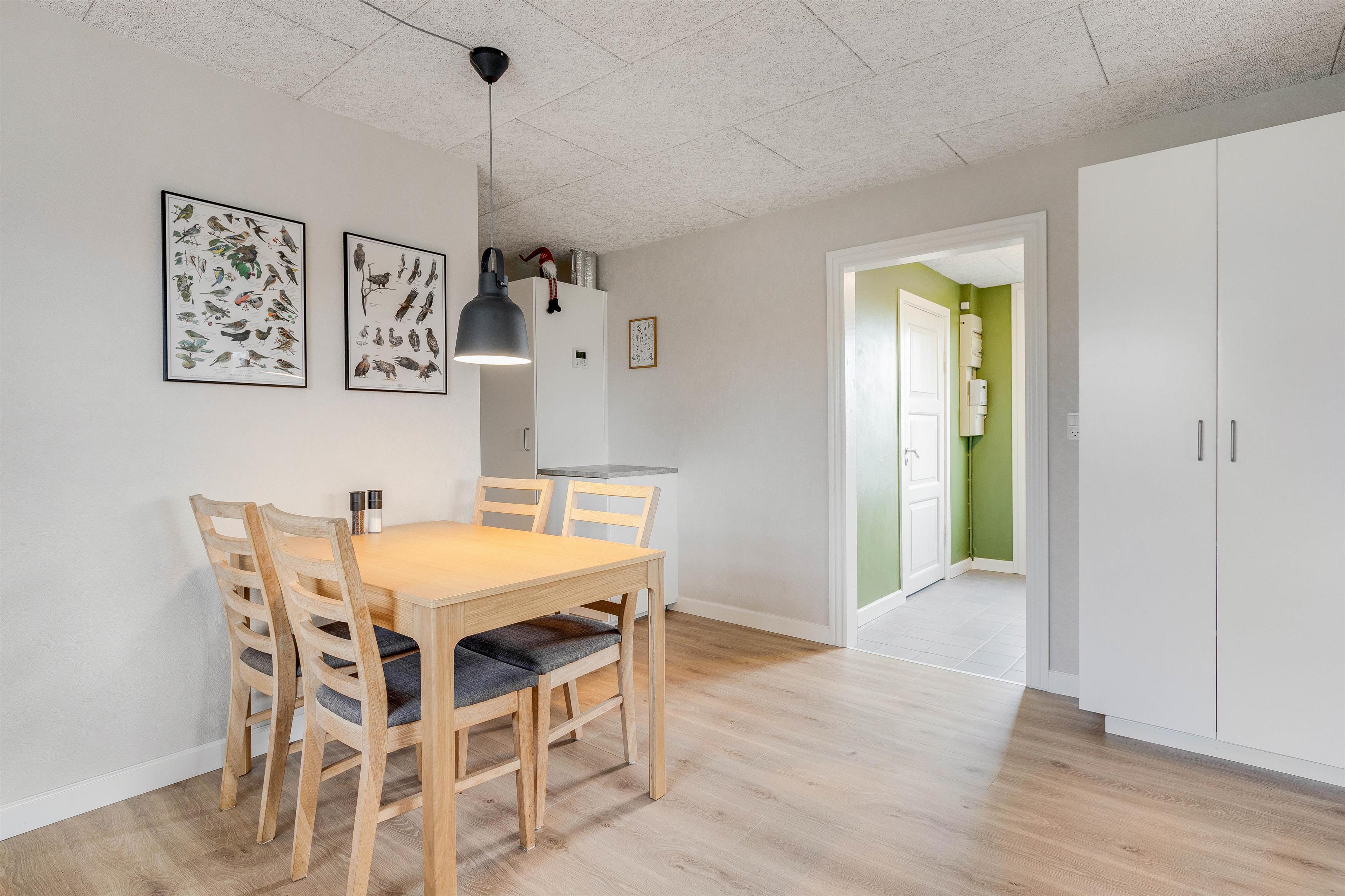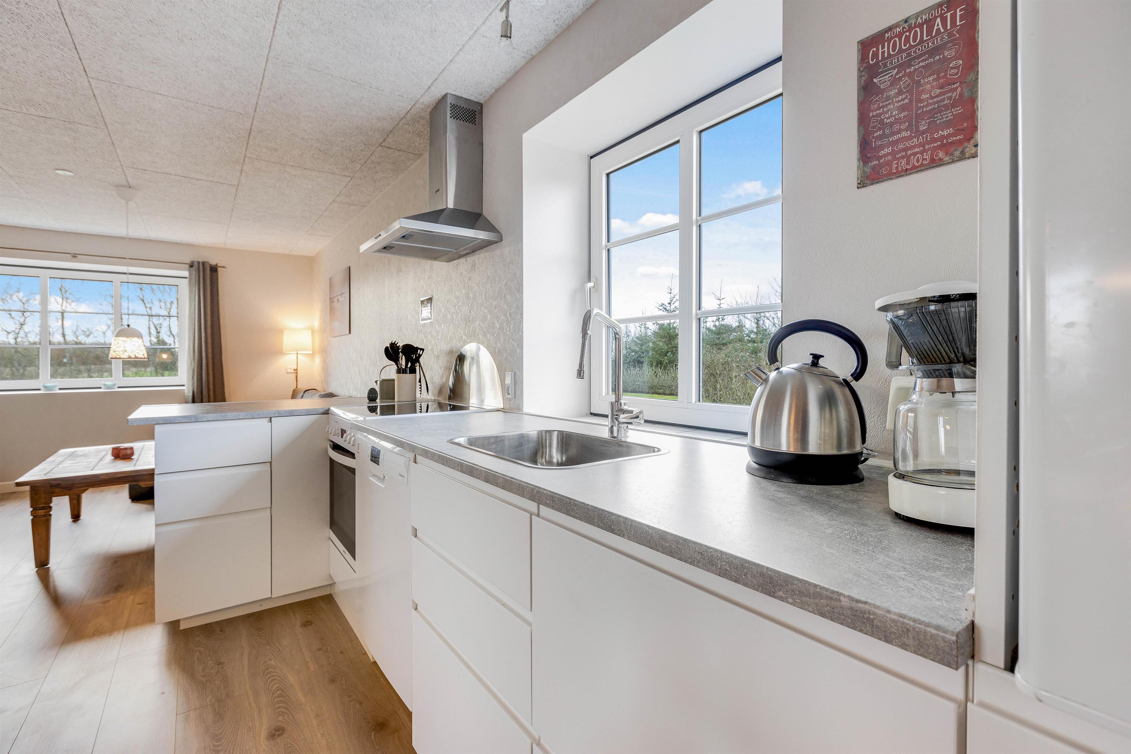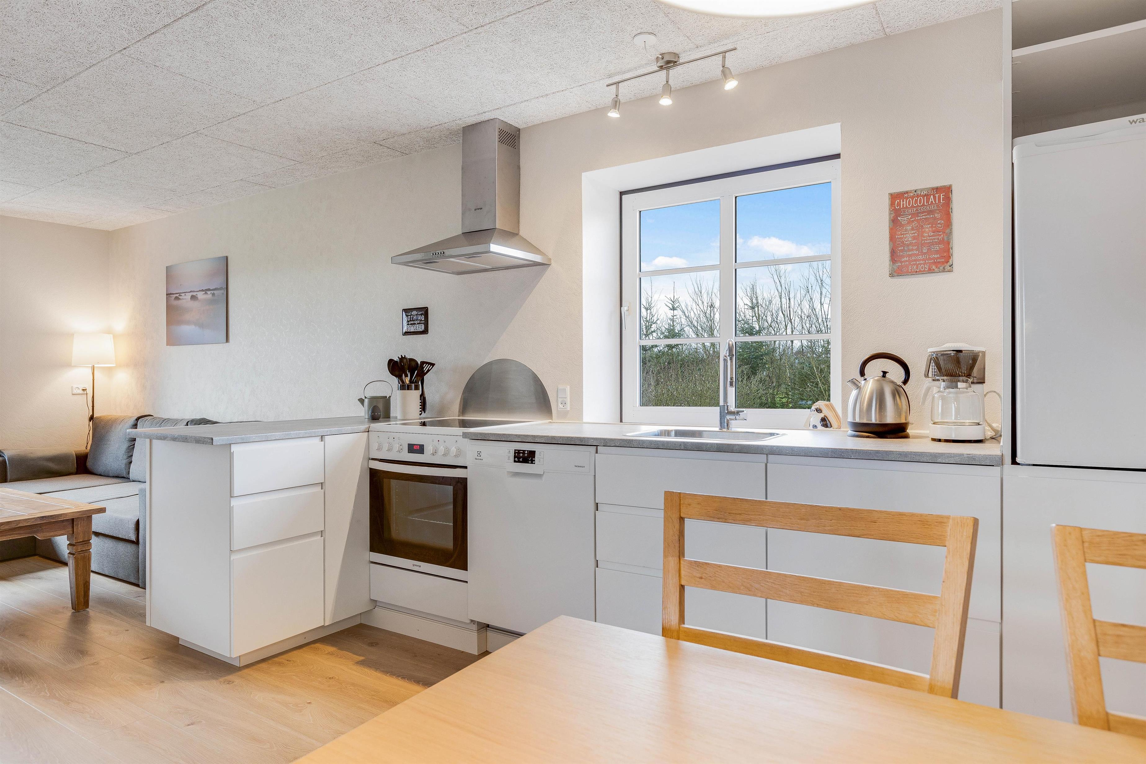 A convenient hallway leads directly to the cosy living area with its open-plan kitchen and dining table. Relax on the comfortable sofa while watching a film on the flat-screen TV, which conveniently includes Chromecast. The open-plan kitchen layout is perfect for sociable cooking evenings, equipped with everything needed to create delicious Scandinavian dishes.