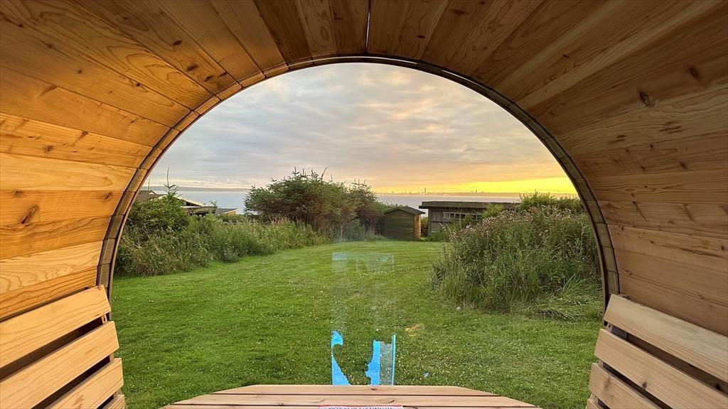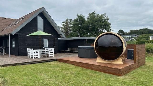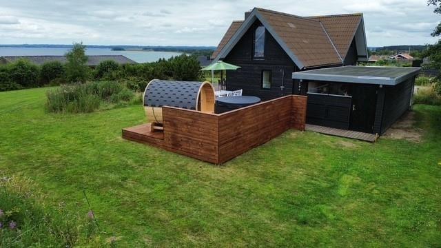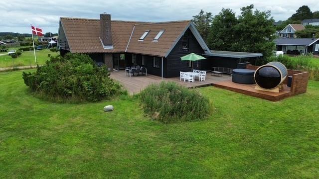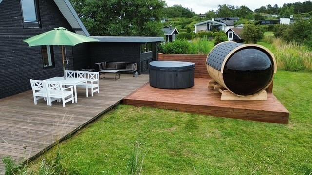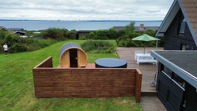 Unter freiem Himmel begrüßt dich eine schöne, überdachte Terrasse, auf der du morgens einen frischen Becher Kaffee in der Sonne und abends stimmungsvolle Grillabende genießt. Die Terrasse ist teilweise abgeschirmt und gut vor Wind geschützt - perfekt für ausgedehnte Sonnenbäder, lange Lesestunden und ein kühles Getränk in der Abendsonne. Zu erholsamen Momenten voller Wellnessflair lädt der Outdoor-Whirlpool ein. Eiskalte Erfrischungen verspricht anschließend die Kaltwasserwanne. Alternativ gönnst du dir den ein oder anderen Saunagang in der tollen Outdoor-Sauna, die mit einem Fenster in Richtung Wasser zu begeistern weiß. Dein Grundstück ist grün und einladend. Es bietet Platz zum gemeinsamen Spielen und Umhertollen. Ringsum erwarten dich friedvolle Natur und fröhliches Vogelgezwitscher. Du erfreust dich an schönster Urlaubsatmosphäre, die es dir leicht macht, die Sorgen und die Hektik des Alltags hinter dir zu lassen.