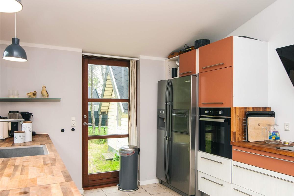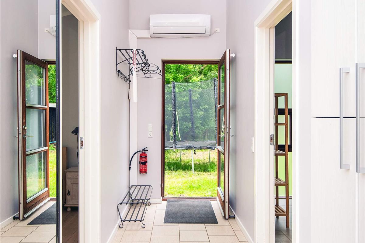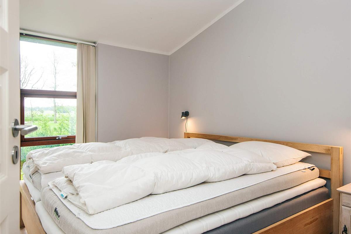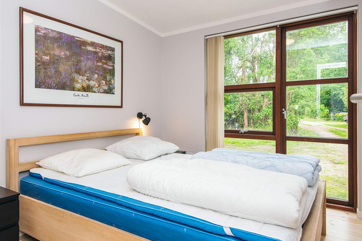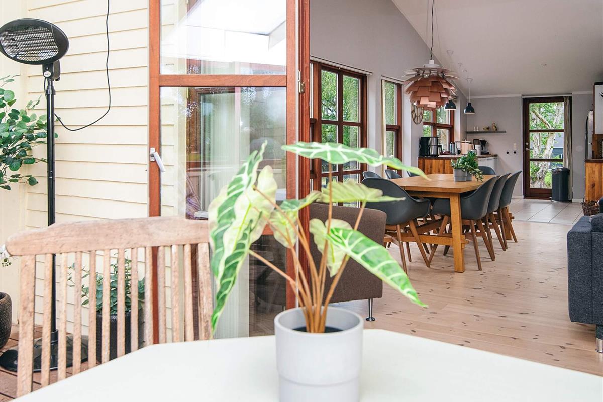 Der gesamte Fensterbereich zwischen Wohnbereich und verglaster Veranda kann geöffnet und diese somit quasi in die Wohnfläche integriert werden. Auf dem weitläufigen Naturgrundstück davor steht eine schöne Rasenfläche für Aktivitäten mit der ganzen Familie im Freien bereit. Außerdem liegt nebenan ein Annex mit zwei Schlafplätzen.