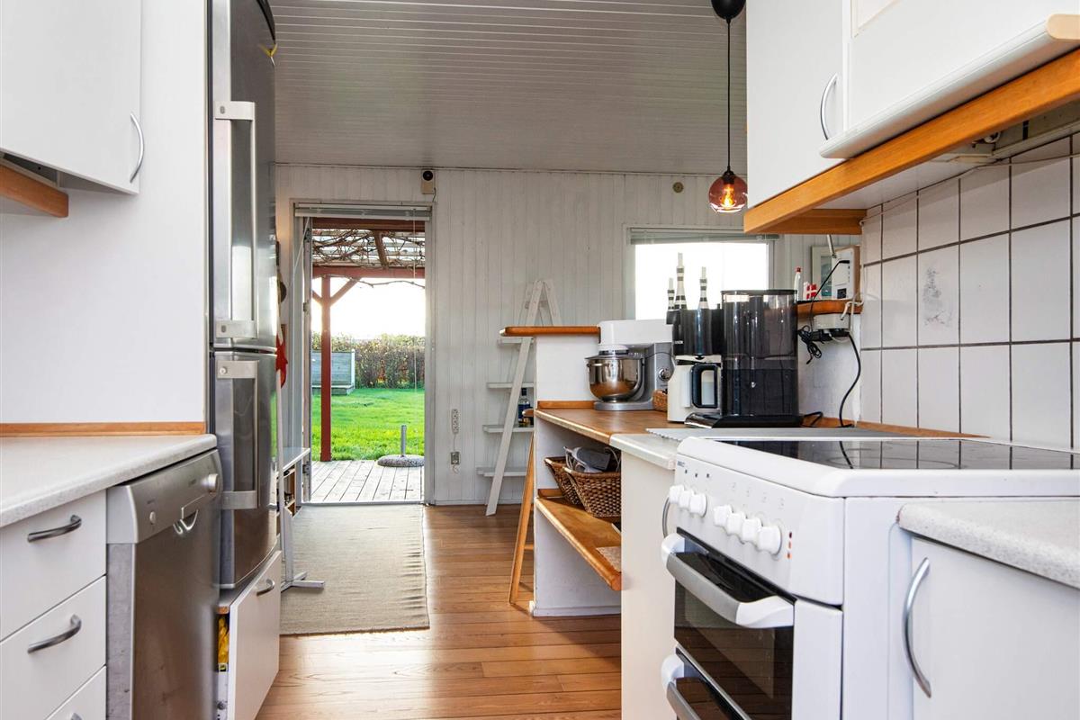 Das Haus ist gut aufgeteilt und verfügt über zwei Schlafzimmer und ein modernes Badezimmer mit Dusche und WC. Vom Flur aus betreten Sie einen großen, offenen Raum, der Küche und Essbereich vereint und nahtlos mit dem gemütlichen Wohnzimmer mit seinem wärmenden Holzofen verbunden ist. Die Atmosphäre ist hell und einladend und schafft den perfekten Ort für gemeinsame Mahlzeiten und gemütliche Abende im Haus.
